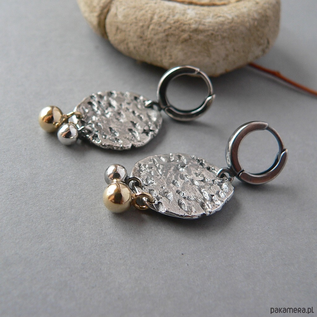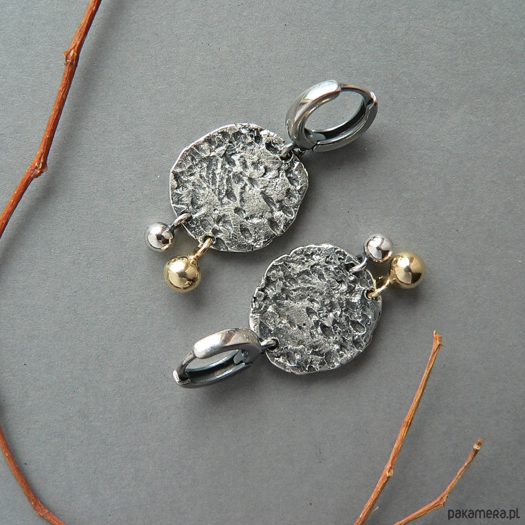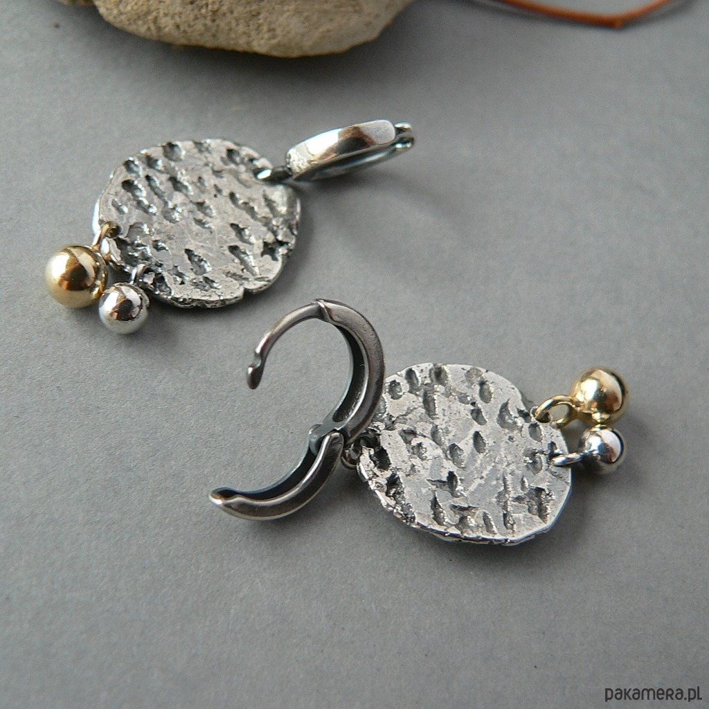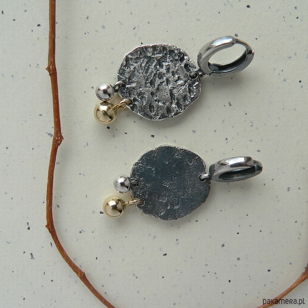 Srebrne kolczyki- surowe plasterki ze srebra formowanego ogniem w towarzystwie kulek o gładkiej, kontrastowej powierzchni, mocno polerowanej. Srebro oksydowane, większe kulki pozłacane. Wymiary plasterka 1,7/1,6 cm, elementy nie są identyczne. Średnica kulek 4 i 5 mm Długość całkowita kolczyka 3,5 cm