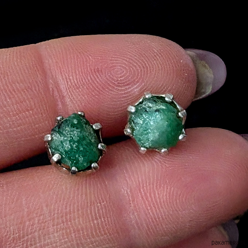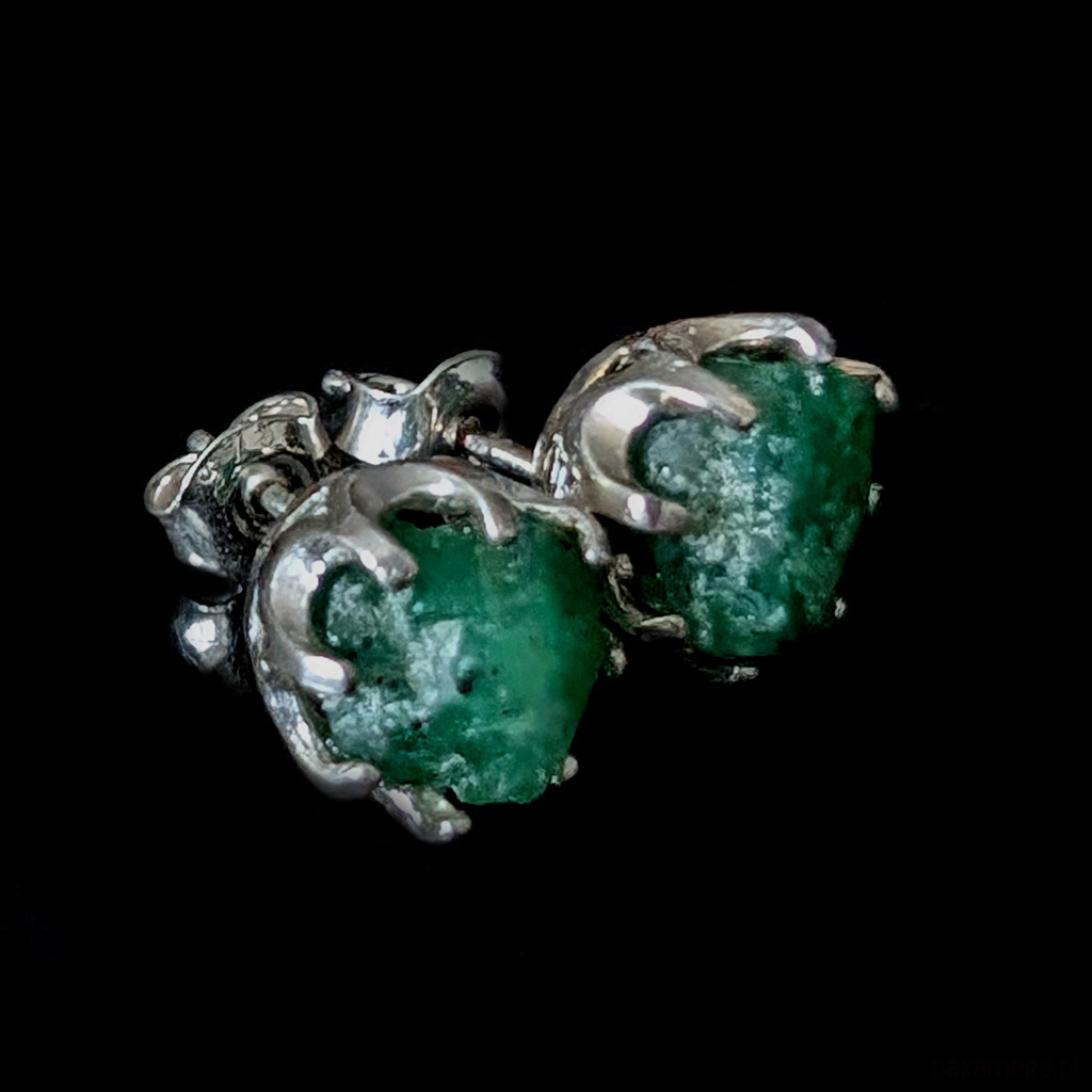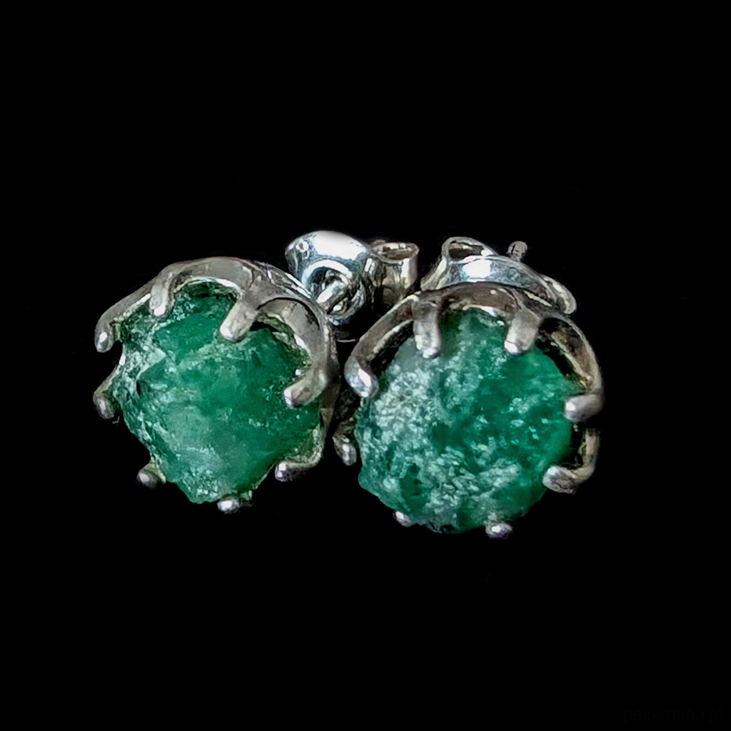 Surowe kolczyki wykonane ze srebra próby 925.W prostą cargę oprawione zostały naturalne, surowe szmaragdy. Wymiary oprawy nieregularnych bryłek szmaradgu ok. 10 x 9 mm. Waga jednego kolczyka 1,3 g. Kolczyki zostaną zapakowane w ozdobne pudełeczko.