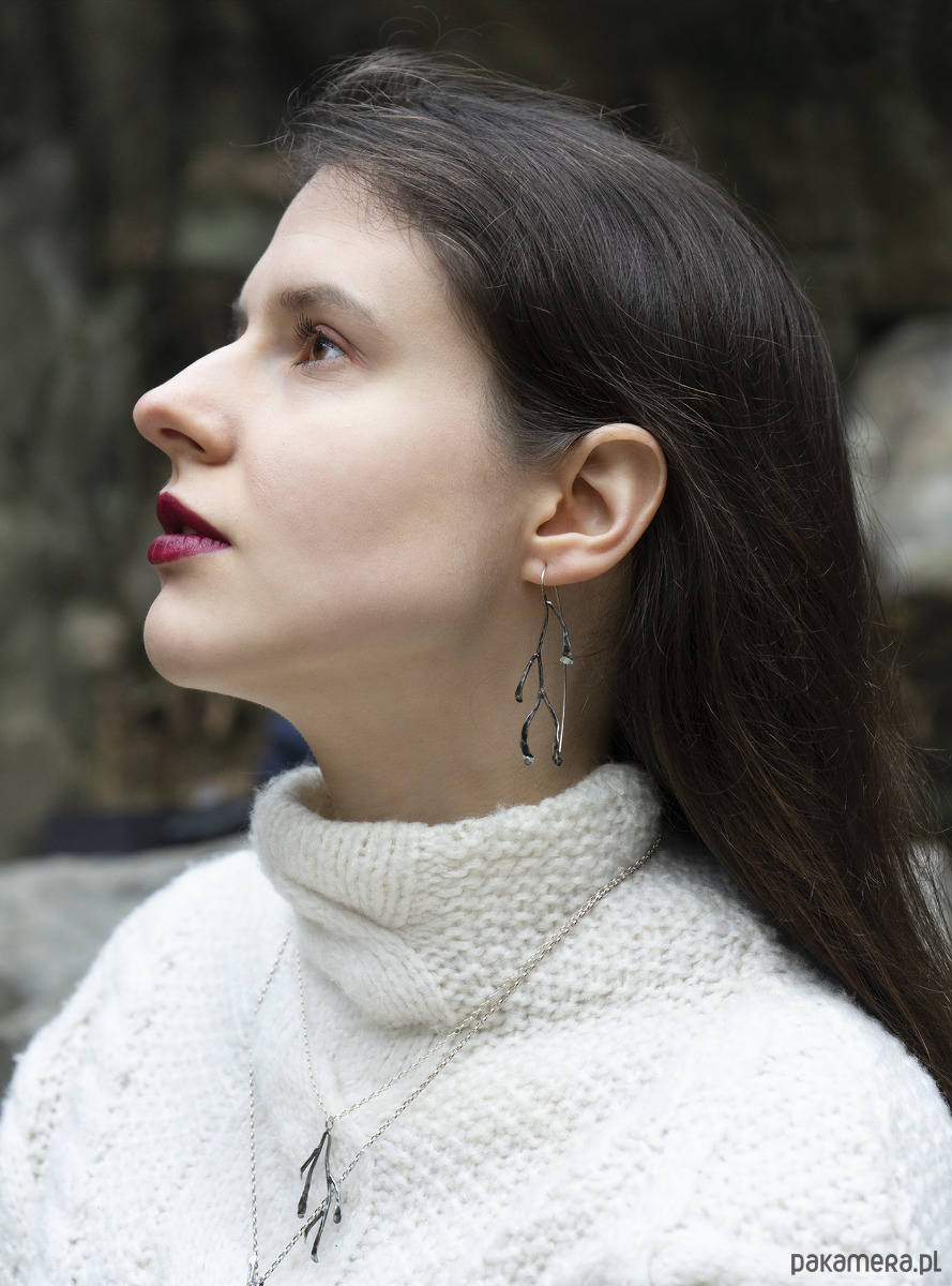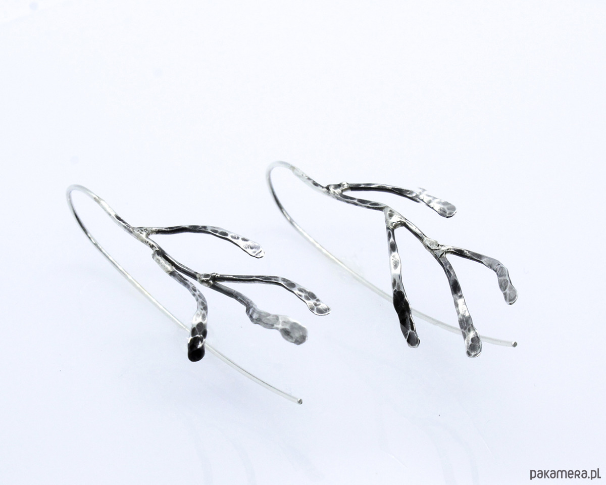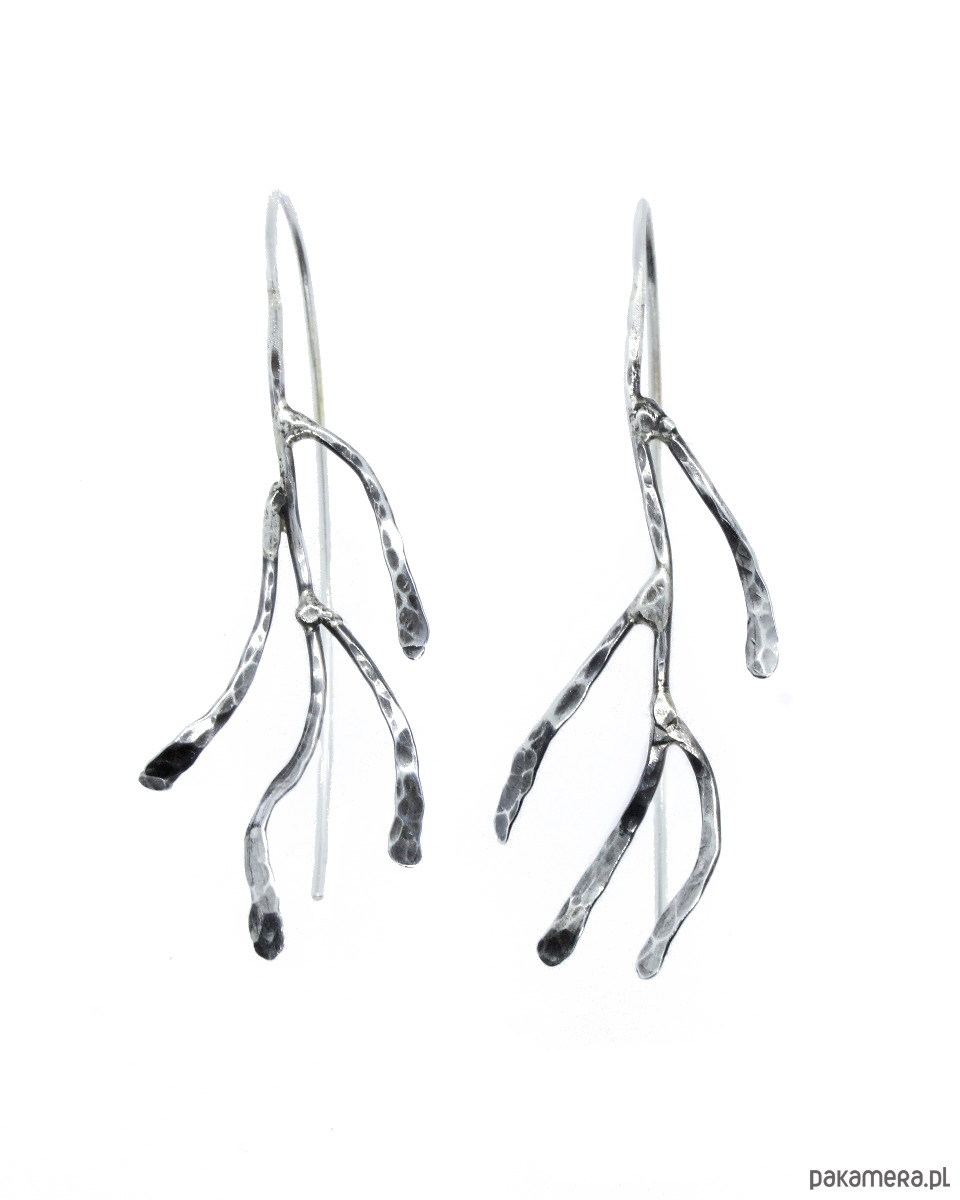 Delikatne, acz efektowne kolczyki gałązki. Ręcznie lutowane i młotkowane. Podkreślą eleganckie upięcie włosów. Doskonały prezent dla romantyczki. Wykończenie: polerowane srebro.