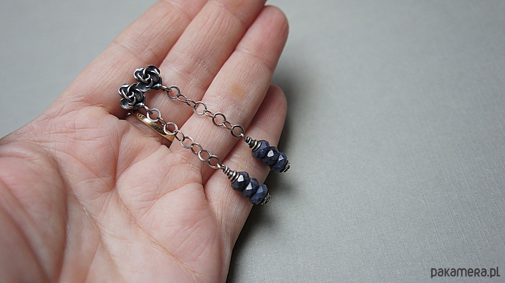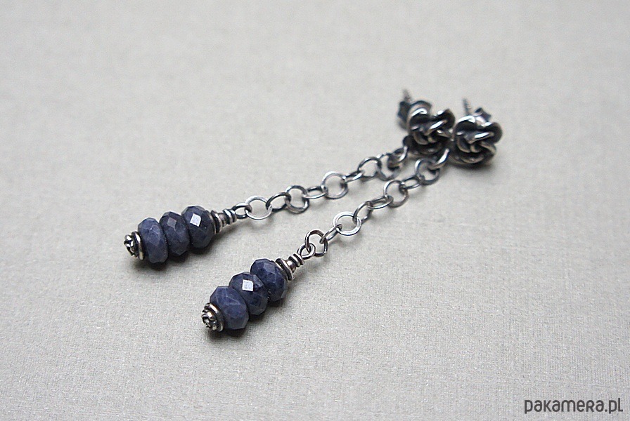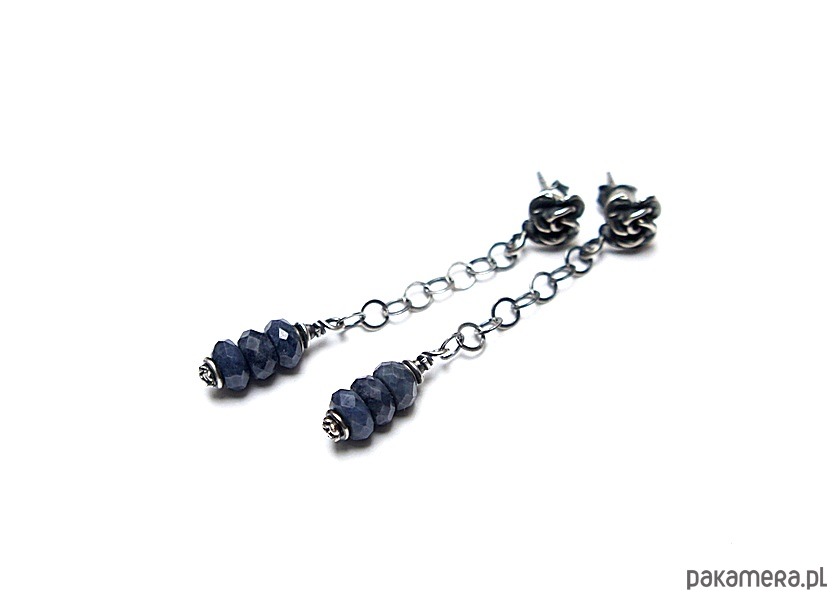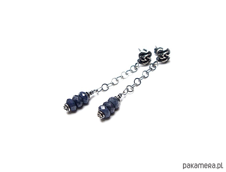 Kolczyki wykonane ze srebra [pr.925] w połączeniu z fasetowanymi oponkami szafirów [7mm] . Srebro oksydowane i przetarte. Całkowita długość kolczyków 5,9cm. Biżuteria ozdobnie zapakowana.