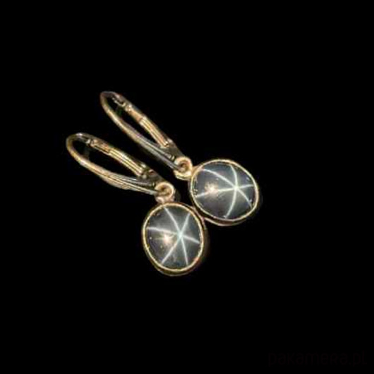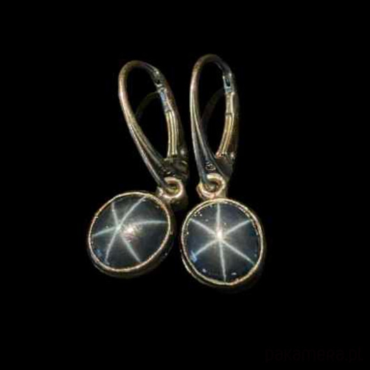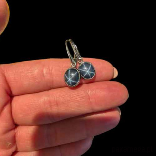 Okazałe kolczyki z przepięknymi szafirami gwiaździstymi w klasycznej oprawie srebra próby 925. Srebro oksydowane. Szafir z bardzo wyraźną gwiazdą sześcioramienną (zjawrisko asteryzmu widoczne w nierozproszonym świetle,porusza się wraz ze źródłem światła), kamień dyfuzjowany. Wymiary oprawy kolczyków 12 x 10 mm, długość max. 30 mm, waga jendego kolczyka 2 gramy. Kolczyki zapakowane w ozdobne pudełeczko, polecam do kompletu piękny pierścień i wisior.