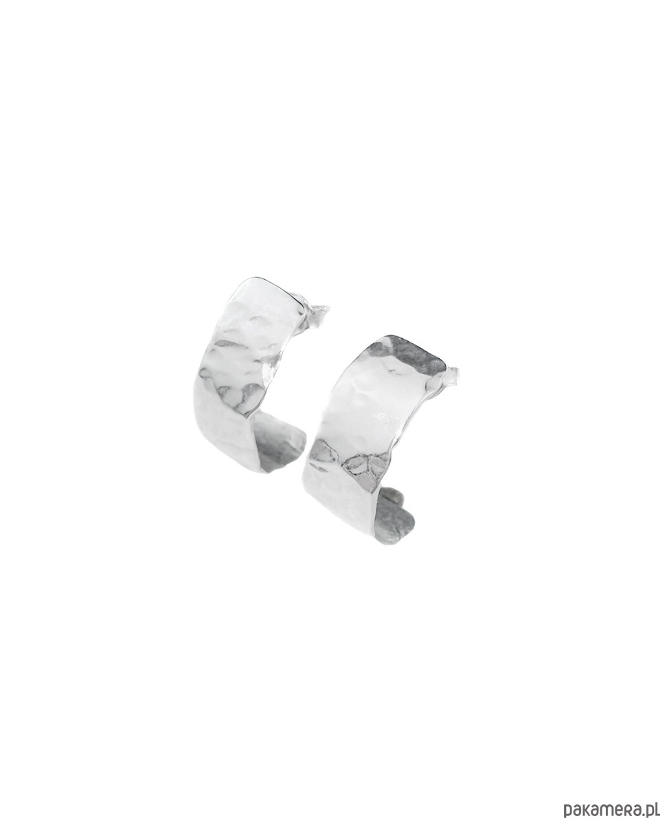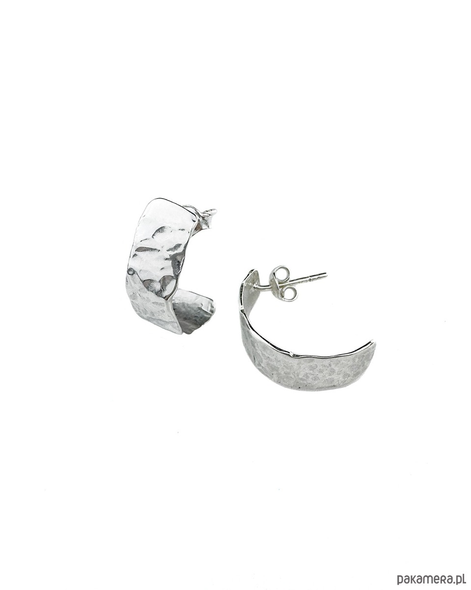 Kolczyki, sztyfty lekkie, delikatnie zagięte. Dzięki młotkowanej fakturze ich tafla odbija światło. Wykonane zostały od podstaw ręcznie ze srebra 925.