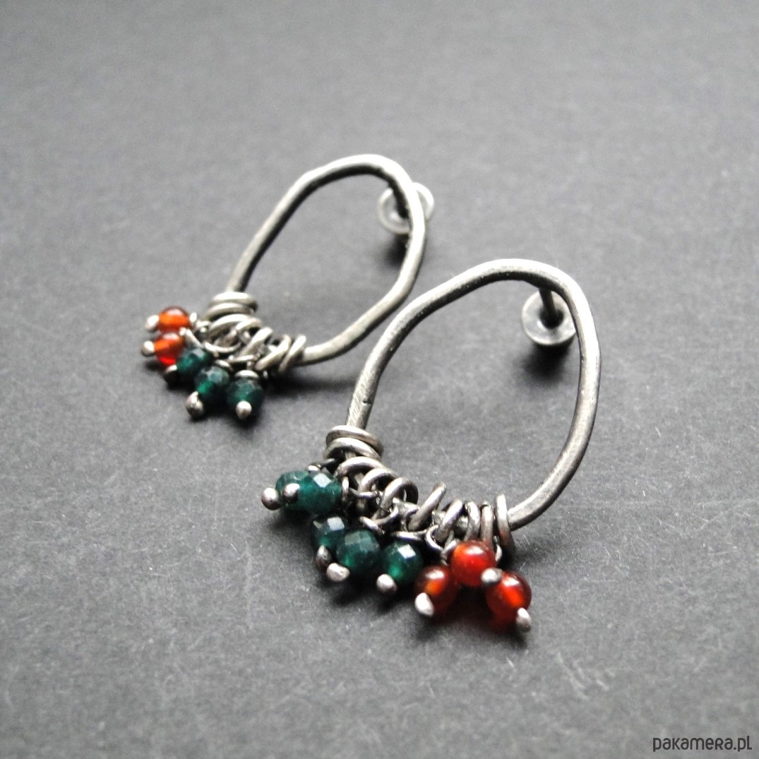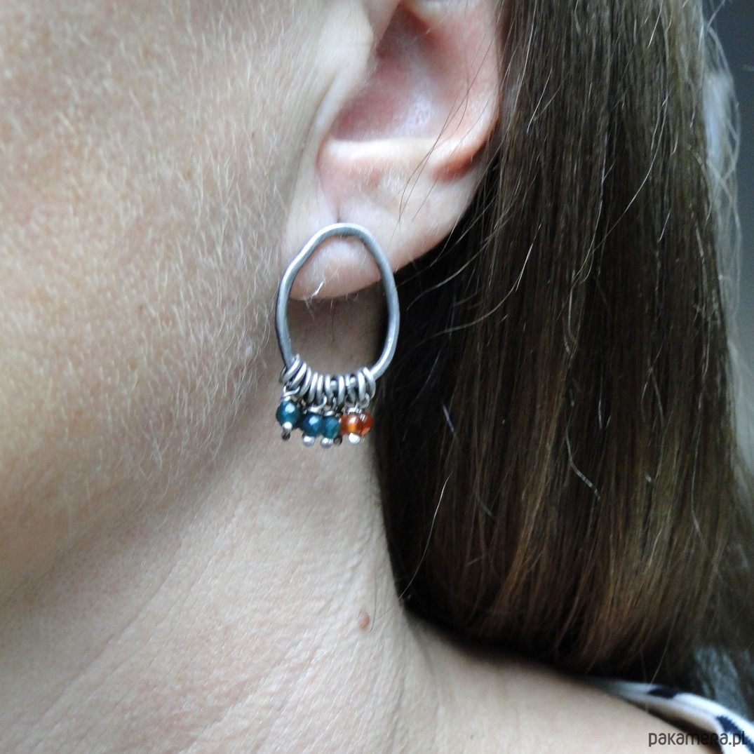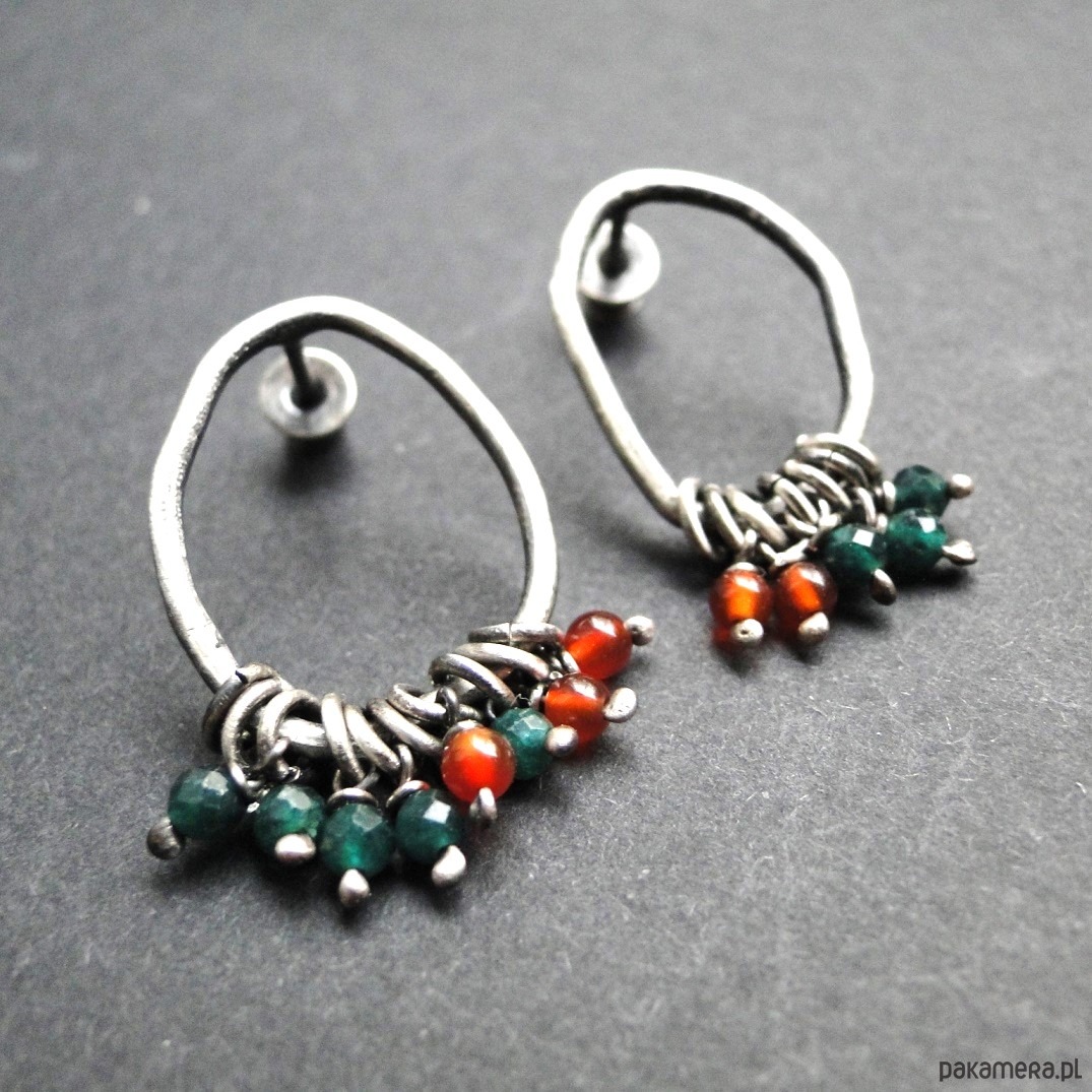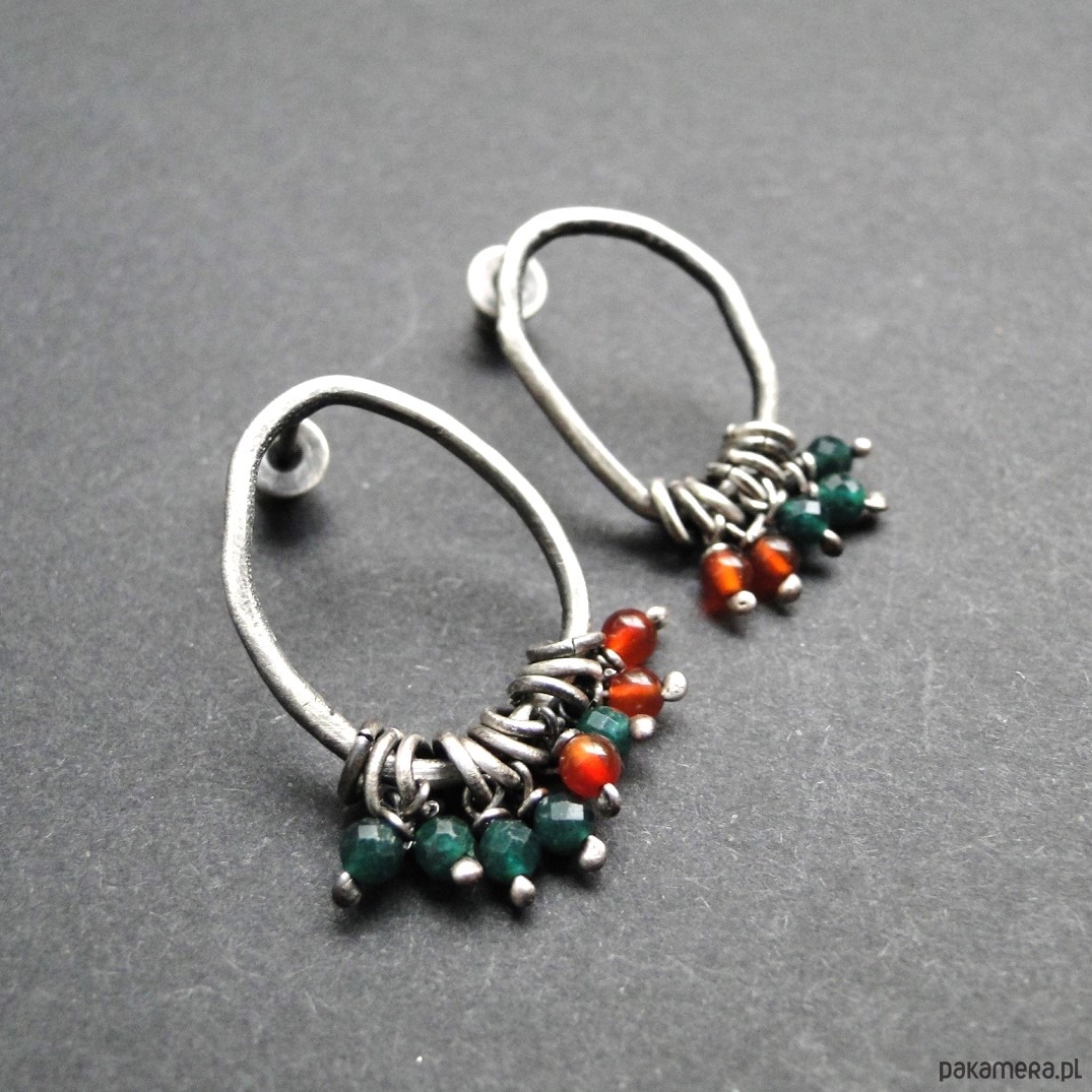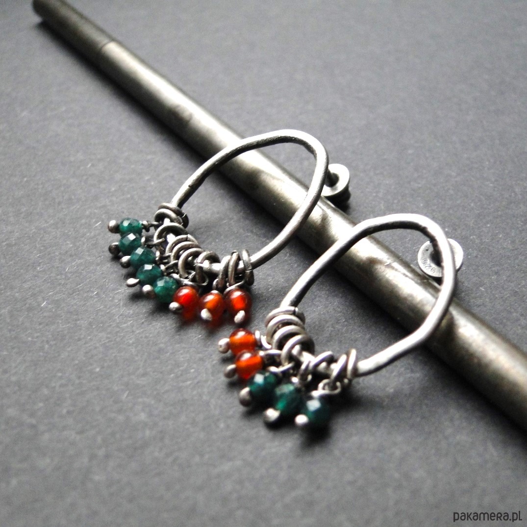 Surowe kolczyki w najmodniejszym kształcie. Kolor morski,tzw deep teal,typowany przez Pantone na kolor roku 2026. Srebro 925,oksydowane i szorowane. Kamienie: naturalne szmaragdy i karneole śr. 3 mm . Sztyfty nieregularne,ręcznie wykonane.Wielkość kolczyków: 3 oraz 2,8 cm. Nie moczyć w wodzie.