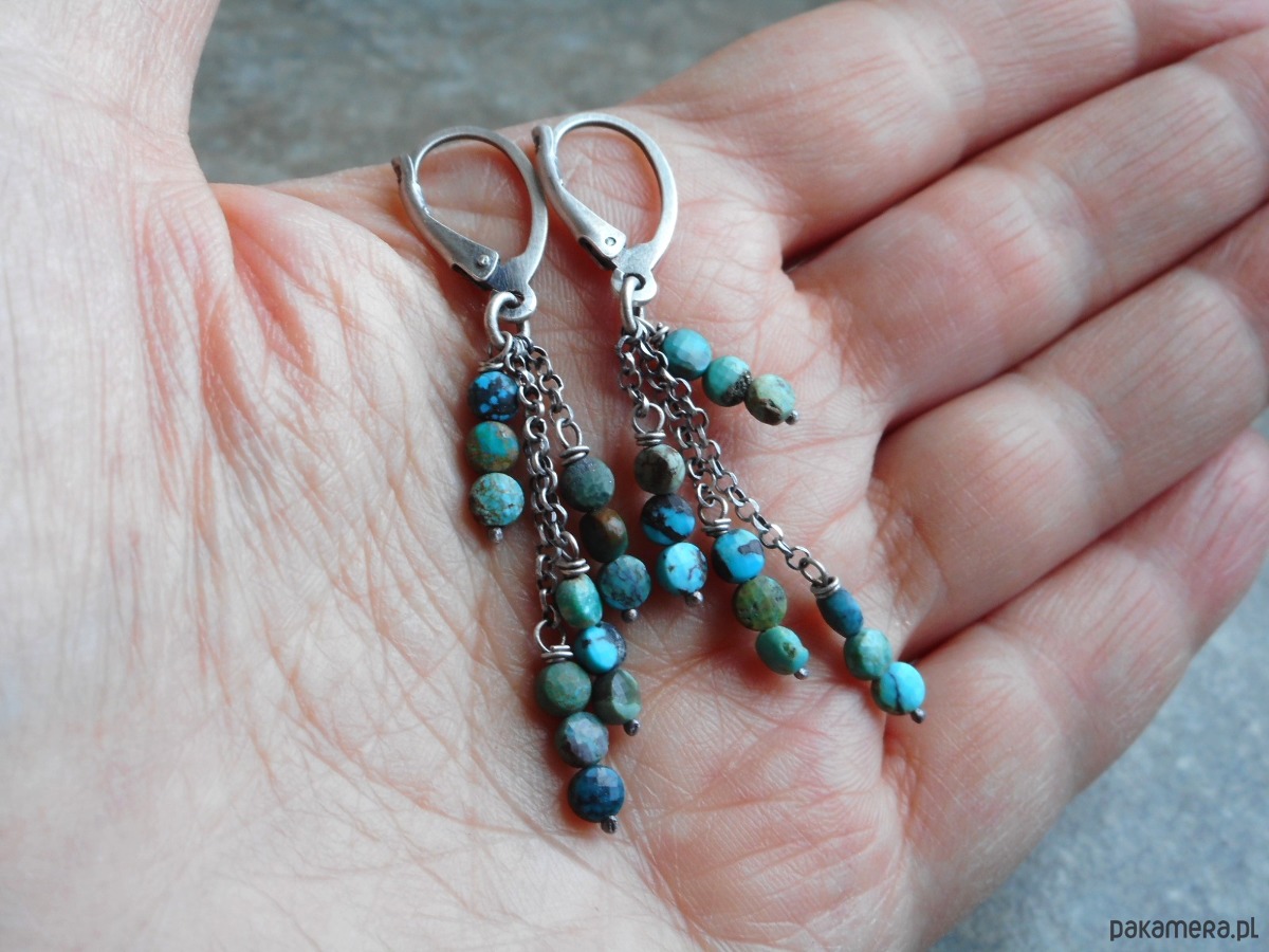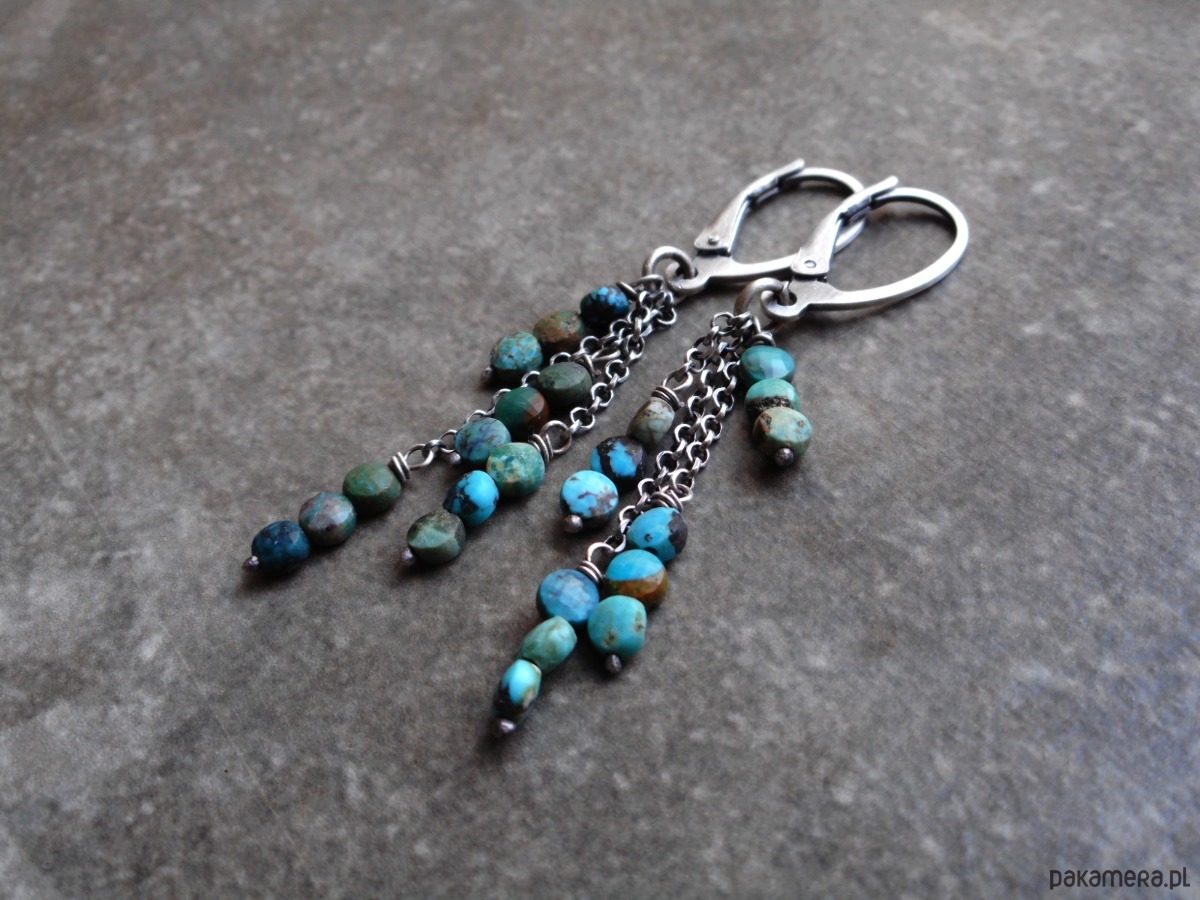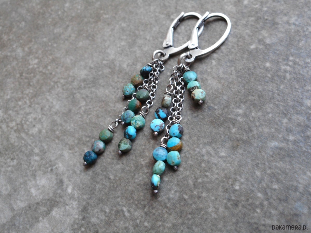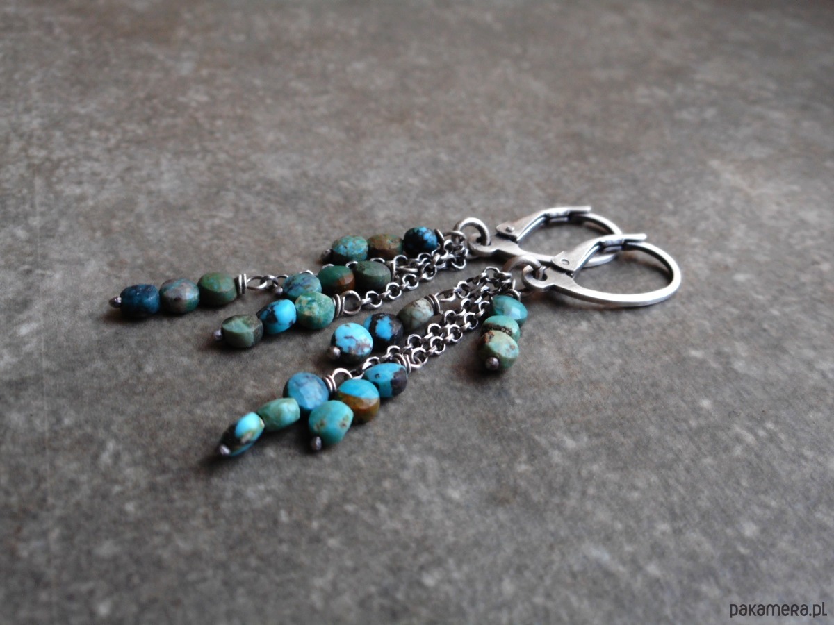 Stylowe kolczyki z kamieni naturalnych i szlachetnego srebra, wygodne, wiszące, w formie gałązek ozdobionych szeregiem turkusowych pastylek.
