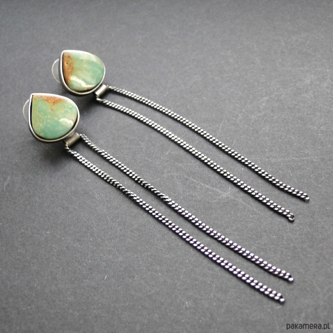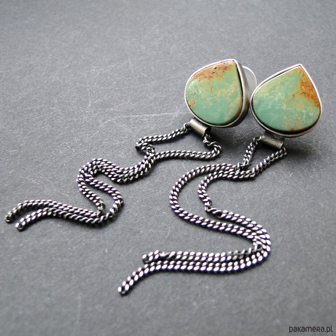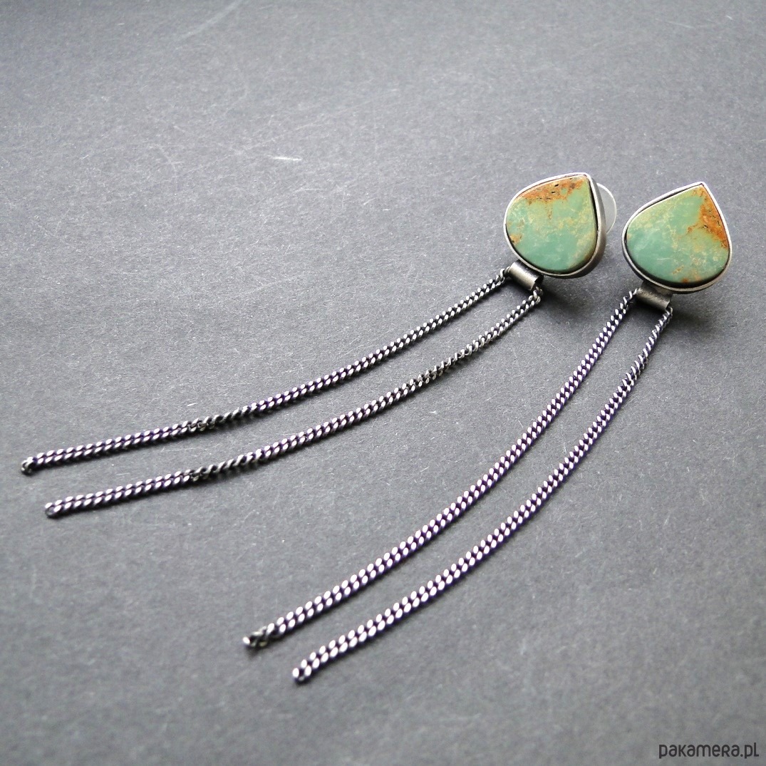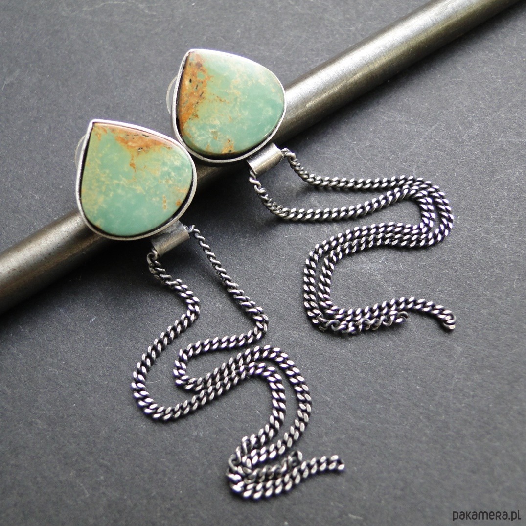 Surowe kolczyki w pojedynczym egzemplarzu. Srebro 930,oksydowane i szorowane. Piękne naturalne turkusy gładkie o wym. 15x15 mm. Długie chwosty ze srebra. Proste ramki na kamień, pełne z tyłu. Zapięcia na sztyfty. Zatyczki silikonowe ze srebrnym wkładem, dobrze trzymają kolczyk przy uchu.