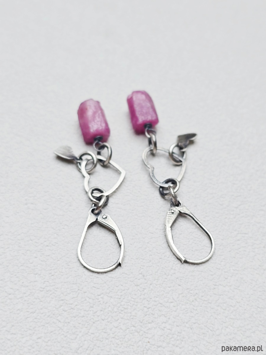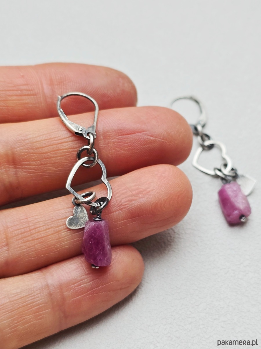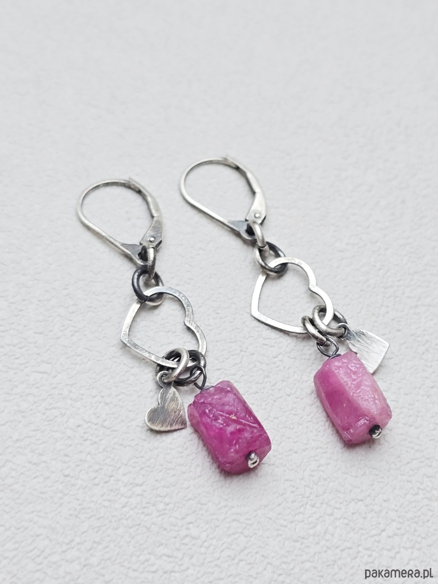 Wyjątkowe serduszkowe kolczyki z surowymi, różowymi rubinami.