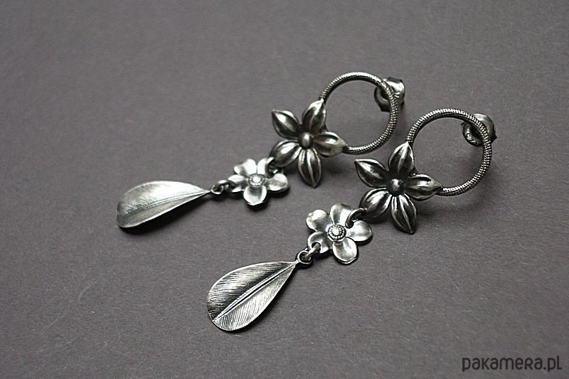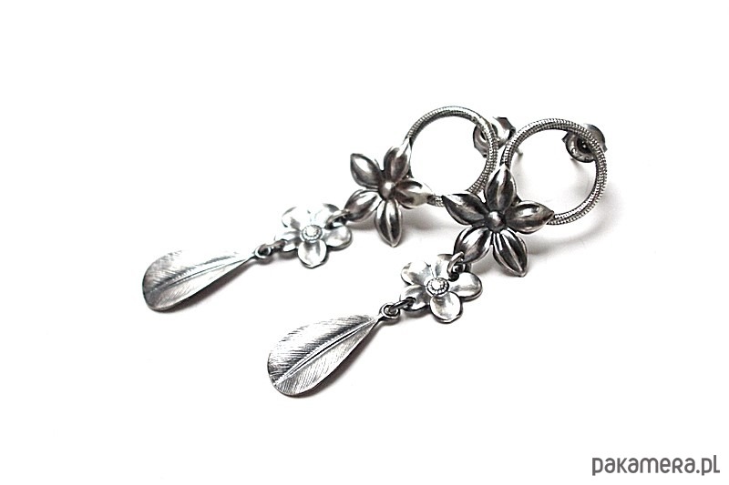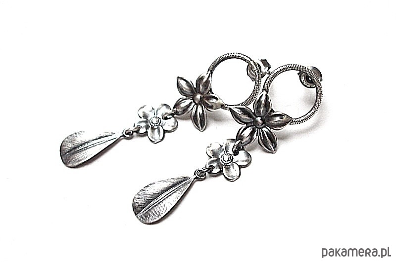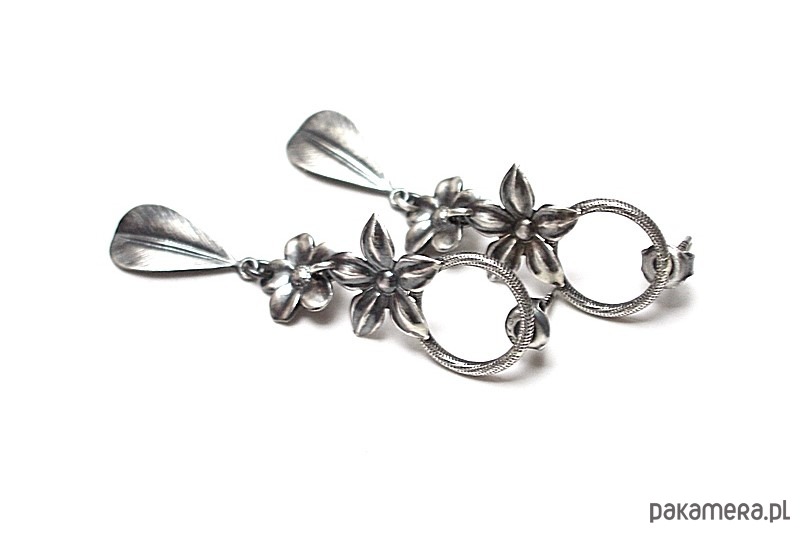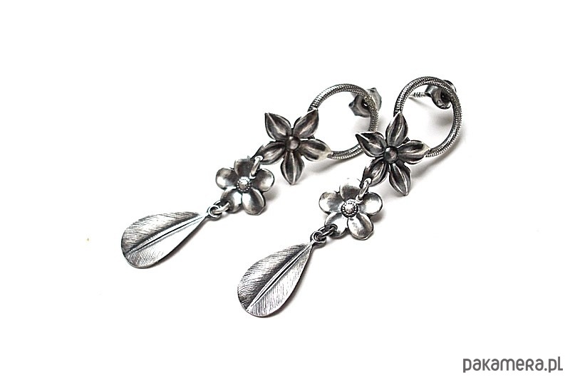 Kolczyki wykonane w całości ze srebra [pr. 925] w połączeniu z kwiatuszkami [ 14mm i 10mm] oraz srebrnymi listkami . . Srebro oksydowane i przetarte. Całkowita długość kolczyków 5,3cm. Biżuteria ozdobnie zapakowana.