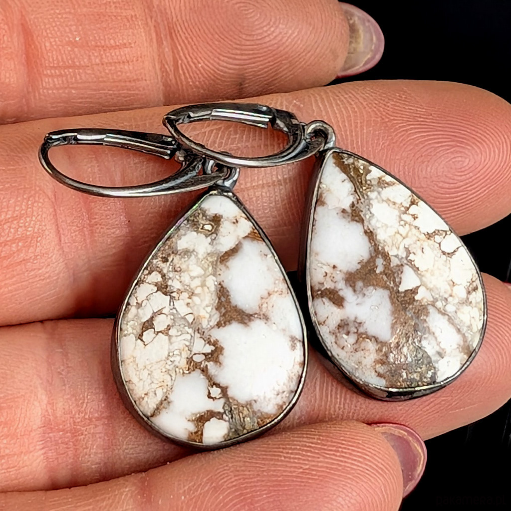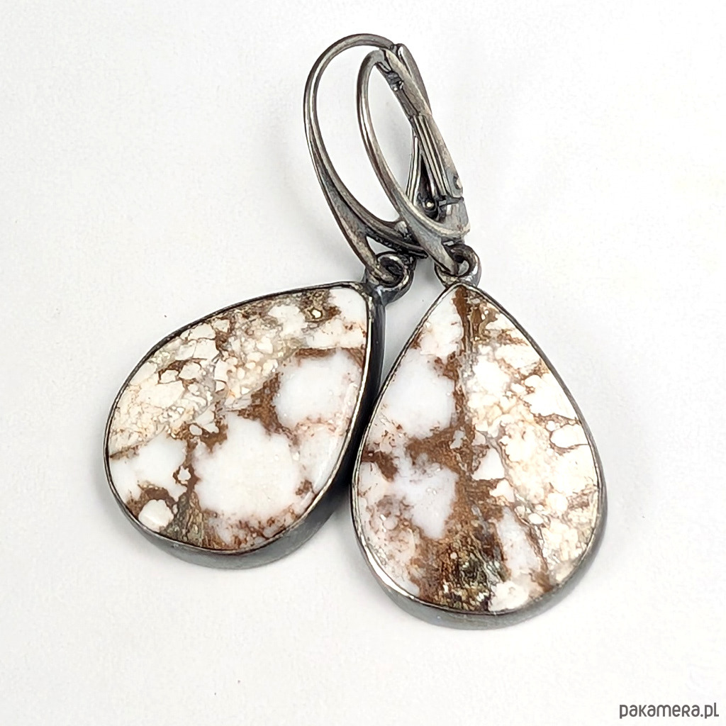 Kolczyki wykonane z oksydowanego srebra próby 925 oraz jaspisów wild horse. Wymiary oprawy kamieni 23 x 16 mm, długość z biglami 40 mm. Waga 4,6 g.Kolczyki zostaną wysłane w ozdobnym pudełeczku.