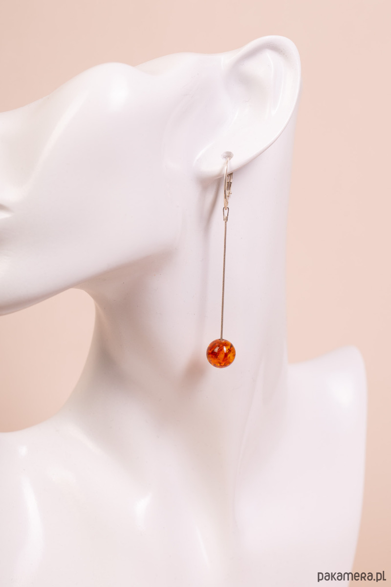 Srebro próby 925 · bursztyn bałtycki (koniakowy) · średnica kulki: 1 cm · długość całkowita: 7 cm · waga pary: 3 g · zapięcie: bigiel angielski · ręczna praca autorska