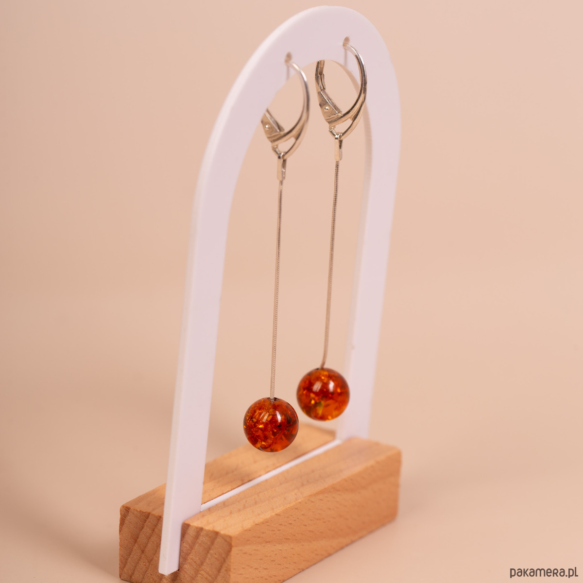 Eleganckie, wiszące kolczyki wykonane ze srebra próby 925, łączące klasyczną formę z nowoczesną lekkością. Głównym elementem projektu są idealnie gładkie kulki naturalnego bursztynu bałtyckiego o średnicy 1 cm, w głębokim, koniakowym odcieniu. Bursztyny zostały zawieszone na subtelnych, srebrnych łańcuszkach, co nadaje biżuterii płynności i sprawia, że efektownie pracują przy każdym ruchu głowy.