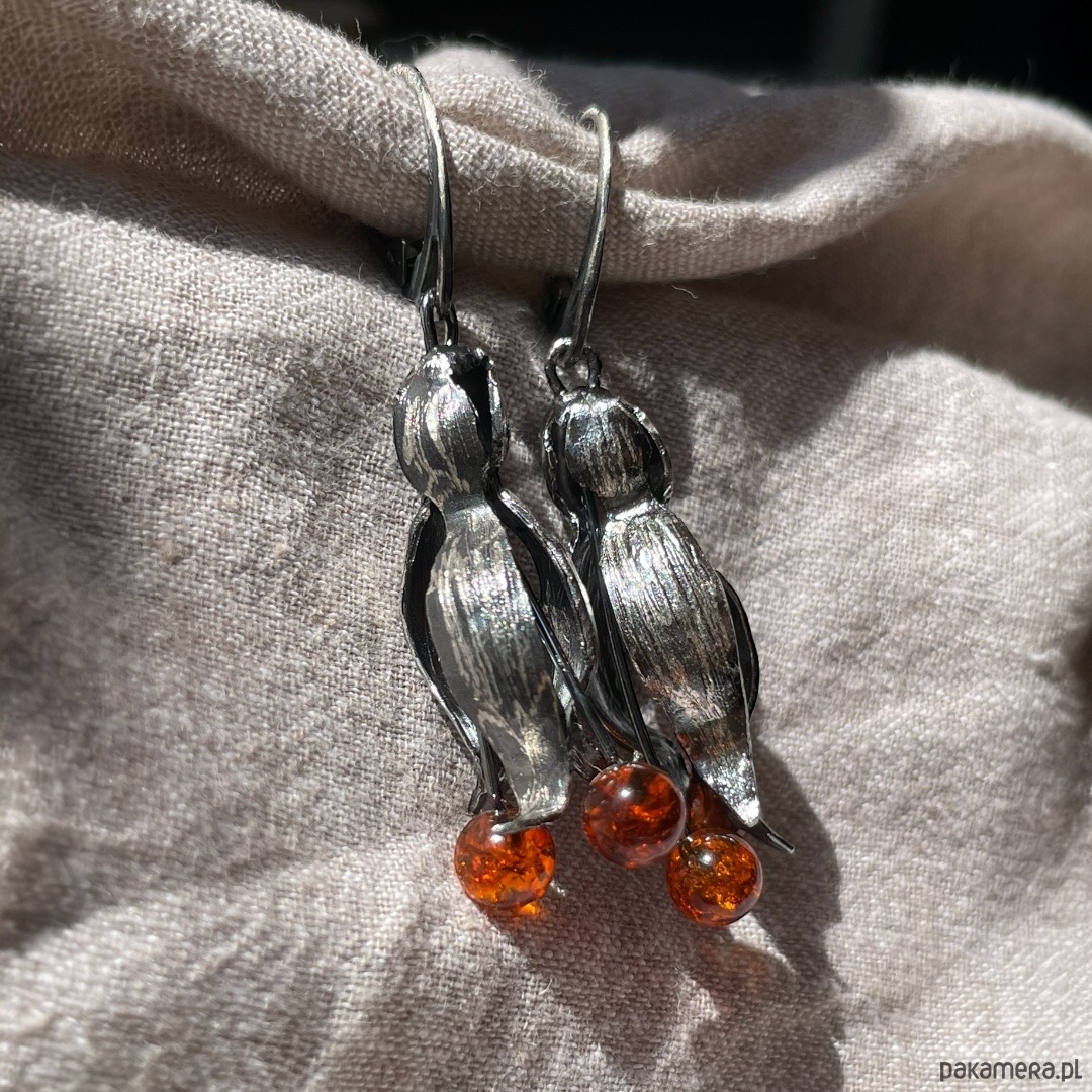 Unikatowe kolczyki wykonane ręcznie ze srebra próby 925, wykończone techniką oksydowania, która podkreśla ich charakter i artystyczną formę. Zakończone subtelnymi bursztynowymi kuleczkami, które dodają całości ciepła i naturalnego uroku.