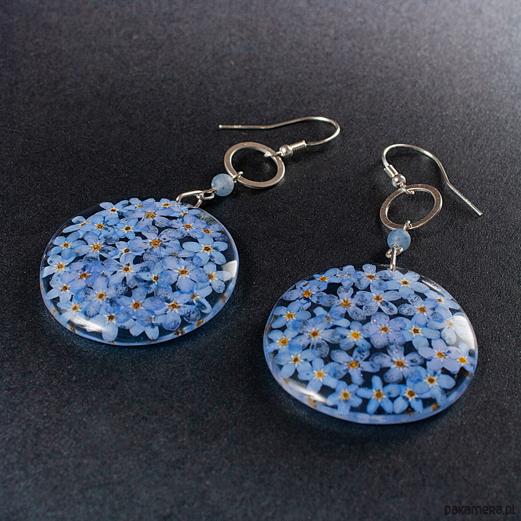 Kolczyki z kolekcji ŁĄKA z awenturynem, srebrnymi ażurami i medalionem z delikatnymi niezapominajkami. Długość kolczyków z biglem - 7,50 cm, bez bigla 6 cm. Element ozdobny z żywicy - średnica 4 cm. Elementy metalowe - srebro 925. Kolczyki wykonane ręcznie według własnego projektu w pracowni Anillo. Biżuterię przesyłamy w eleganckim kartoniku.