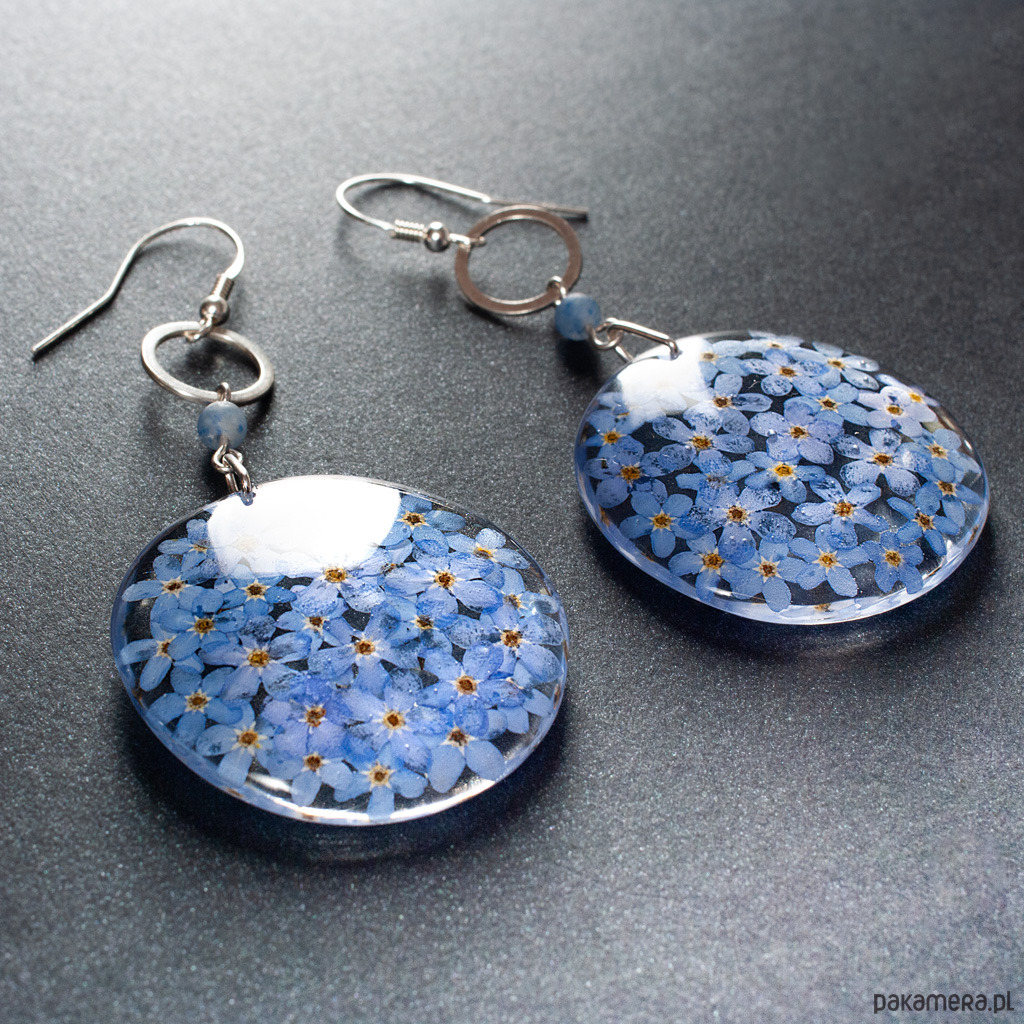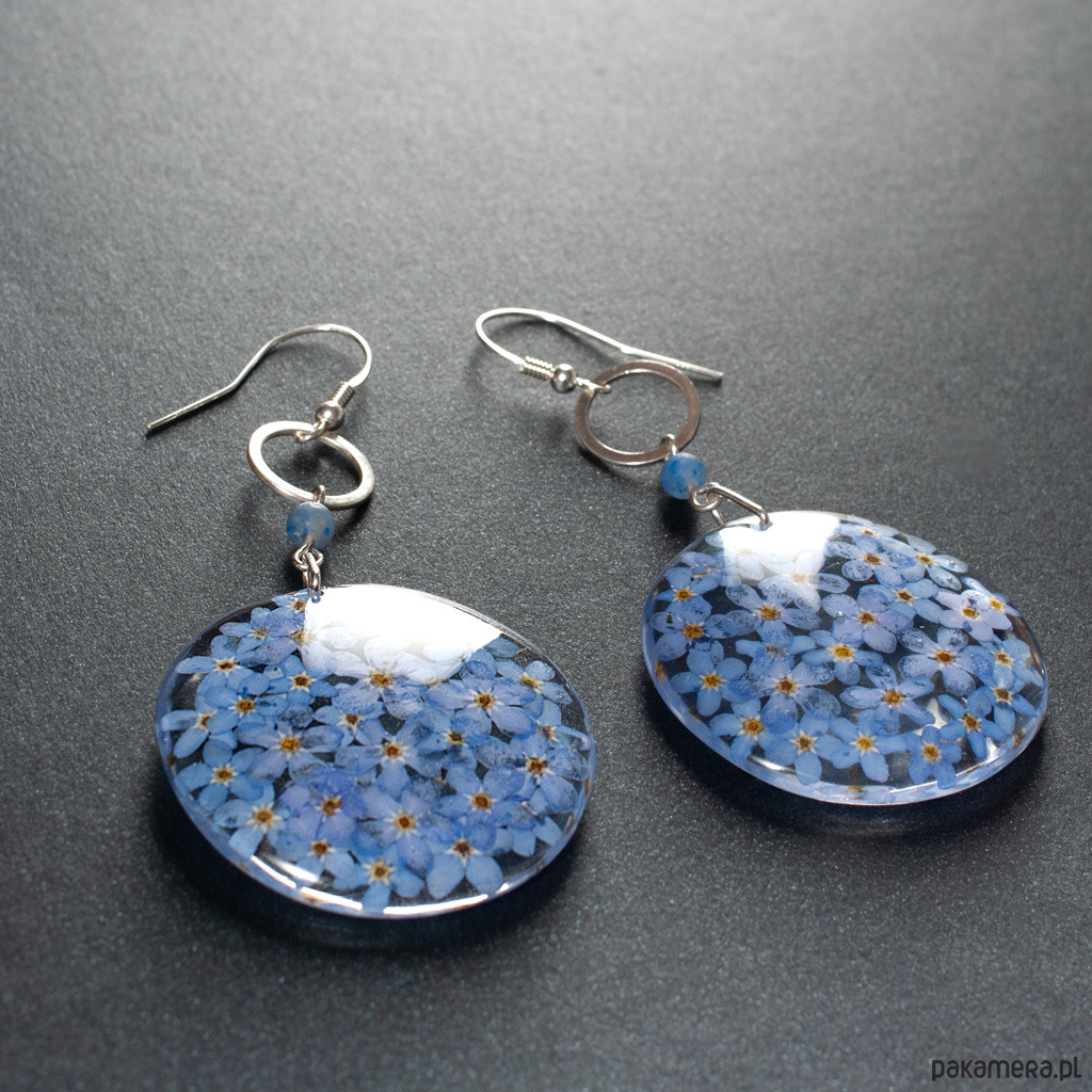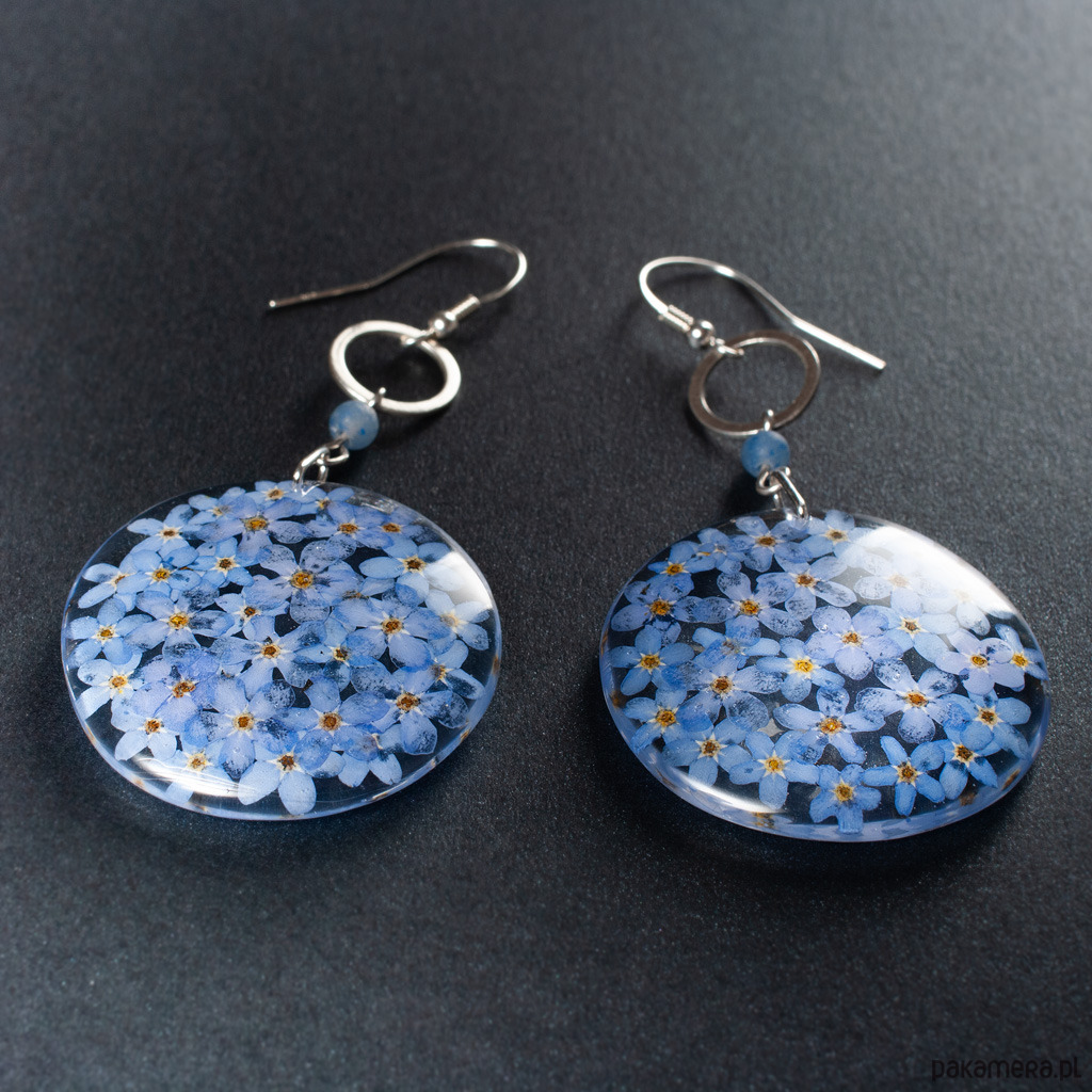 Kolczyki z kolekcji ŁĄKA z awenturynem, srebrnymi ażurami i medalionem z delikatnymi niezapominajkami. Długość kolczyków z biglem - 7,50 cm, bez bigla 6 cm. Element ozdobny z żywicy - średnica 4 cm. Elementy metalowe - srebro 925. Kolczyki wykonane ręcznie według własnego projektu w pracowni Anillo. Biżuterię przesyłamy w eleganckim kartoniku.