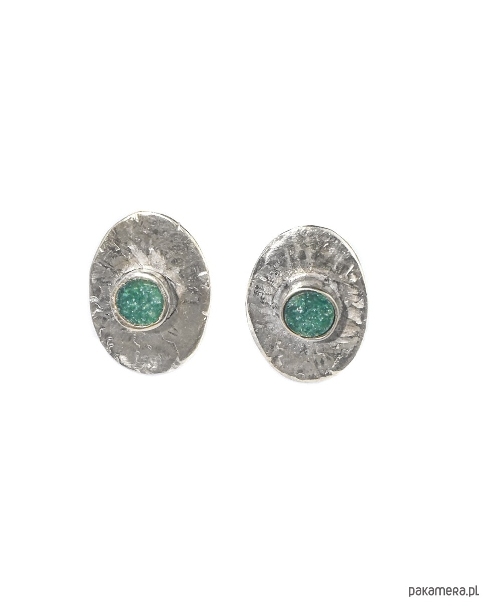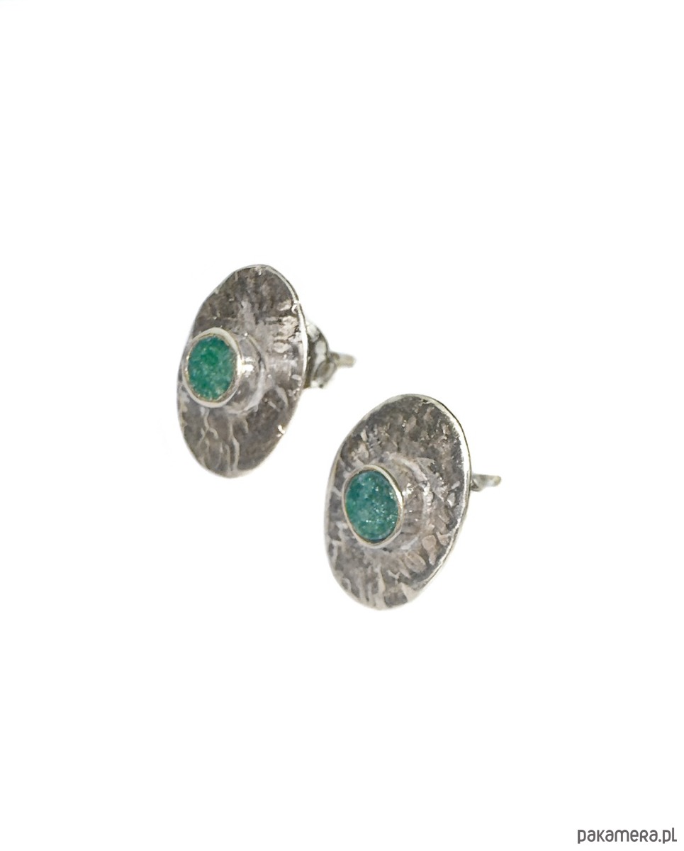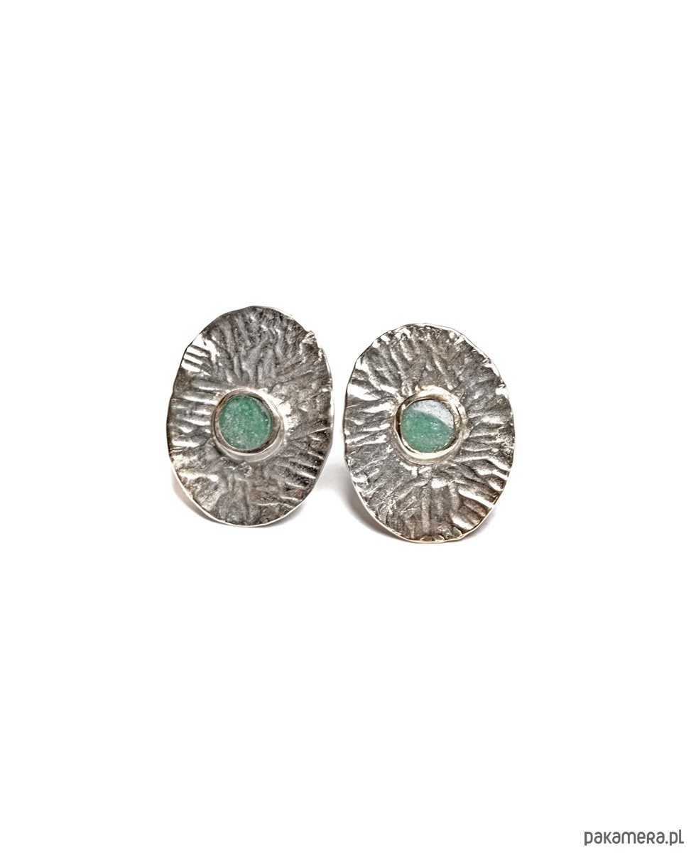 Kolczyki sztyfty o fakturowanej powierzchni. W centralnej części oprawiony awenturyn zielony. Wykonane ręcznie ze srebra 925. Istnieje możliwość zmiany kamieni na inne.