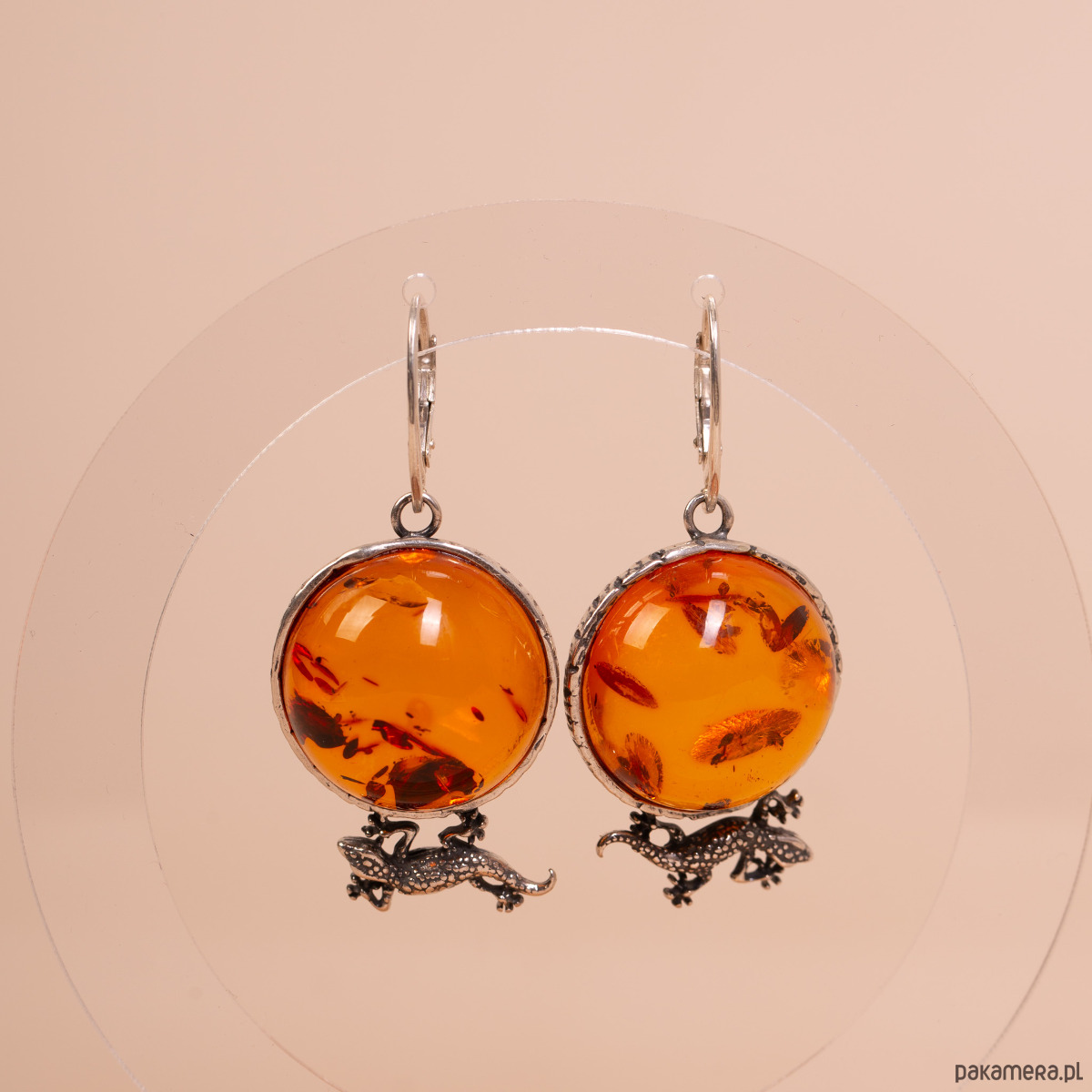 Srebro próby 925 · bursztyn bałtycki koniakowy (z łuską) · waga pary: 16,2 g · wymiary: 5 cm x 2,5 cm · średnica bursztynu: ok. 2,2 cm · jaszczurka: 1,8 cm x 1 cm · zapięcie: bigiel angielski · ręczna praca autorska