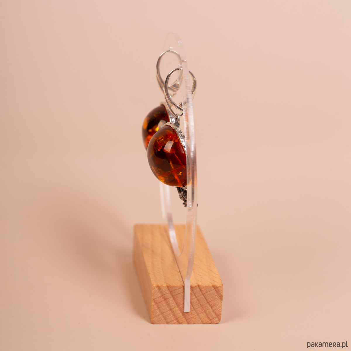 Artystyczne, ręcznie wykonane kolczyki ze srebra próby 925. Głównym elementem projektu są okazałe, bursztyny bałtyckie w głębokim, koniakowym odcieniu. Bursztyny charakteryzują się wyraźną wewnętrzną „łuską”, która pięknie załamuje światło i nadaje im głębi. Poniżej opraw umieszczono misternie wykonane, srebrne jaszczurki, które dodają całości intrygującego, nieco egzotycznego charakteru.