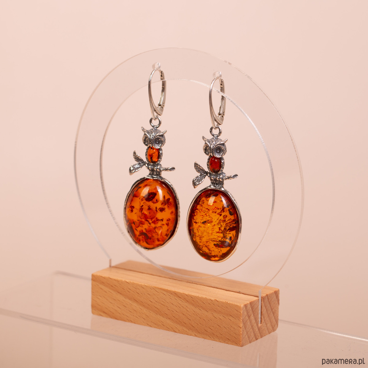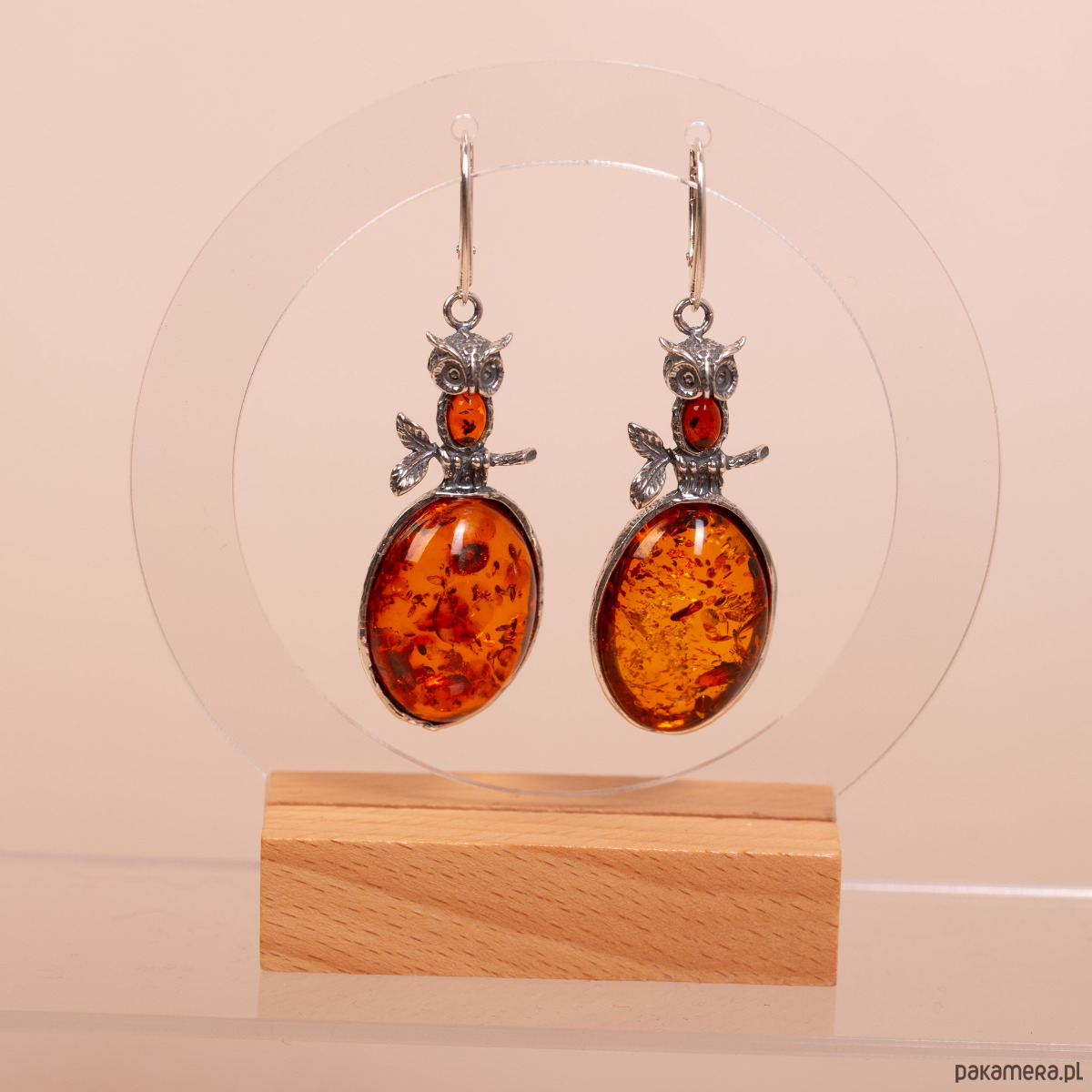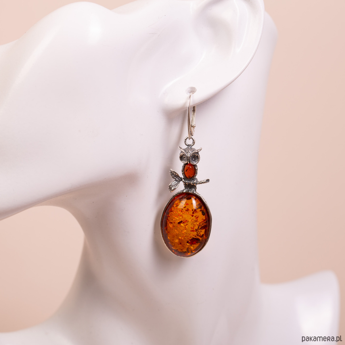 Kolczyki srebrne z bursztynem bałtyckim koniakowym sowy
