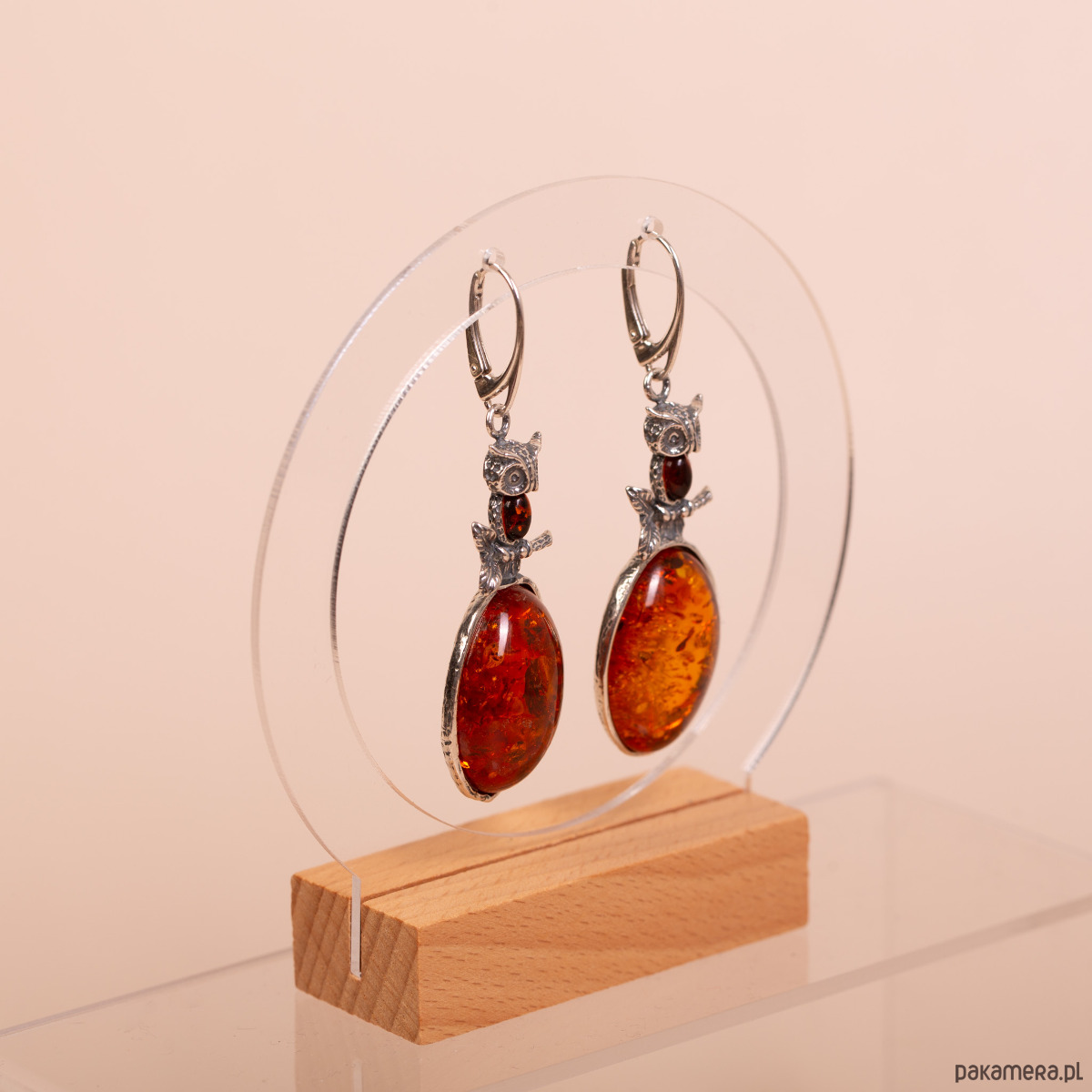 Artystyczne, ręcznie wykonane kolczyki ze srebra próby 925. Głównym elementem projektu są okazałe, owalne bursztyny bałtyckie w głębokim, koniakowym odcieniu z wyraźną wewnętrzną „łuską”, która efektownie załamuje światło. Powyżej opraw umieszczono misternie rzeźbione figurki sówek siedzących na gałązkach, których brzuszki zdobią mniejsze, bursztynowe oczka.