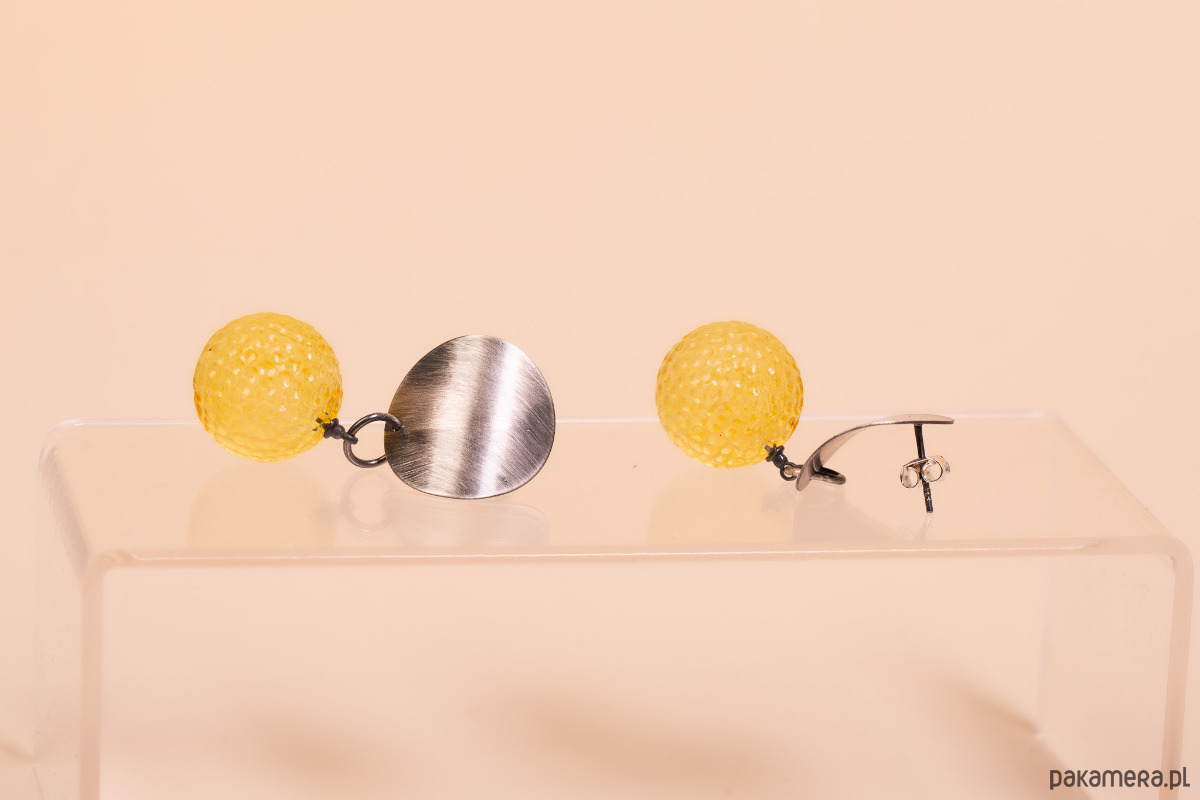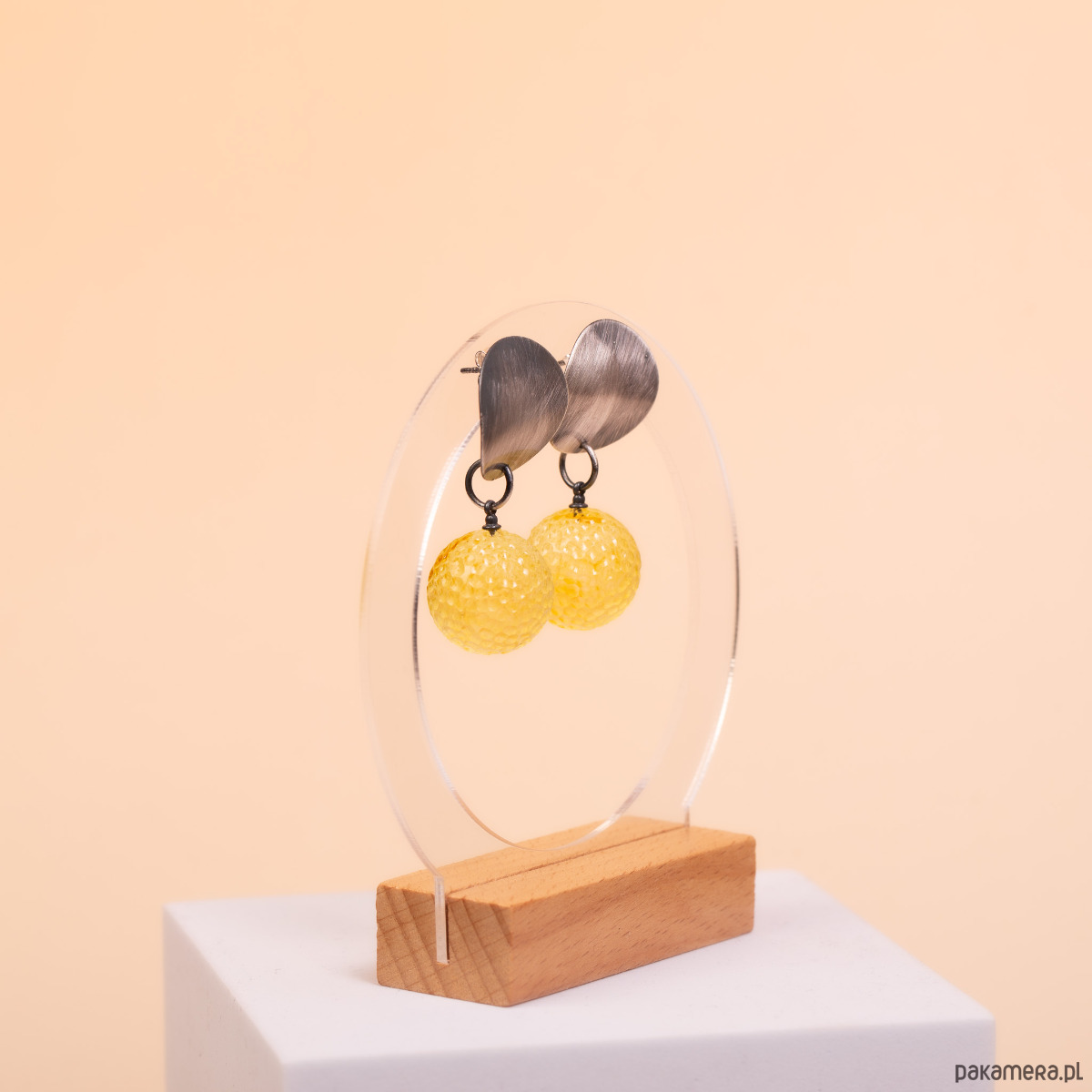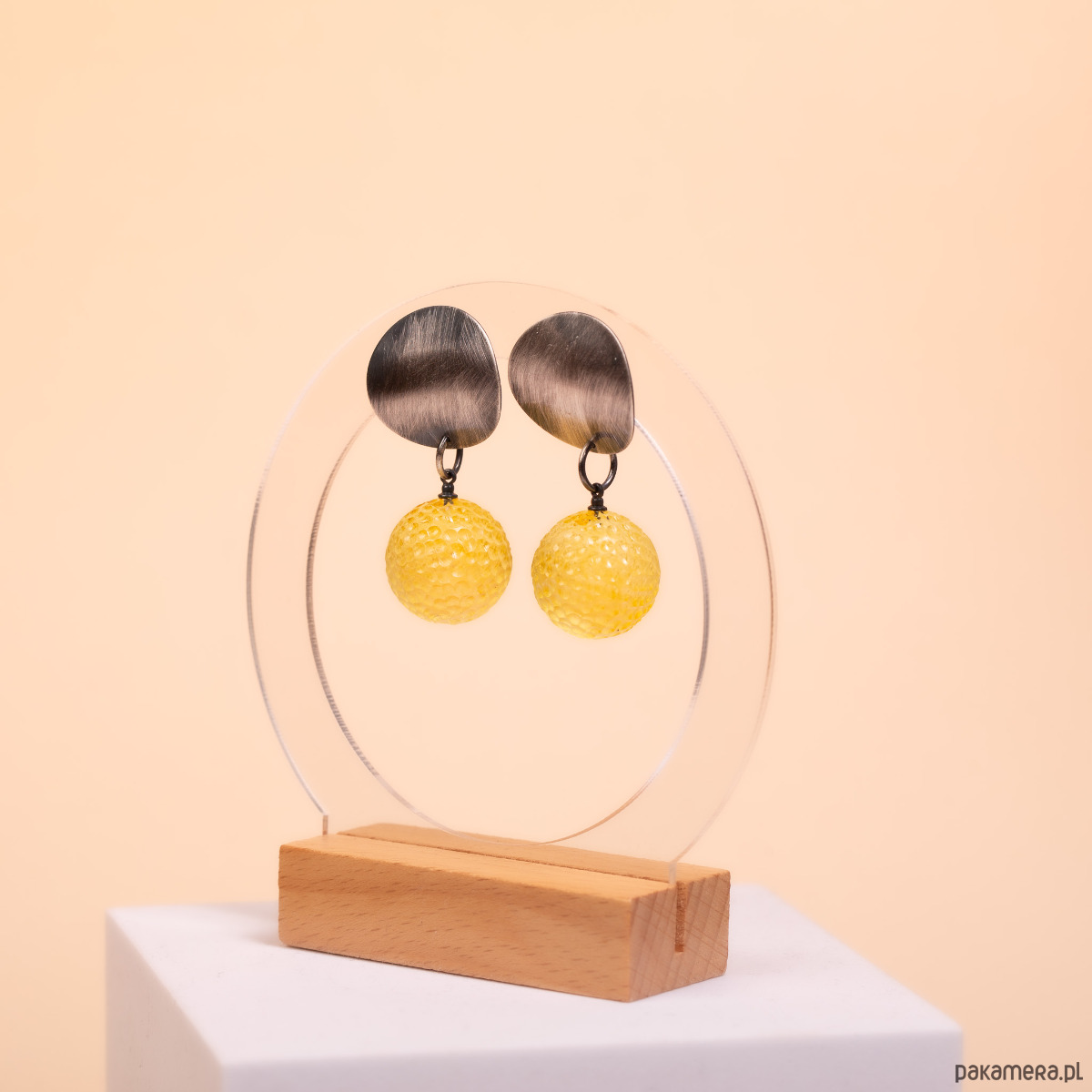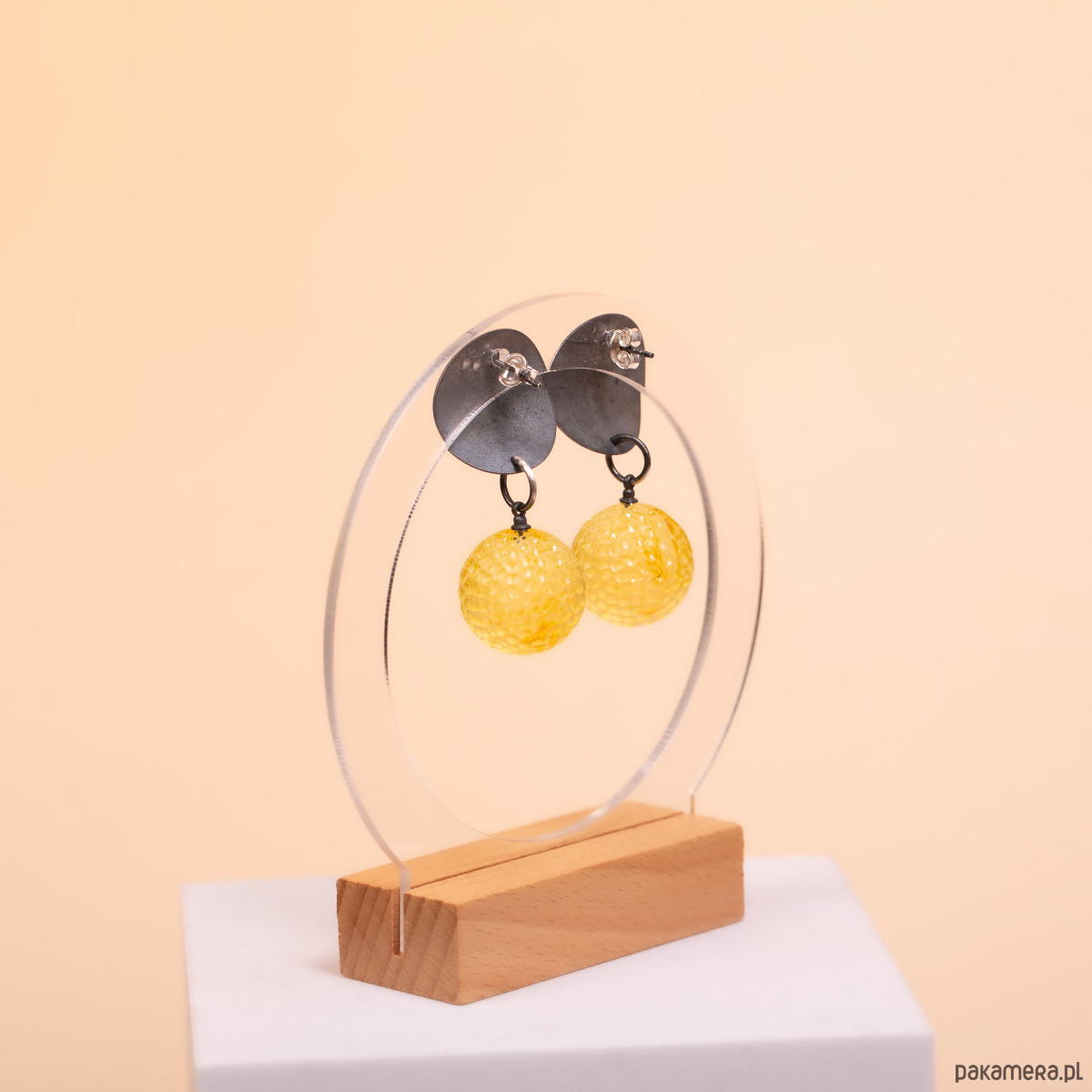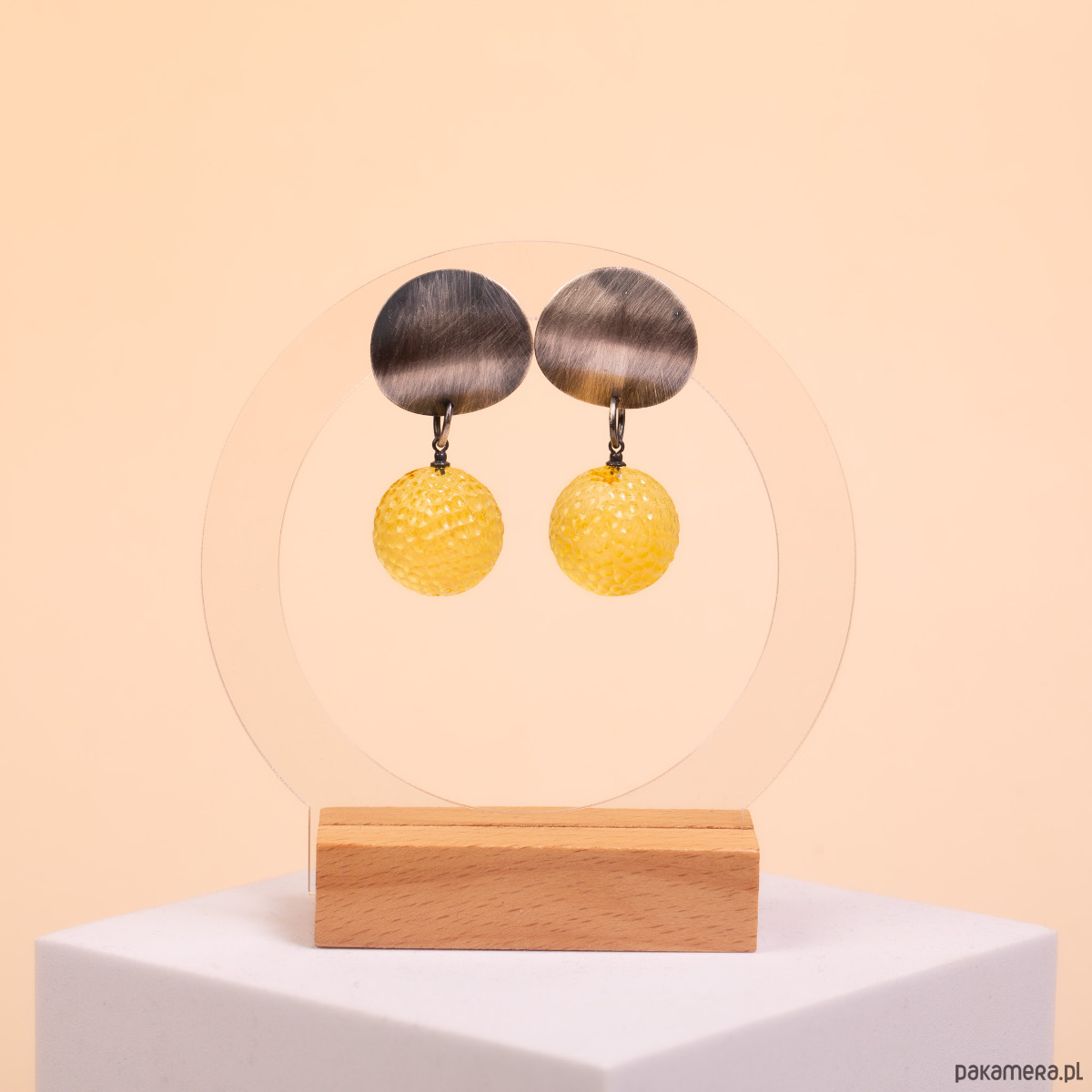 Srebro próby 925 oksydowane · bursztyn cytrynowy (rzeźbiony) · waga pary: 11 g · blaszka: ok. 2,2 cm · kulka: ok. 1,8 cm · zapięcie: sztyfty · ręczna praca autorska