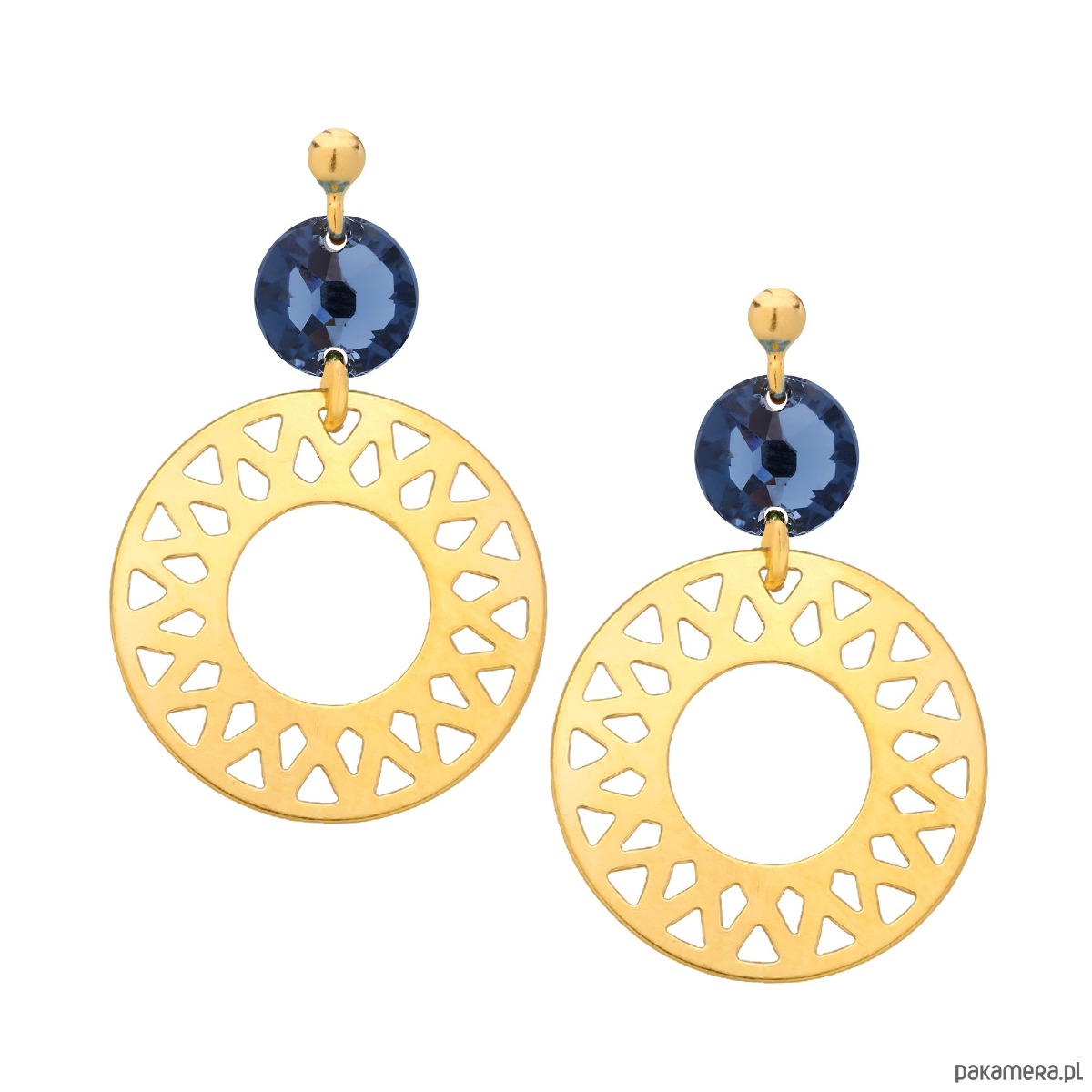 Złote kolczyki wykonane z okrągłych arabskich dużych rozet i ciemnoniebieskich kryształów SWAROVSKI® CRYSTAL w kolorze Denim Blue. Całość wykonana ze srebra 925 powlekanego 24 karatowym żółtym złotem. Zapinane na sztyft.