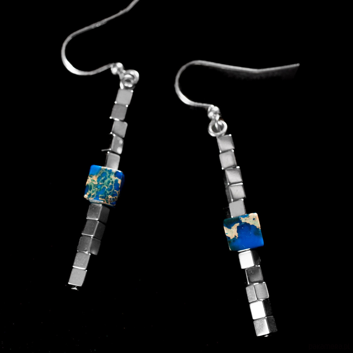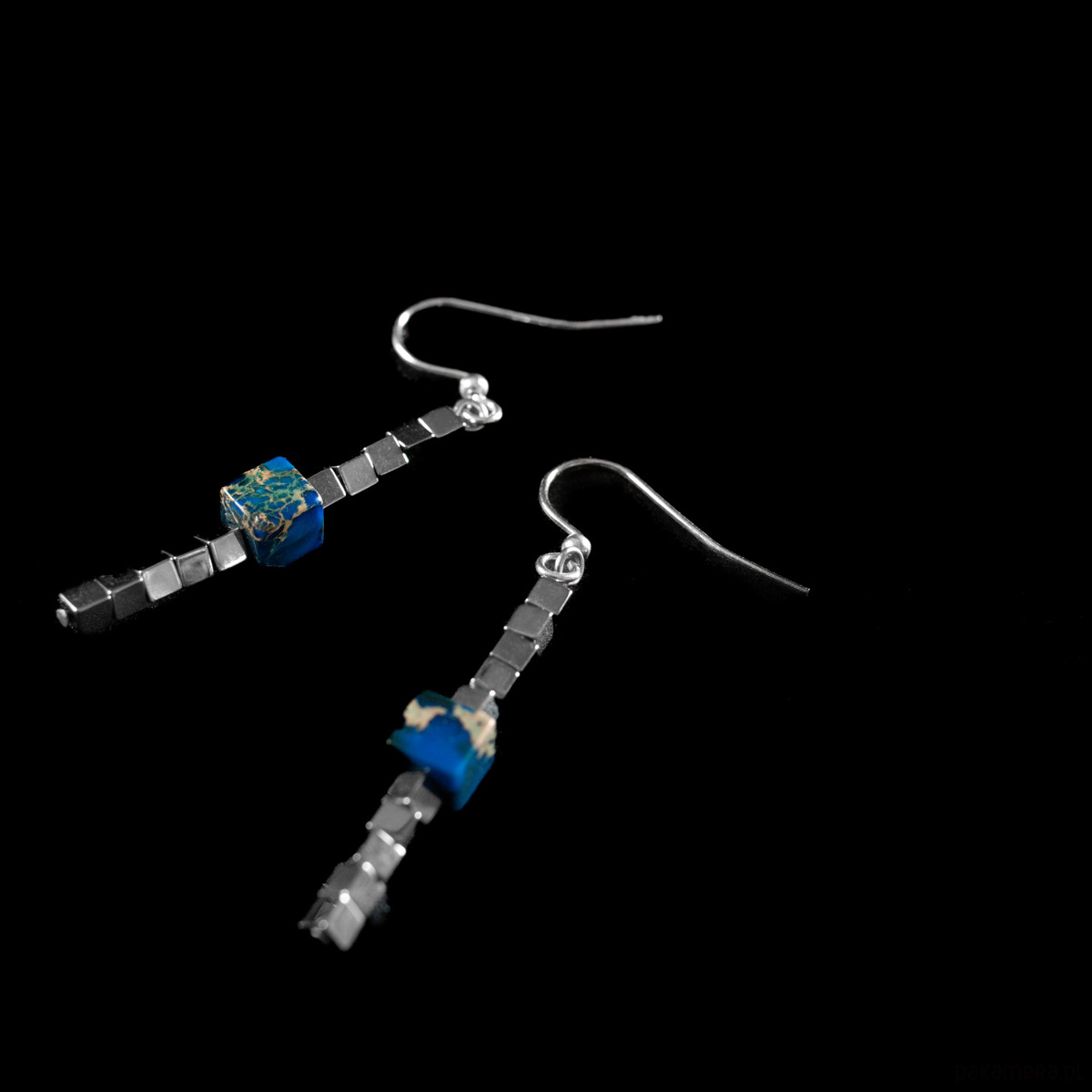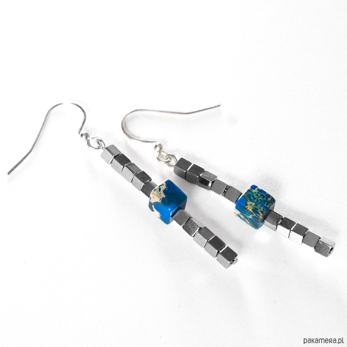 Delikatne, geometryczne kolczyki z kolekcji WOJOWNICZKA. Kostka z jaspisu cesarskiego otoczona z obu stron mniejszymi, błyszczącymi srebrem kostkami hematytu. Długość kolczyka wraz z biglem 5,5 cm . Element ozdobny z kamieni połączony jest luźno z biglami, przez co pięknie "tańczy" i połyskuje podczas ruchu. Bigle - srebro 925. Kolczyki wykonane ręcznie według własnego projektu w pracowni Anillo. Biżuterię przesyłamy w eleganckim kartoniku.