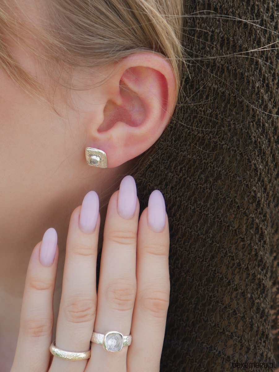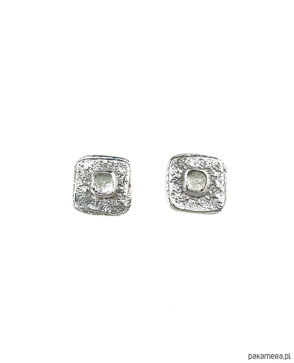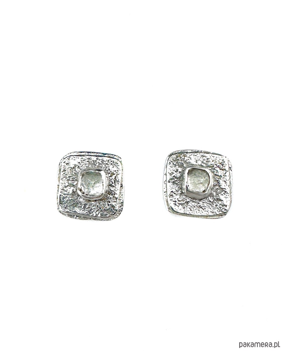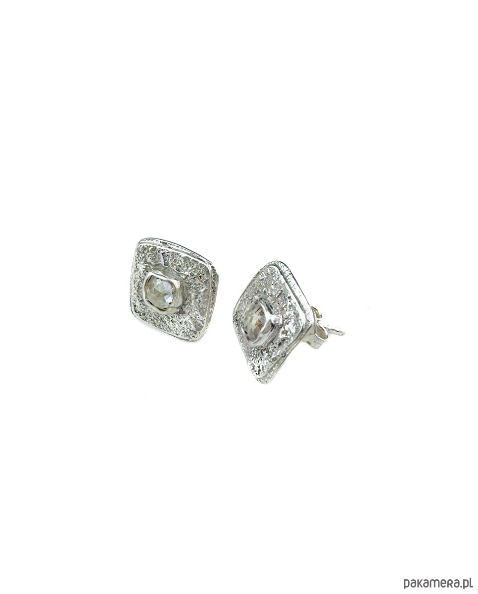 Kolczyki sztyfty, wykonane ręcznie ze srebra, próby 925. Fasetowane kryształy górskie zostały osadzone w centralnej części. Powierzchnia kolczyków fakturowana.