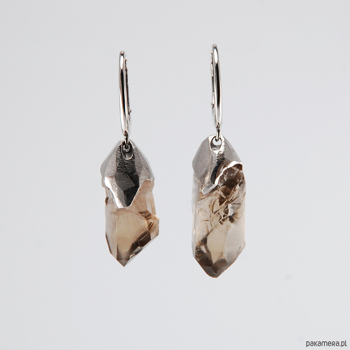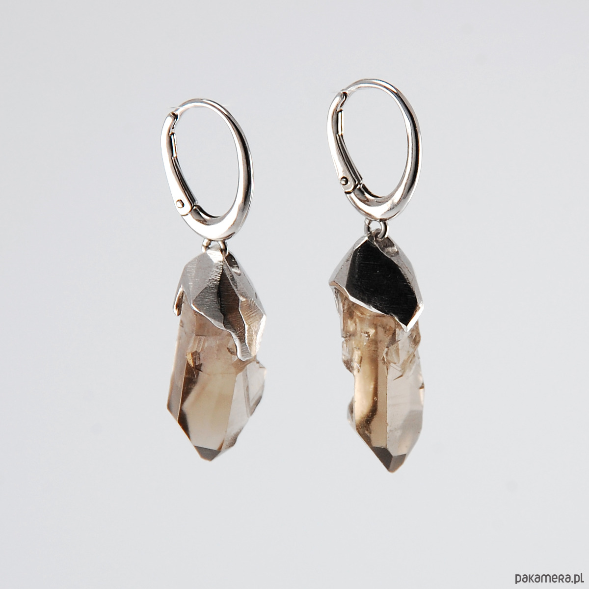 Wiszące kolczyki z kwarcem dymnym oprawionym w srebro próby 925 w matowym wykończeniu. Pokryte są szlachetnym rodem, dzięki czemu srebro nie ciemnieje.