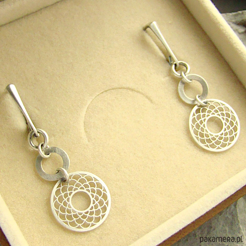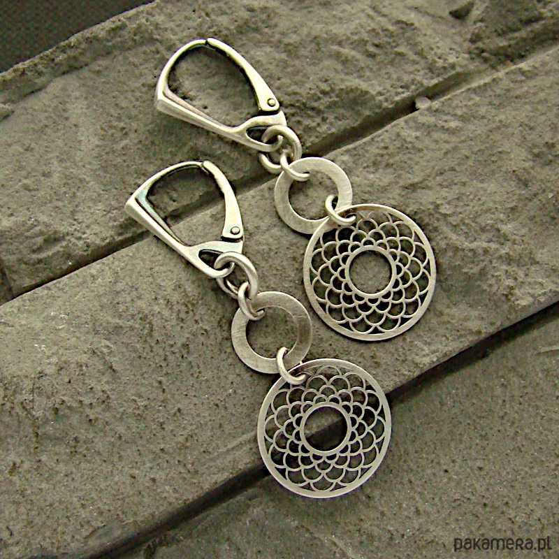 Nowoczesne i minimalistyczne kolczyki wykonane w całości z oksydowanego srebra próby 925. Zapięcia zatrzaskowe typu angielskiego. Średnica rozet to 16 mm. Całkowita długość kolczyków to ok. 4,6 cm. W mojej galerii naszyjnik do kompletu. Ozdobnie zapakowane.