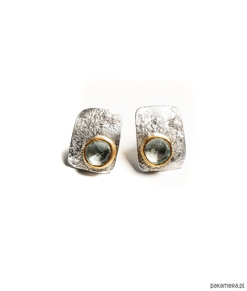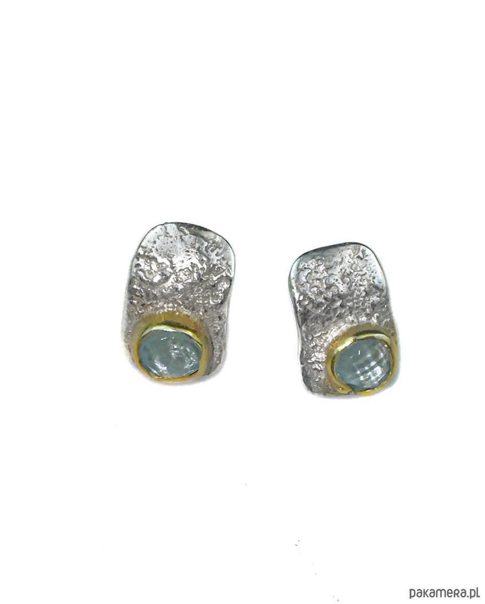Kolczyki sztyfty wykonane ręcznie ze srebra, próby 925. Błękitne, fasetowane topazy zostały osadzone w złocone oprawie. Powierzchnia kolczyków fakturowana.