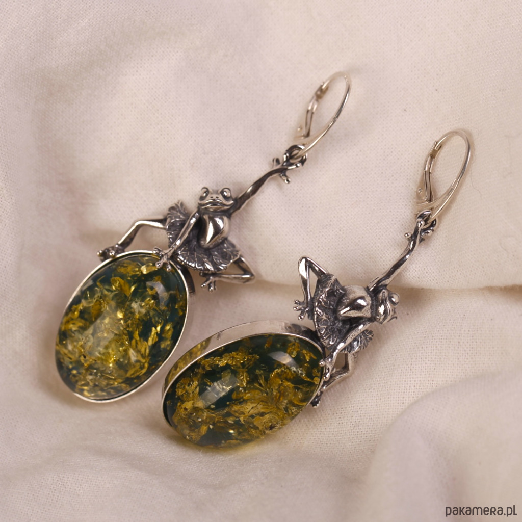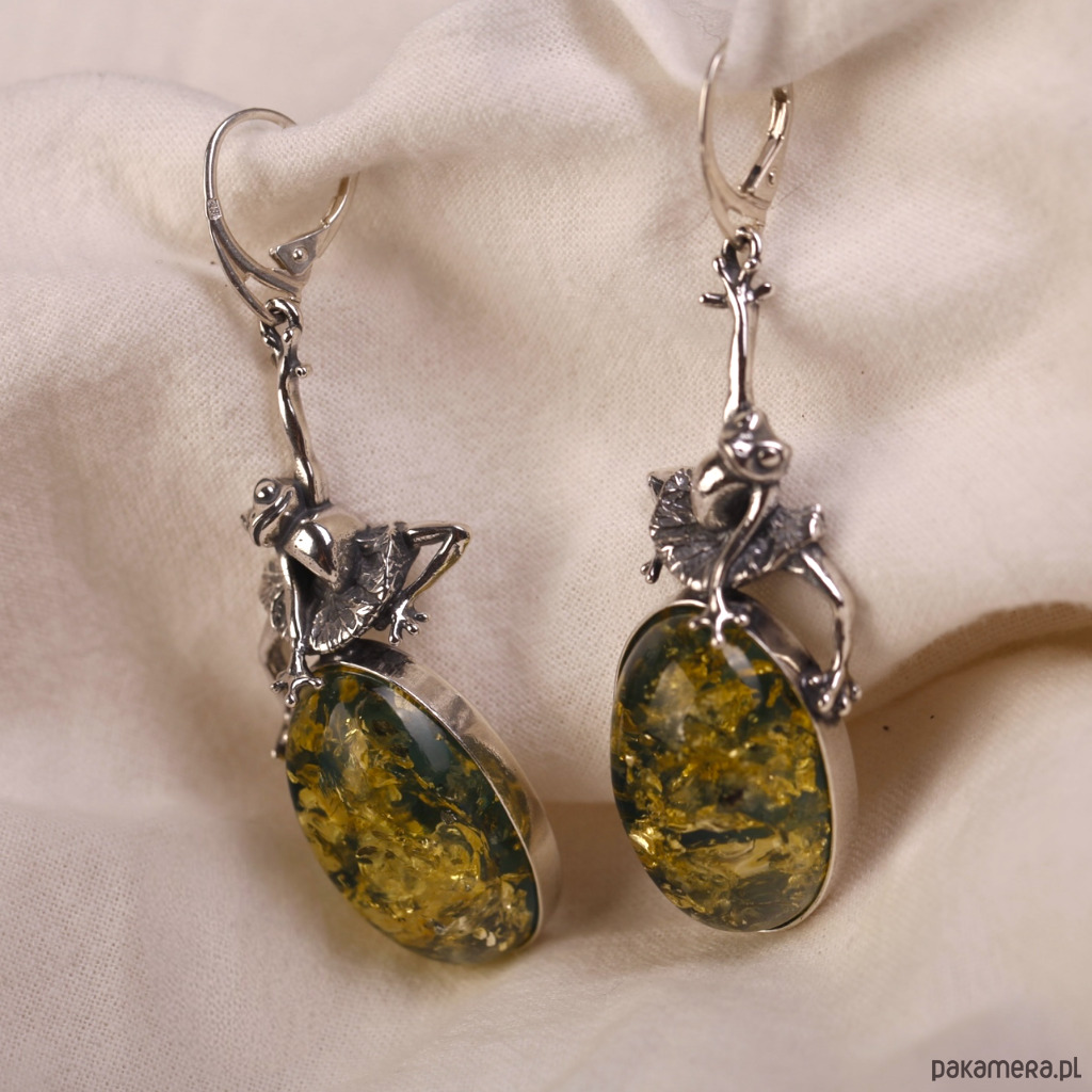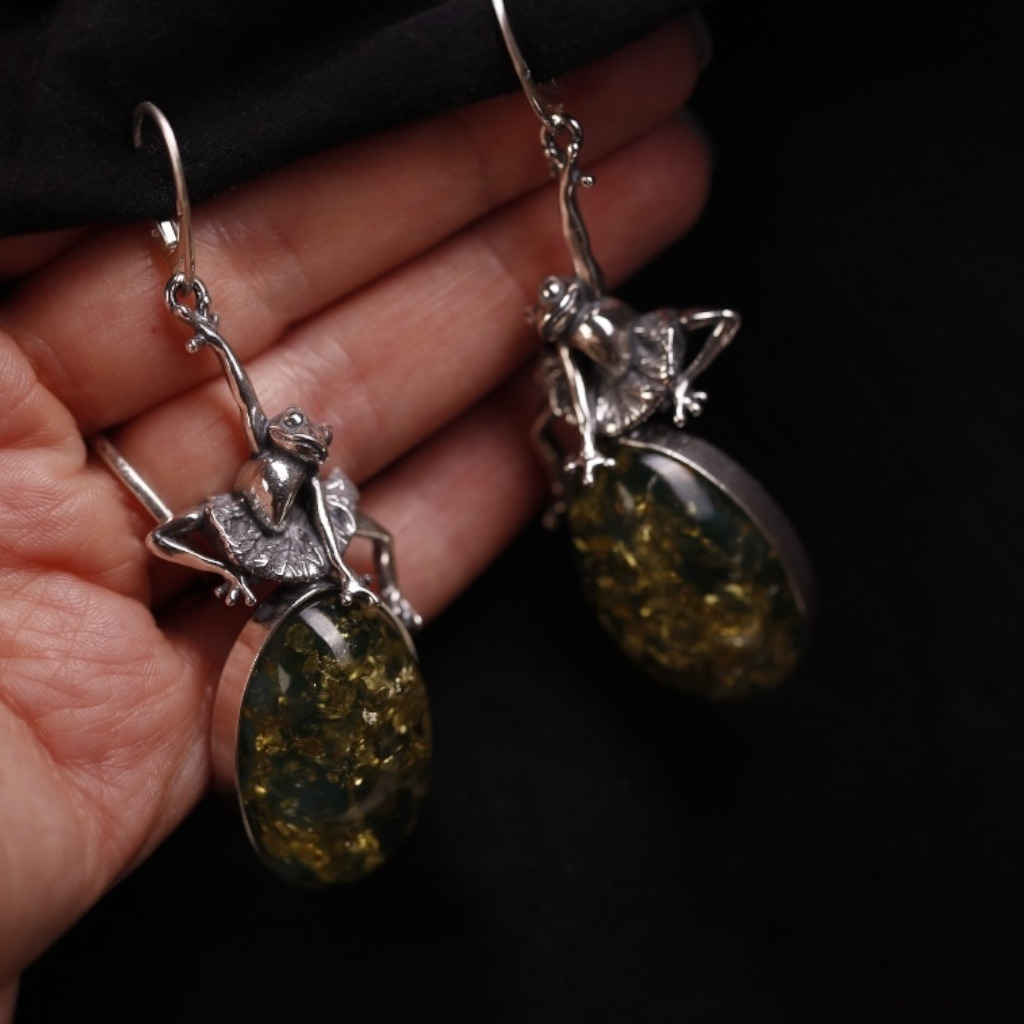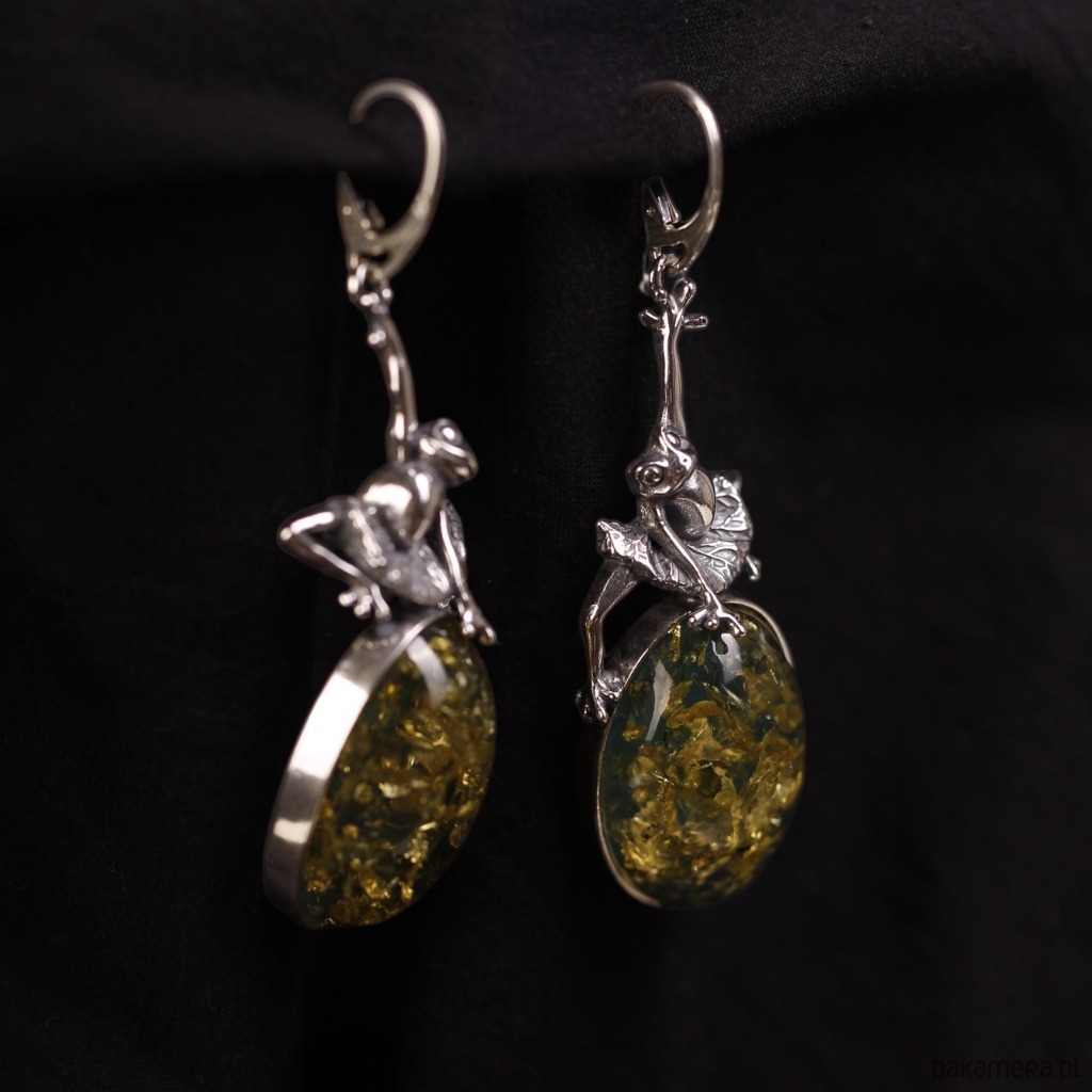 Kolczyki, obok których nie da się przejść obojętnie – srebrne żaby baletnice w spódniczkach trzymają duże, zielone bursztyny, które w świetle iskrzą złotymi drobinkami. Mimo swoich rozmiarów kolczyki układają się lekko, a energiczny, lekko żartobliwy motyw pięknie przełamuje nawet najprostszy strój. Idealne, jeśli lubisz biżuterię z charakterem i uśmiechem.