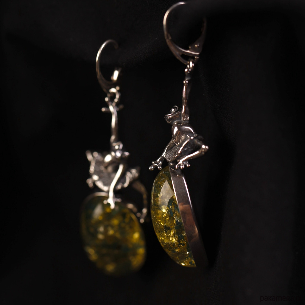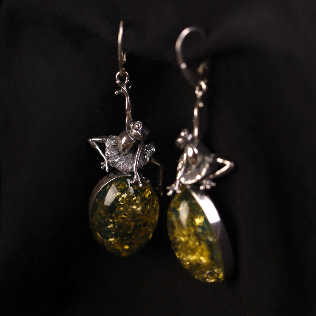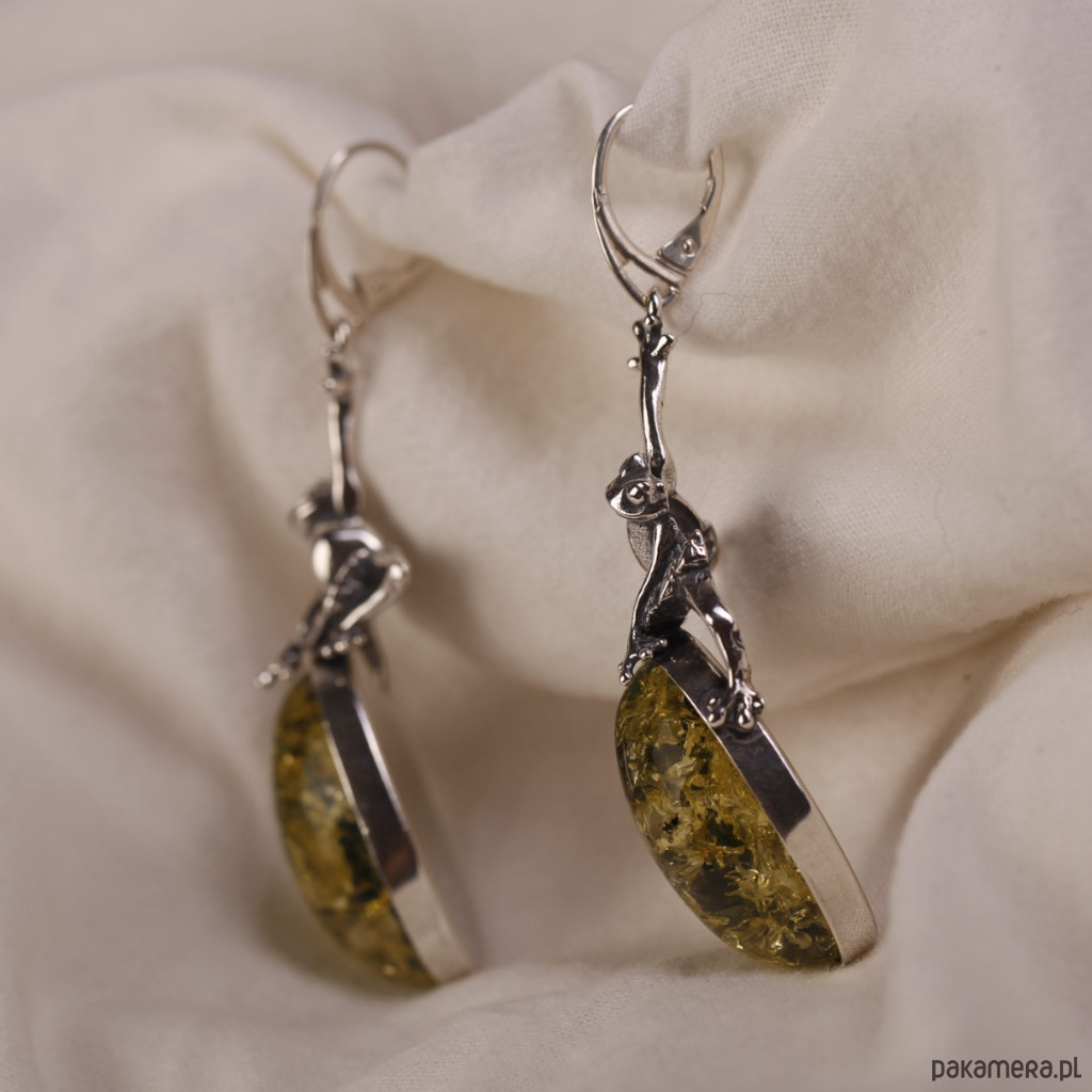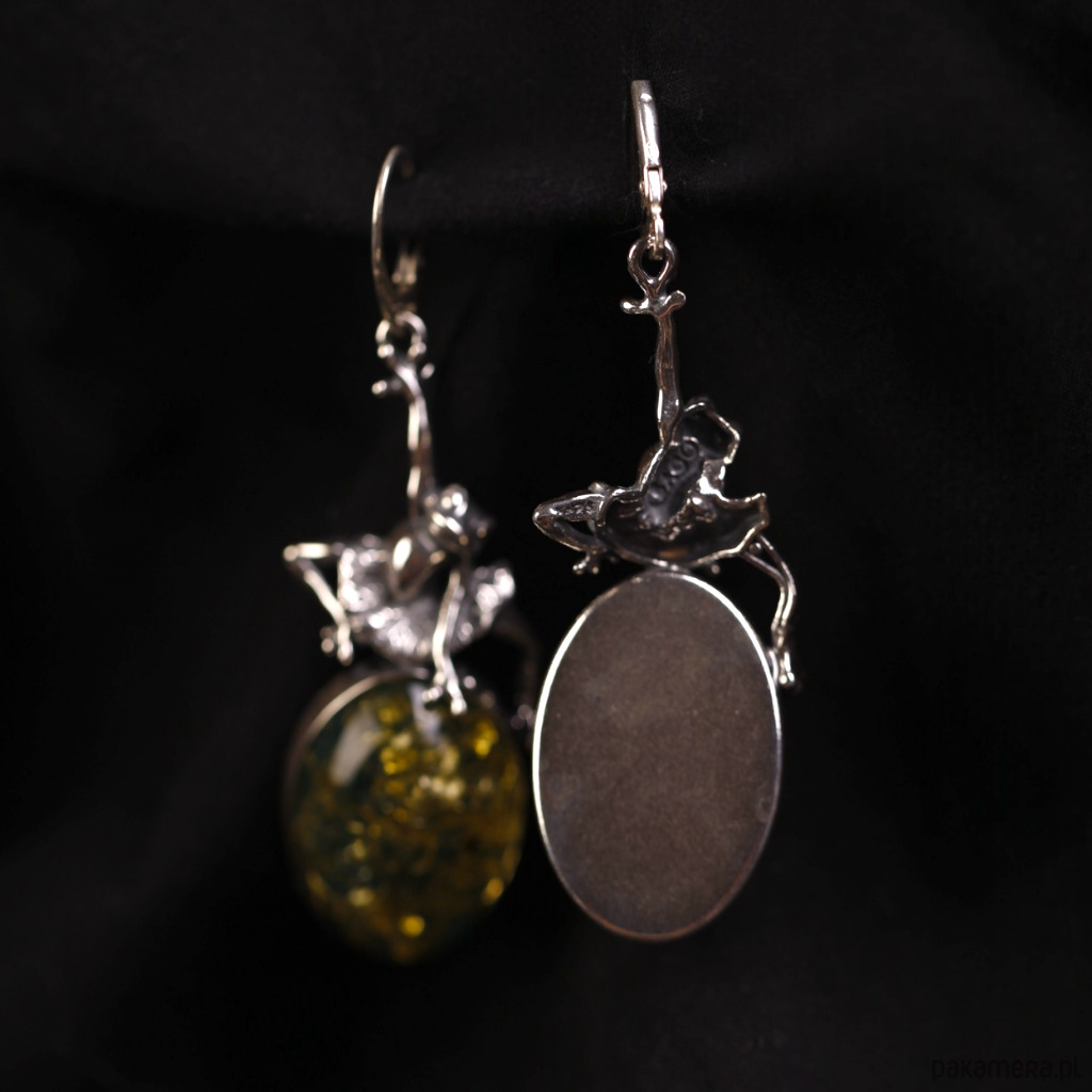 Kolczyki, obok których nie da się przejść obojętnie – srebrne żaby baletnice w spódniczkach trzymają duże, zielone bursztyny, które w świetle iskrzą złotymi drobinkami. Mimo swoich rozmiarów kolczyki układają się lekko, a energiczny, lekko żartobliwy motyw pięknie przełamuje nawet najprostszy strój. Idealne, jeśli lubisz biżuterię z charakterem i uśmiechem.