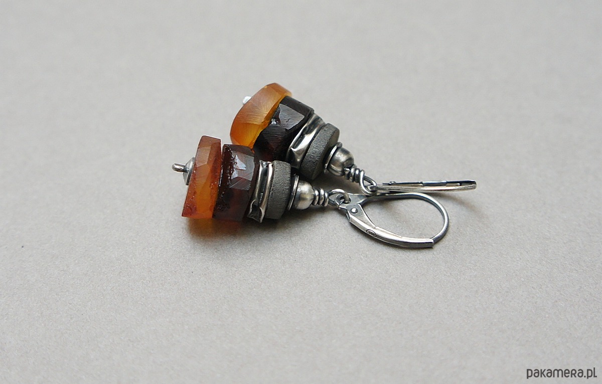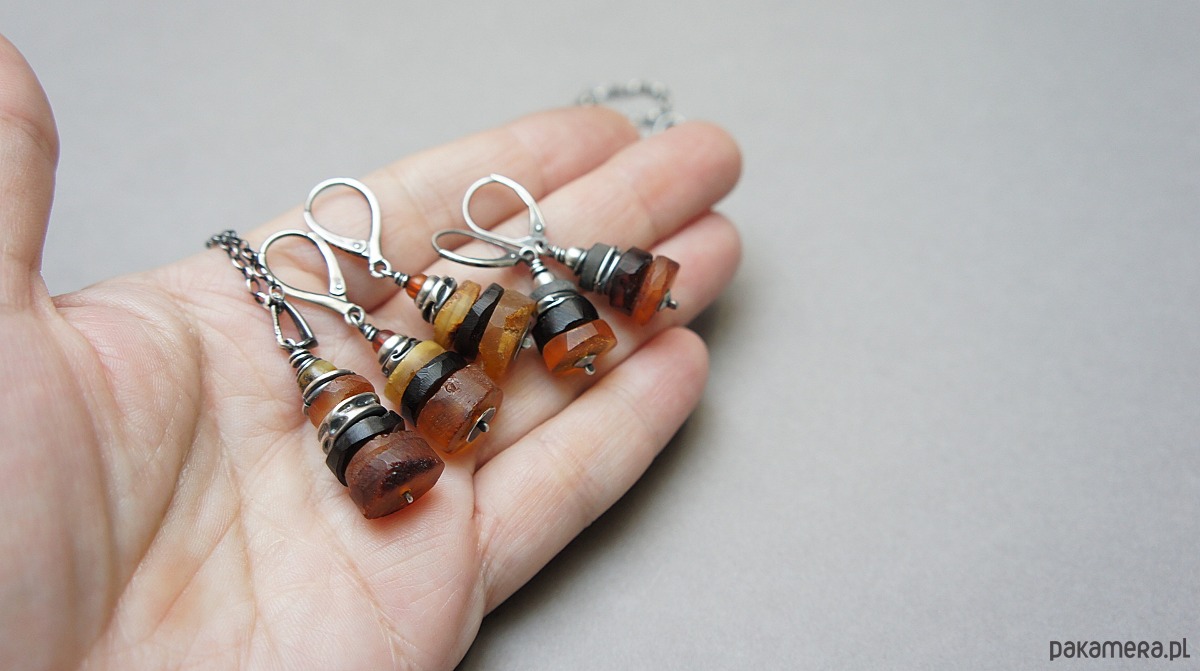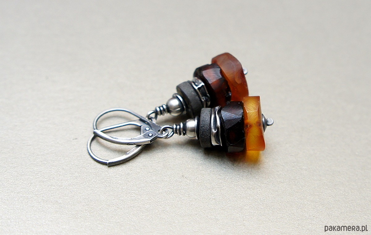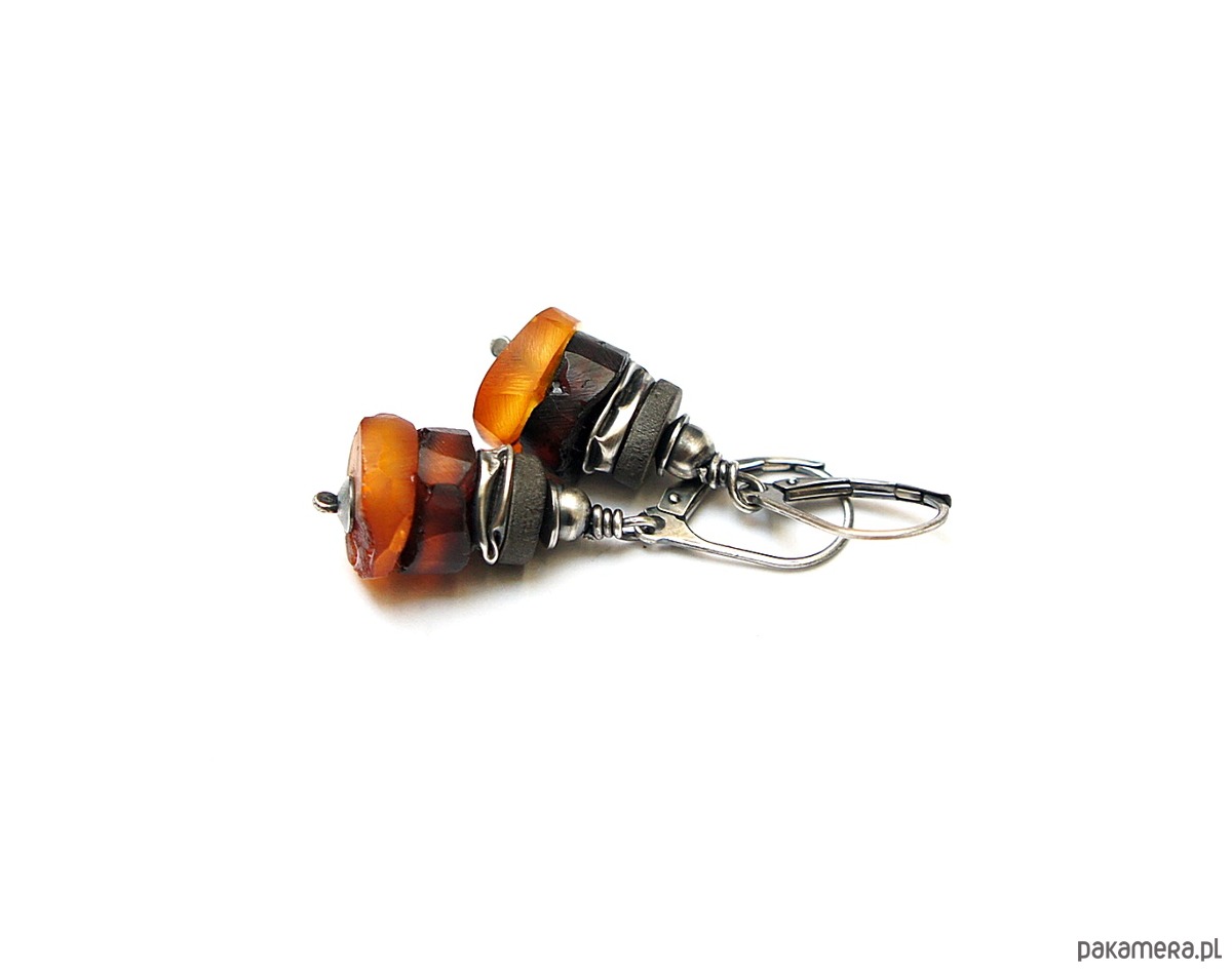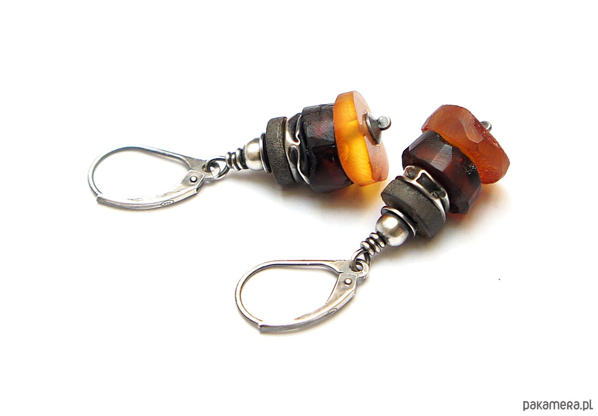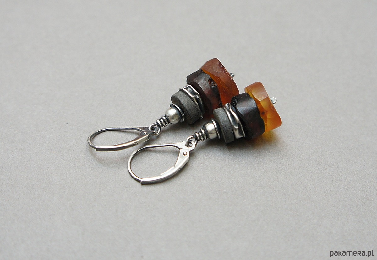 Kolczyki wykonane ze srebra [pr. 925] w połączeniu z plastrami surowych, matowych bursztynów [11mm i 10mm], szarą muszlą [8mm] . Srebro o oksydowane i przetarte. Całkowita długość kolczyków 4,2cm. Biżuteria ozdobnie zapakowana.