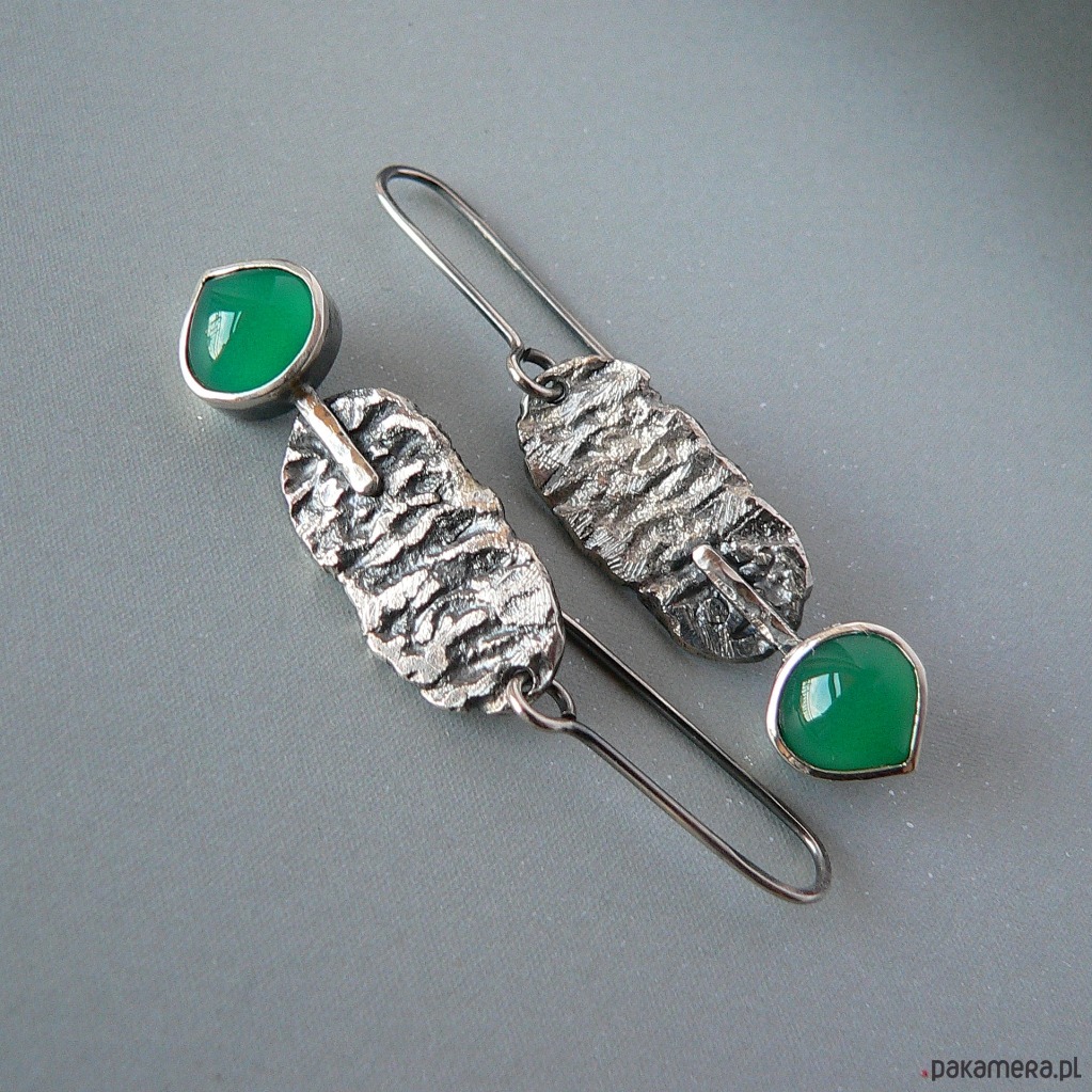 Surowe, długie kolczyki wykonane ze srebra i zielonych agatów . Srebro formowane ogniem, oksydowane dla podkreślenia wyraźnej faktury, detale polerowane, wymiary surowego elementu 2,5/1,2 cm Wymiary kamienia- 1/1 cm Długość całkowita kolczyka 6 cm, waga 5 g, nie obciążają ucha.