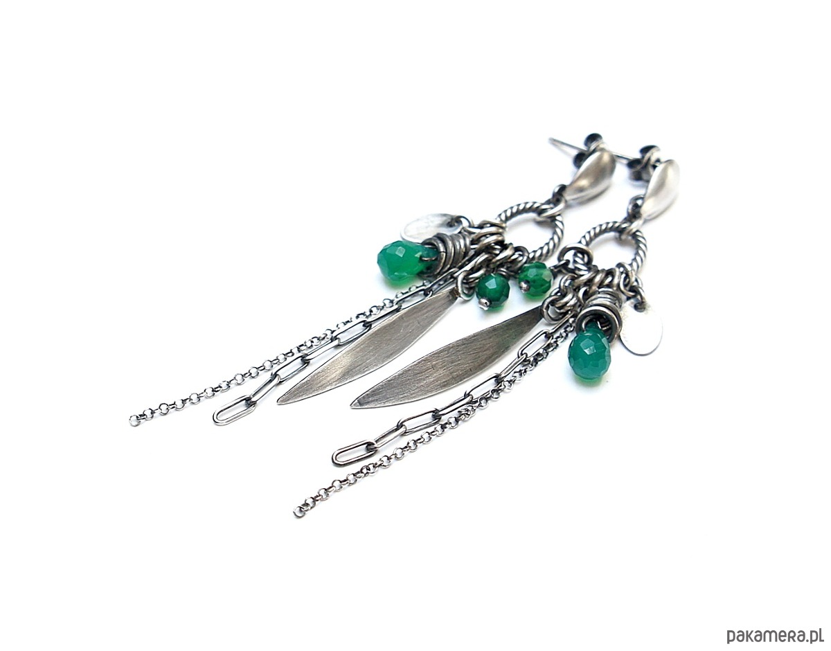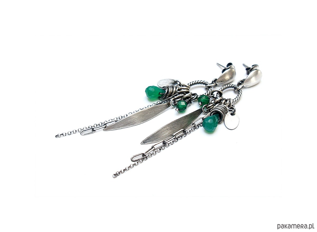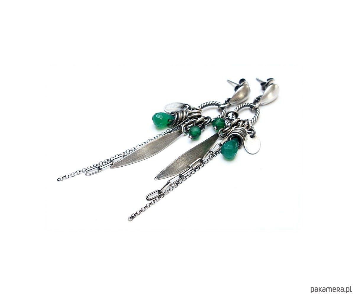 Kolczyki wykonane ze srebra [pr. 925] w połączeniu z brioletkami zielonych onyksów [8mm], fasetowanymi kuleczkami zielonych agatów [4mm] oraz srebrnymi przywieszkami. Całość oksydowana i przetarta. Całkowita długość kolczyków ok. 7,4cm. Biżuteria ozdobnie zapakowana