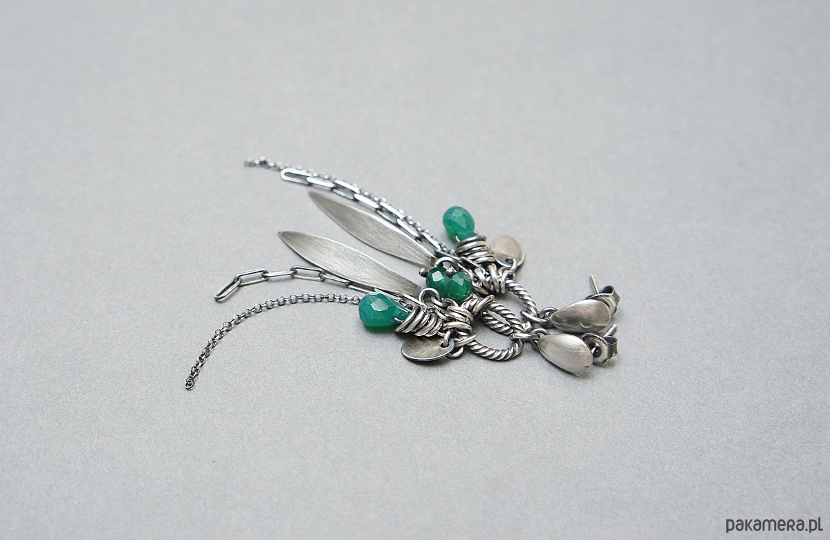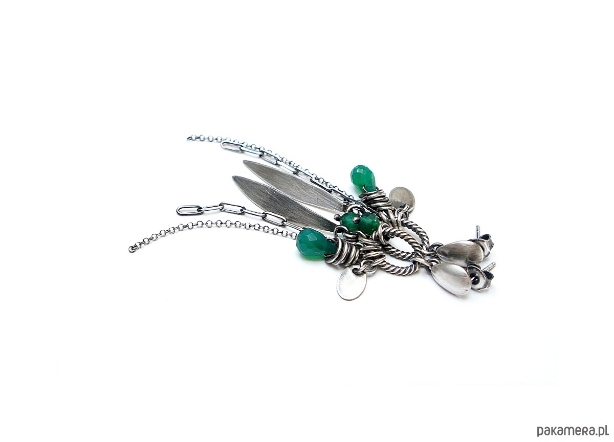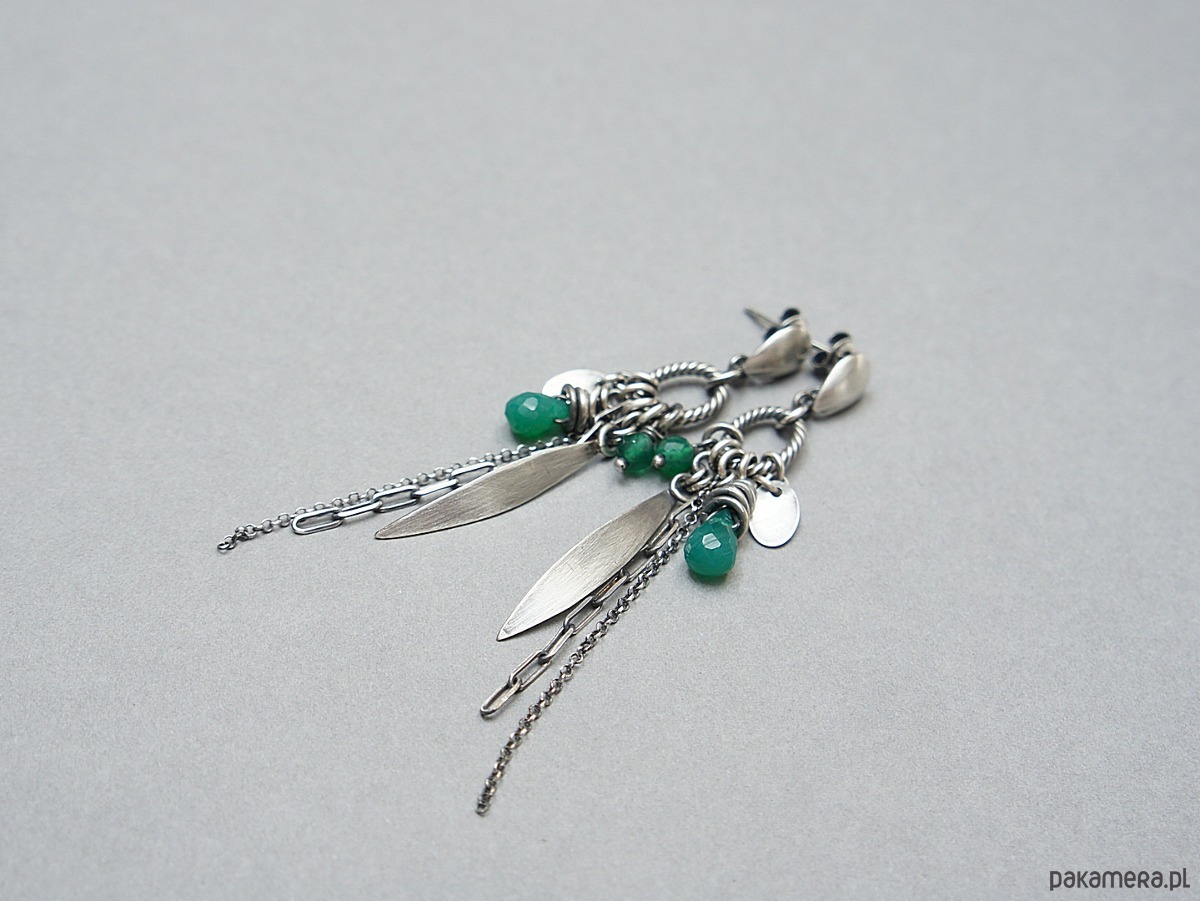 Kolczyki wykonane ze srebra [pr. 925] w połączeniu z brioletkami zielonych onyksów [8mm], fasetowanymi kuleczkami zielonych agatów [4mm] oraz srebrnymi przywieszkami. Całość oksydowana i przetarta. Całkowita długość kolczyków ok. 7,4cm. Biżuteria ozdobnie zapakowana