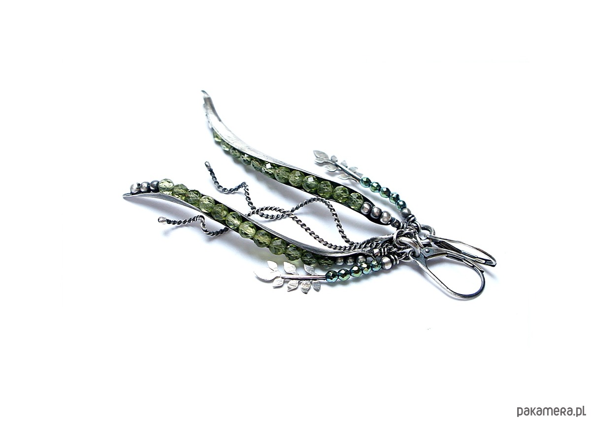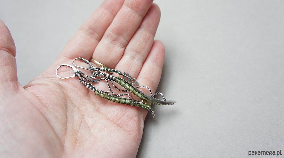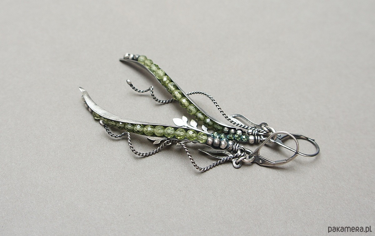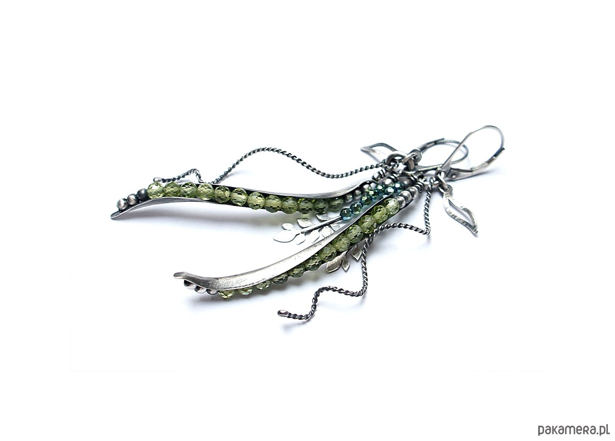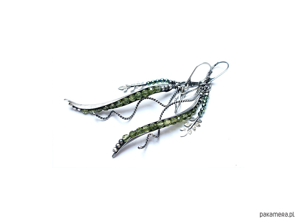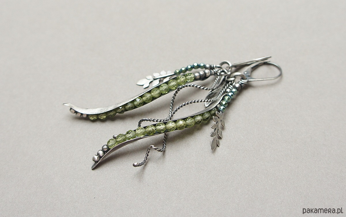 Kolczyki wykonane ręcznie ze srebra [pr. 925] w połączeniu z fasetowanymi kuleczkami perydotów [3mm], fasetowanymi zielonymi hematytami [2mm]. Srebro oksydowane i przetarte. Całkowita długość kolczyków 7,5cm. Biżuteria ozdobnie zapakowana.