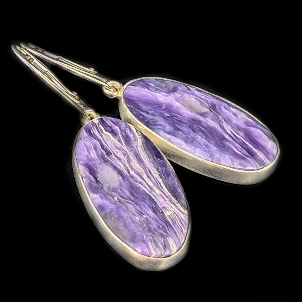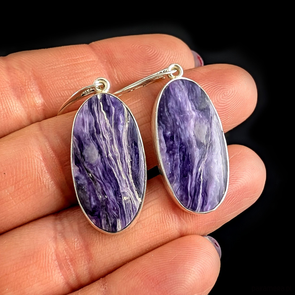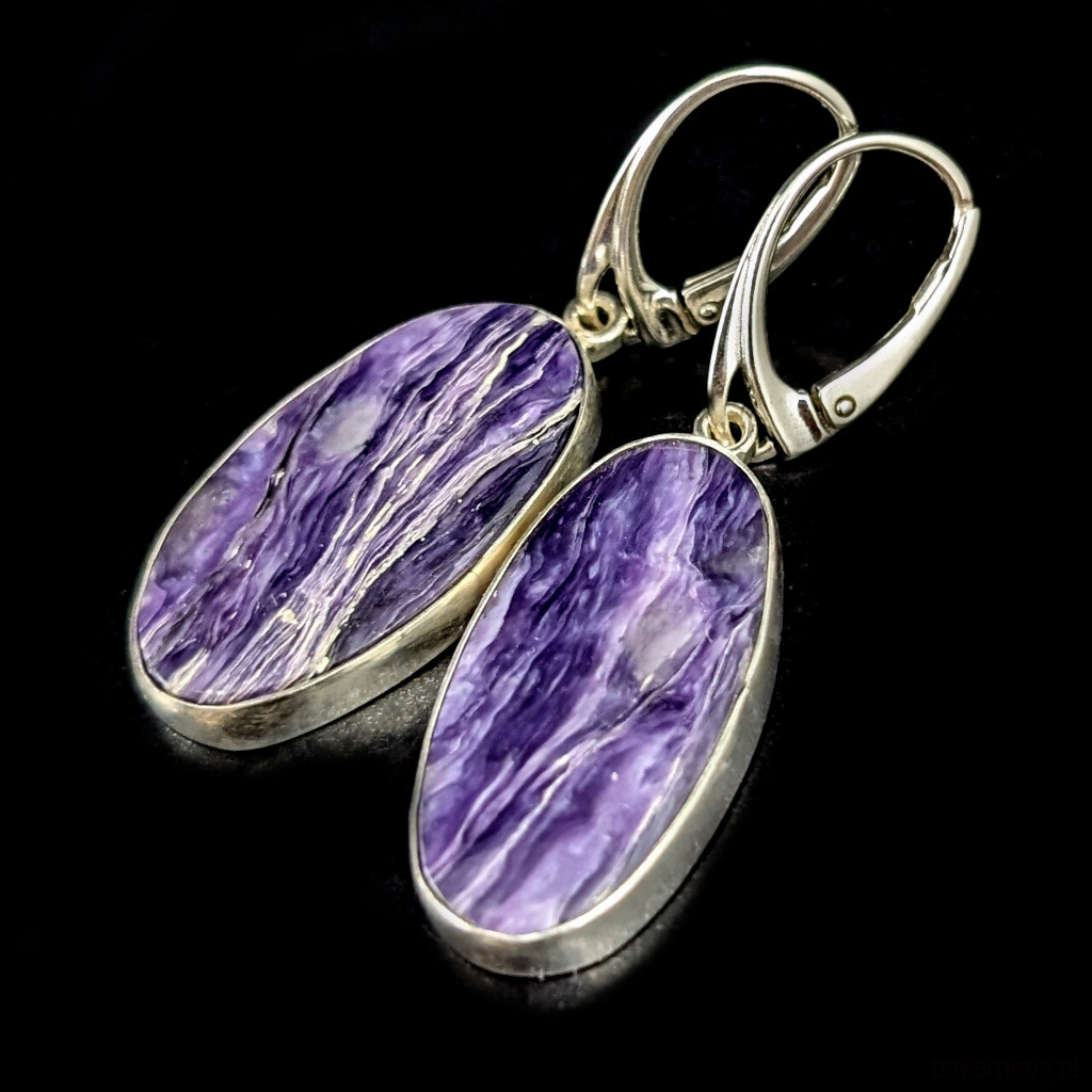 Przepiękne czaroity oprawione w srebro próby 925. Naturalny czaroit to rzadki kamień, którego skład jest wciąż geologiczną zagadką.Występuje tylko na 10 km2 w okręgu syberyjskim. Wymiary oprawy 26 x 13 mm. Gługość z biglami 45 mm. Waga jednego kolczyka 4,8 g. Będą zapakowane w ozdobne pudełeczko
