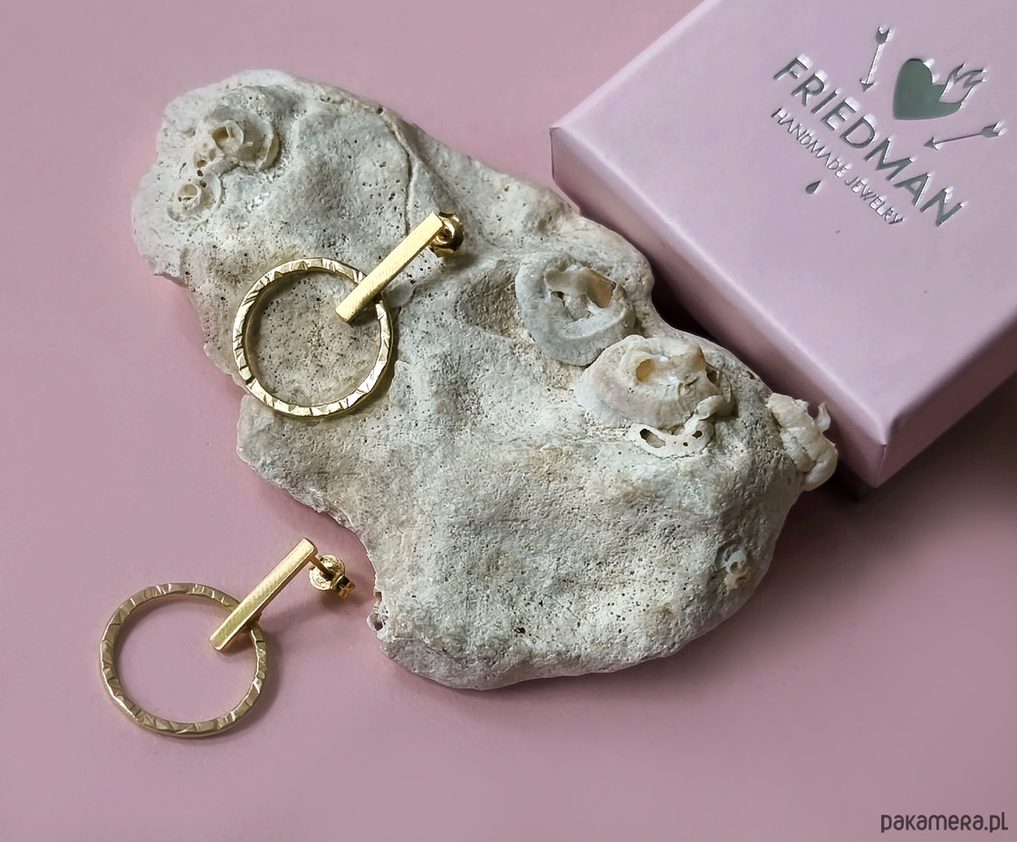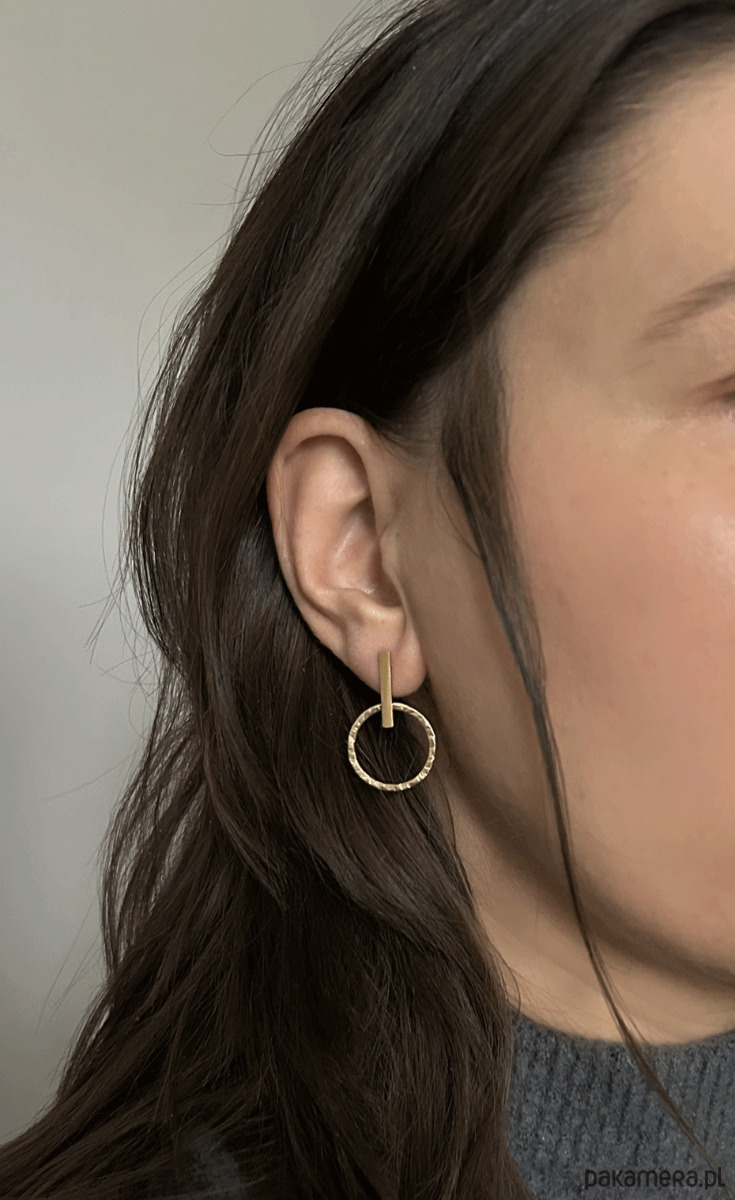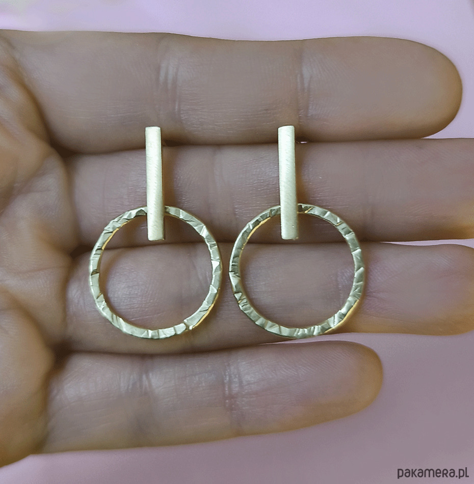 Nowoczesne kolczyki wykonane z dwóch ruchomo połączonych ze sobą elementów - koła o młotkowanej powierzchni ze srebra pokrytego złotem oraz elementu z mosiądzu o satynowej powierzchni pokrytego również złotem.te dwie faktury połączone ze sobą dają ciekawy efekt i inaczej odbijają światło.