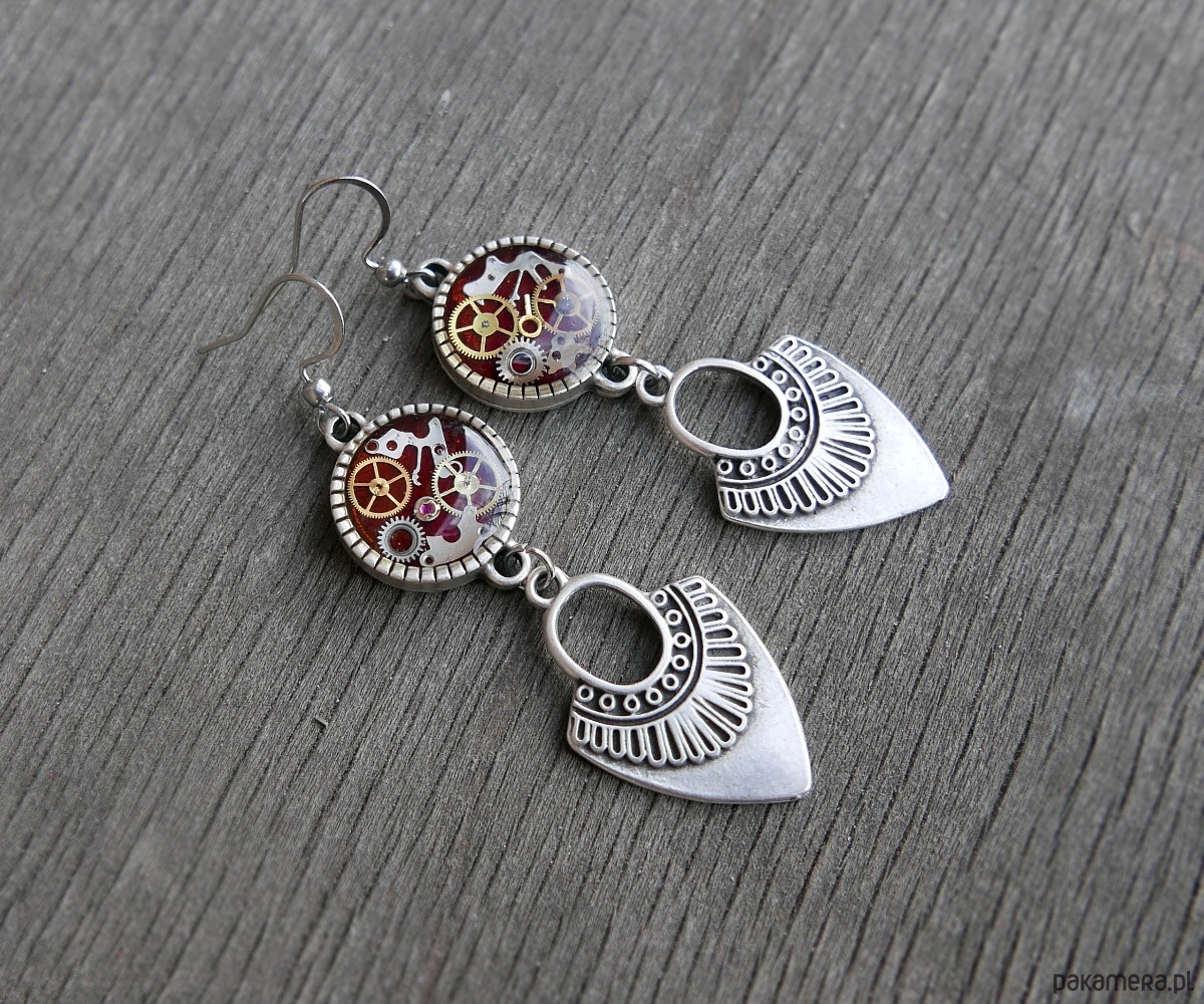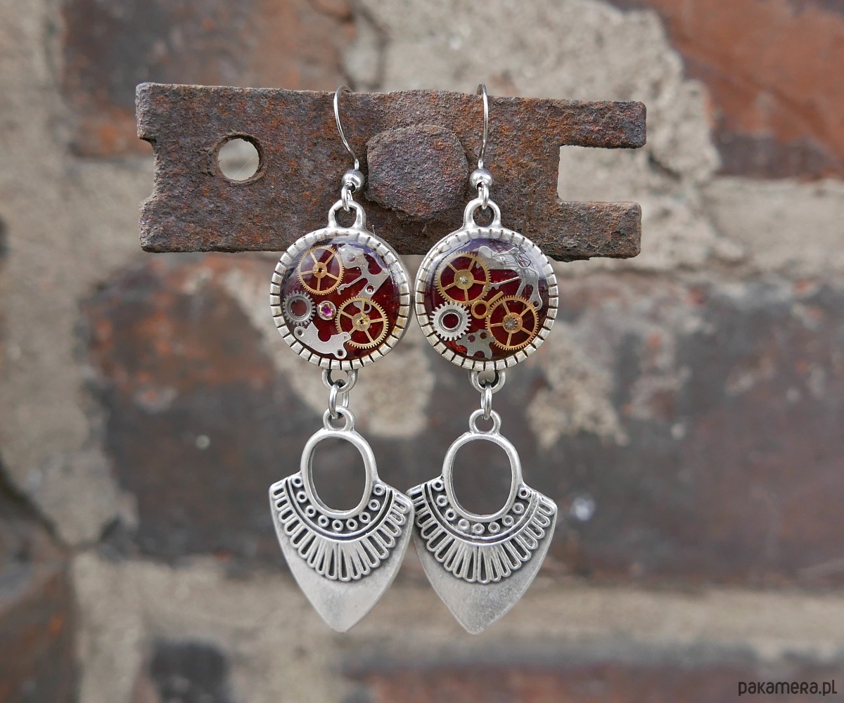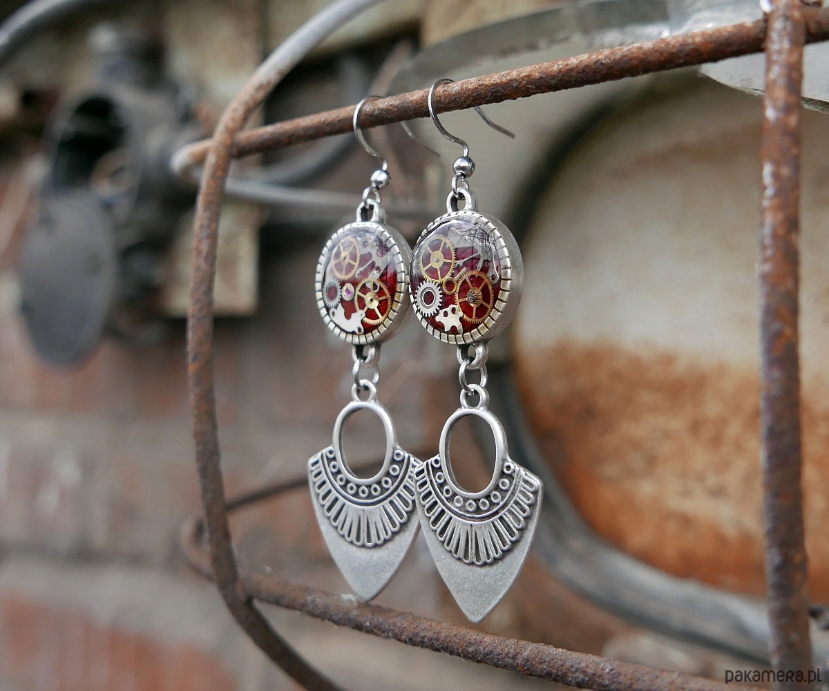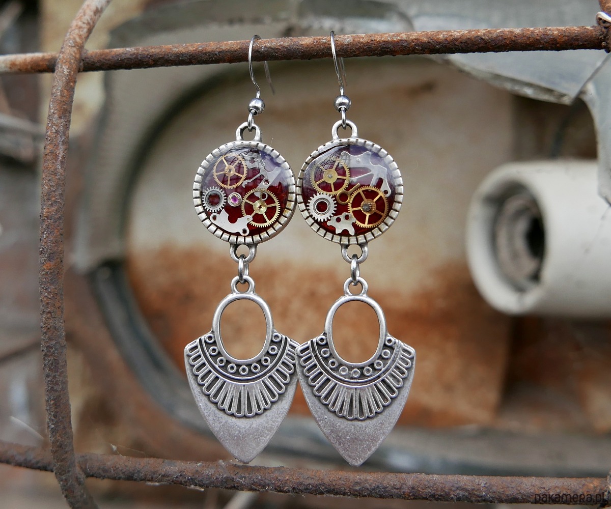 Oryginalne długie kolczyki w stylu steampunk. Prawdziwe części starych mechanicznych zegarków zatopione w żywicy tworzą niepowtarzalną, industrialną mozaikę. Ciemnoczerwona emalia podkreśla każdą zębatkę, a żywica działa jak soczewka, łapiąc światło i przyciągając oko. Niezwykle eleganckie i uniwersalne.
