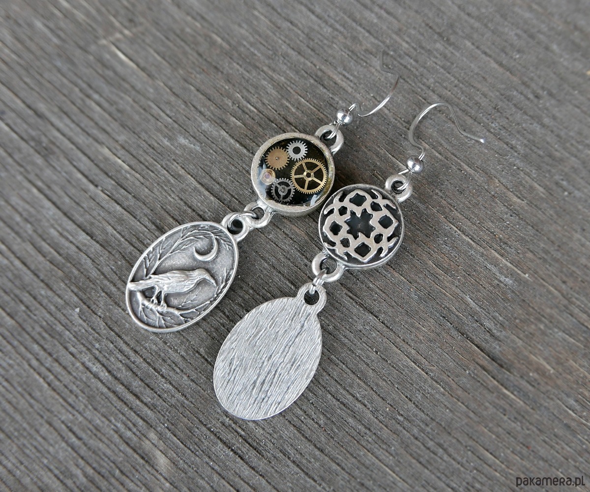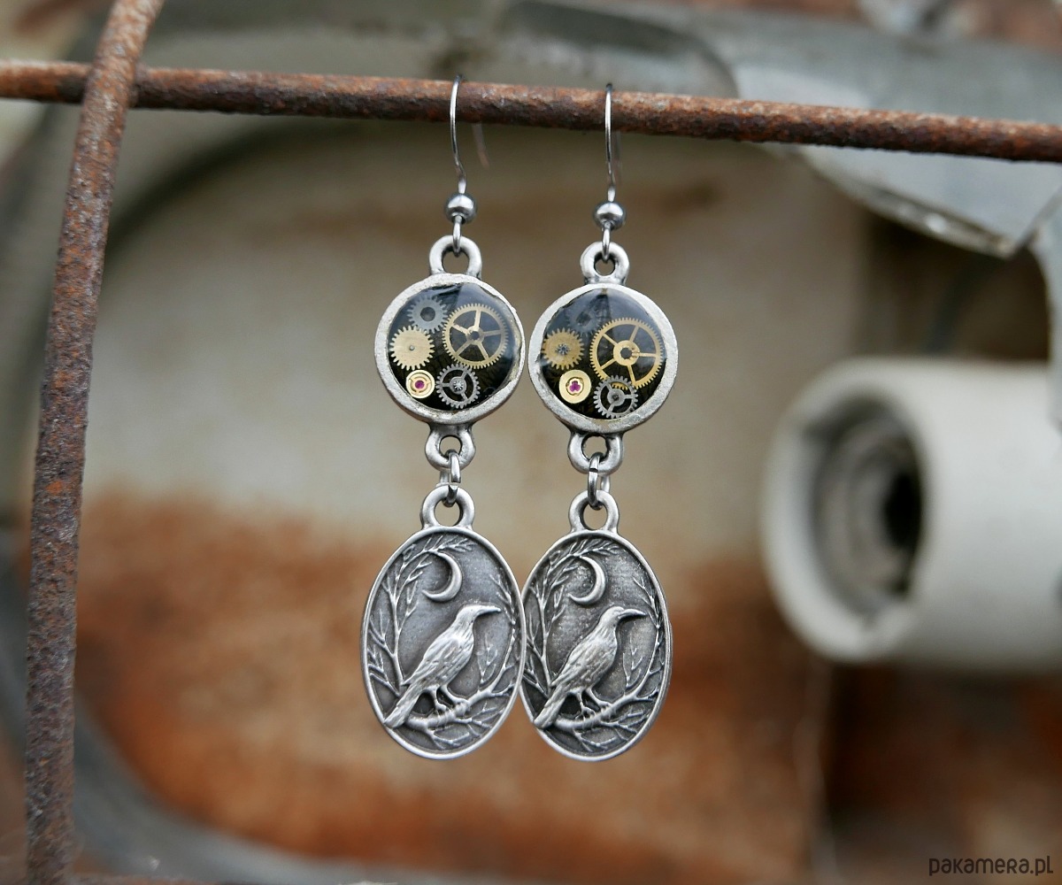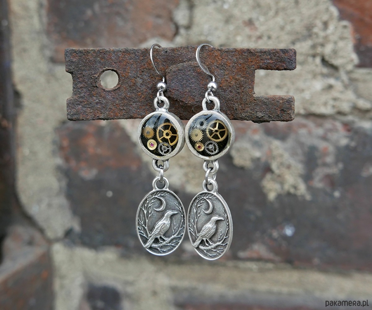 Oryginalne kolczyki w stylu steampunk, łączące w sobie surową mechanikę i subtelną symbolikę natury. Prawdziwe części starych mechanicznych zegarków zatopione w żywicy, tworzące niepowtarzalną, industrialną mozaikę. Dolny element stanowi przepiękne przedstawienie kruka na tle nocnego nieba.