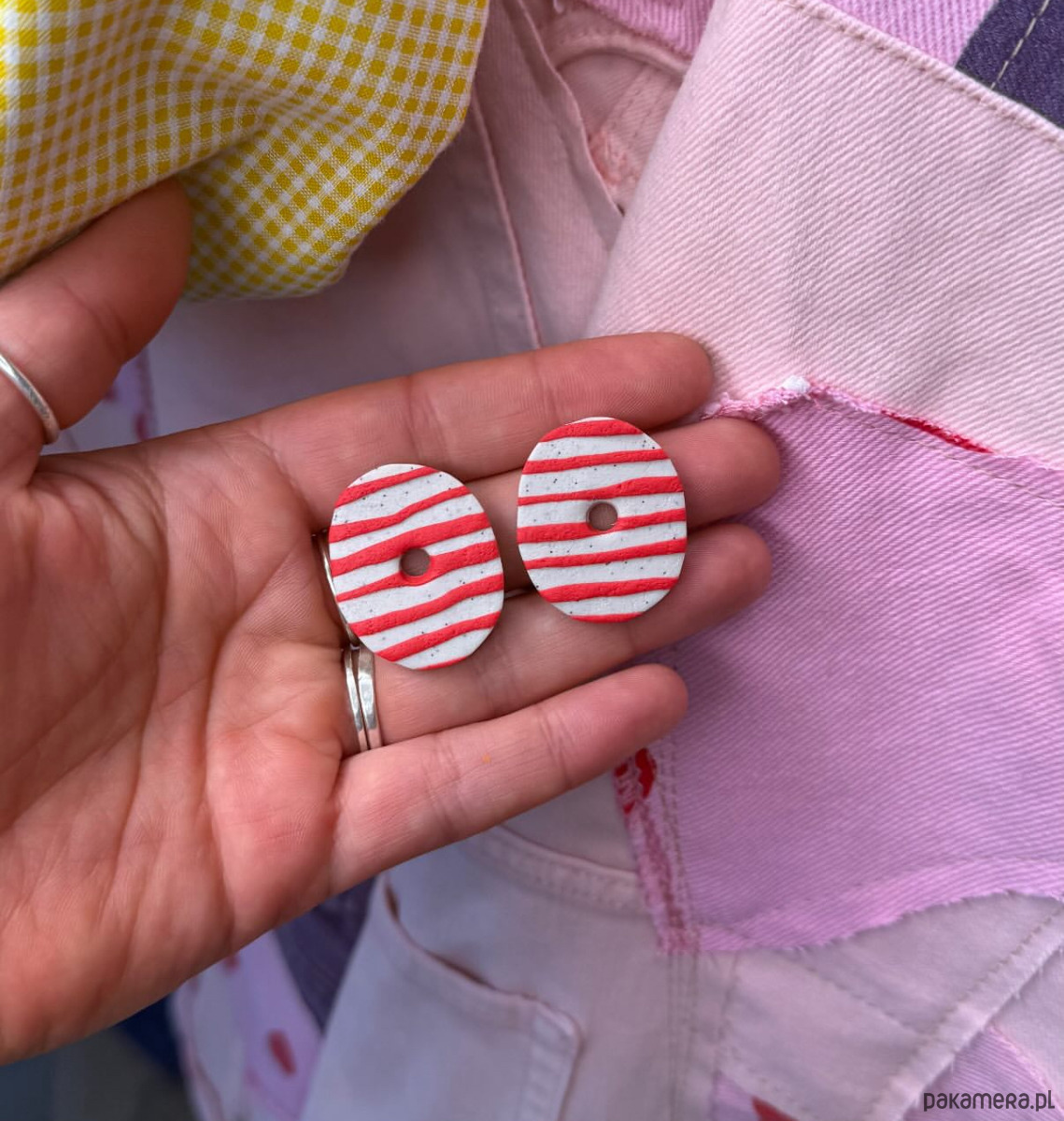 Oryginalne kolczyki wykonane ręcznie z dbałością o szczegóły z profesjonalnej glinki polimerowej, wypalane w piecu i szlifowane w domowej pracowni. Każda para kolczyków jest niepowtarzalna i wyjątkowa. Kolczyki są bardzo lekkie i wygodne, nie obciążają płatka ucha i przyciągają spojrzenia. Zapinane na sztyft ze stali chirurgicznej.