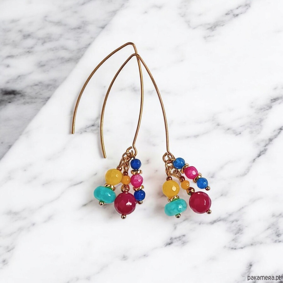 Niebanalne kolczyki wykonane z agatu i jadeitu w soczystych odcieniach (wielkość 8, 4 i 3mm); przekładki wykonane ze złotego hematytu.