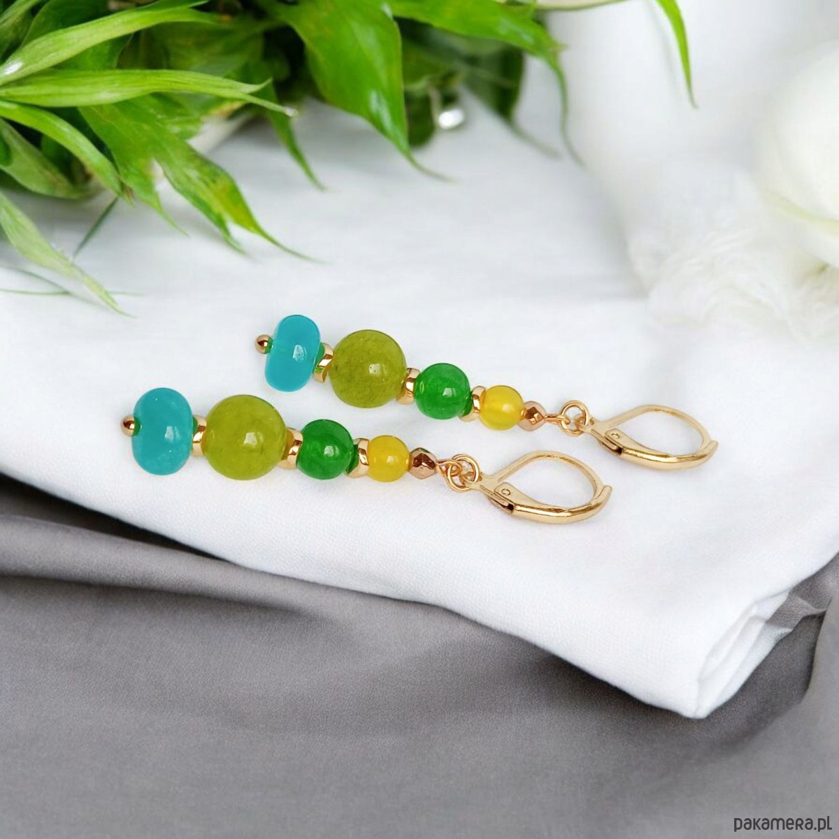 niebanalne kolczyki wykonane z jadeitu w soczystych odcieniach (wielkość 8, 6 i 4mm); przekładki wykonane ze złotego hematytu.