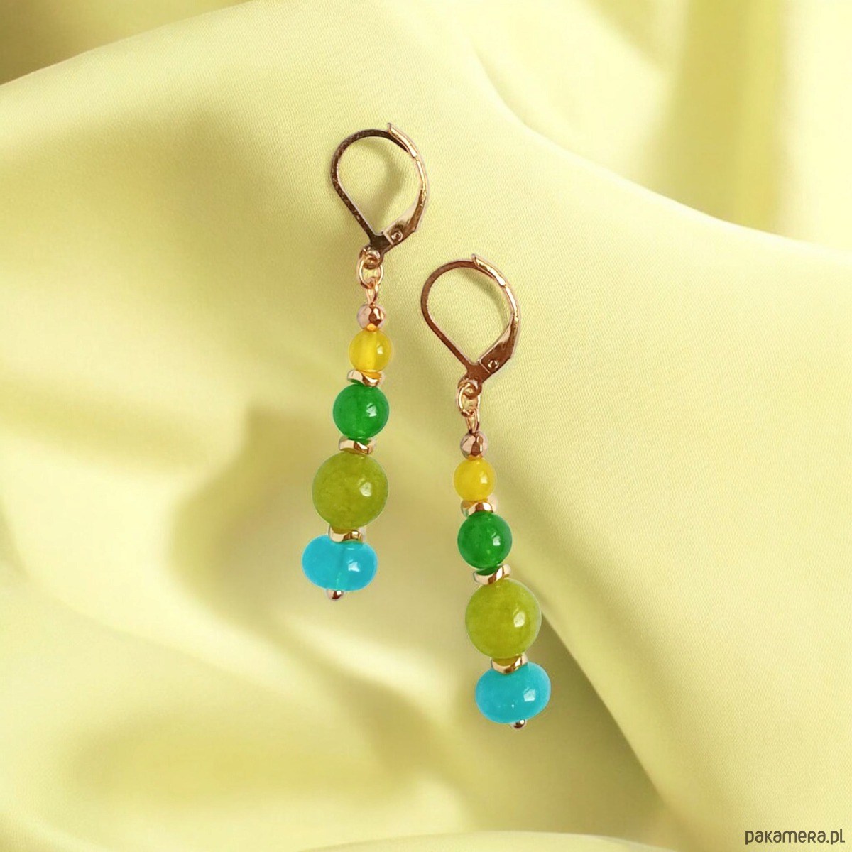 niebanalne kolczyki wykonane z jadeitu w soczystych odcieniach (wielkość 8, 6 i 4mm); przekładki wykonane ze złotego hematytu.