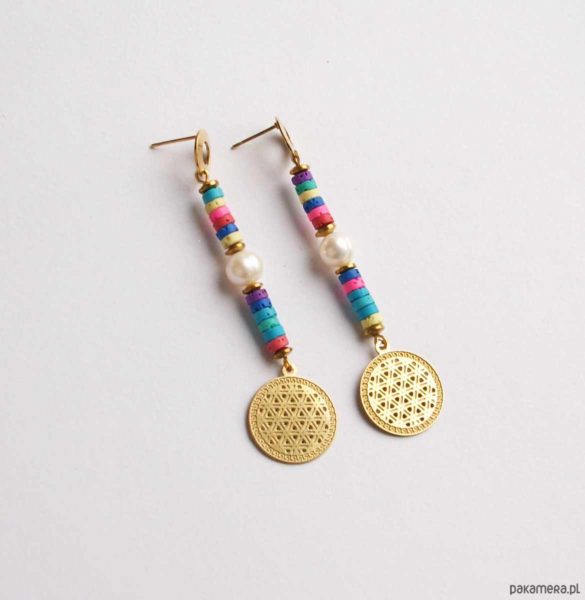 niebanalne kolczyki wykonane z kolorowej, porowatej lawy (plasterki 6mm) z dodatkiem lekko nieregularnych pereł naturalnych, słodkowodnych w klasycznym odcieniu złamanej bieli. wielkość pereł: ok. 7mm. przekładki wykonane ze złotego hematytu.
