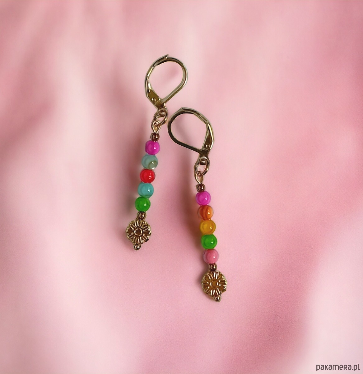 Kolczyki wykonane z kolorowej muszli (kuleczki 4mm), przekładek - kwiatuszków ze złotego hematytu, kuleczek hematytu 2mm.