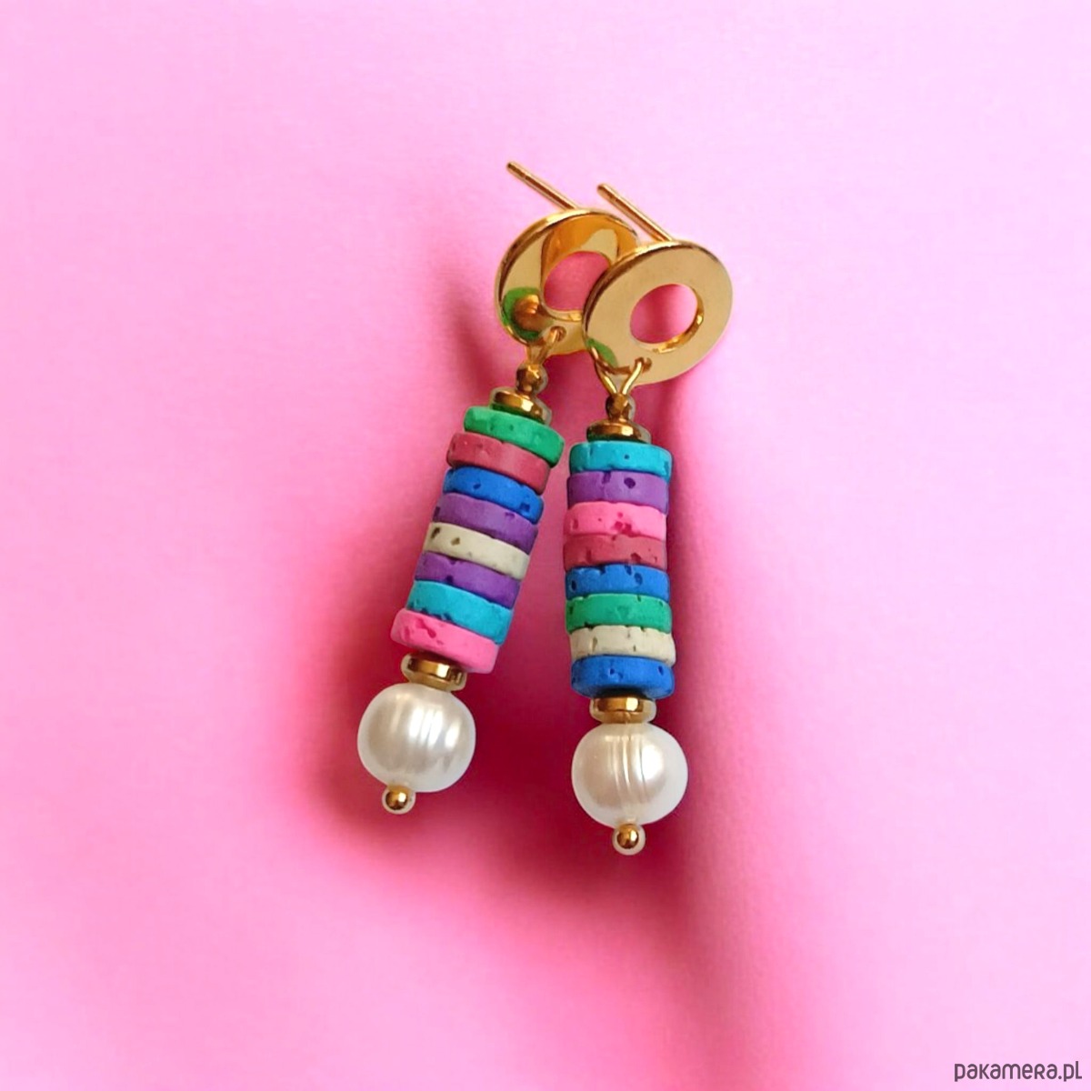 niebanalne kolczyki wykonane z kolorowej, porowatej lawy (plasterki 6mm) z dodatkiem lekko nieregularnych pereł naturalnych, słodkowodnych w klasycznym odcieniu złamanej bieli. wielkość pereł: ok. 7mm. przekładki wykonane ze złotego hematytu.
