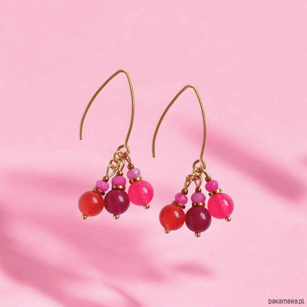 Niebanalne kolczyki wykonane z jadeitu w soczystych odcieniach (kule wielkości 8mm i fasetowane oponki 4mm); przekładki wykonane ze złotego hematytu.