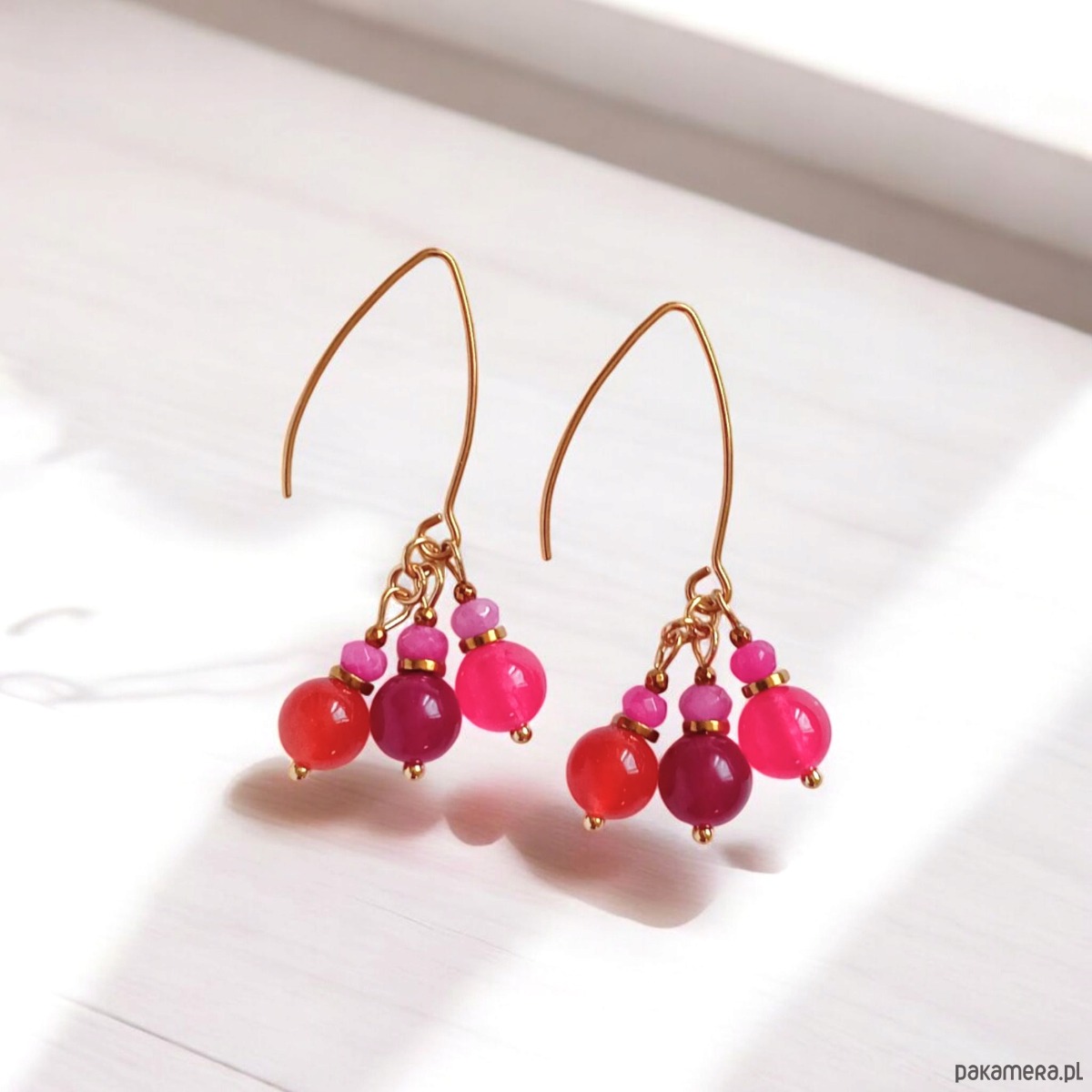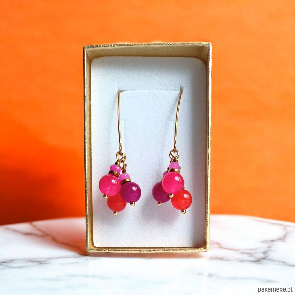 Niebanalne kolczyki wykonane z jadeitu w soczystych odcieniach (kule wielkości 8mm i fasetowane oponki 4mm); przekładki wykonane ze złotego hematytu.