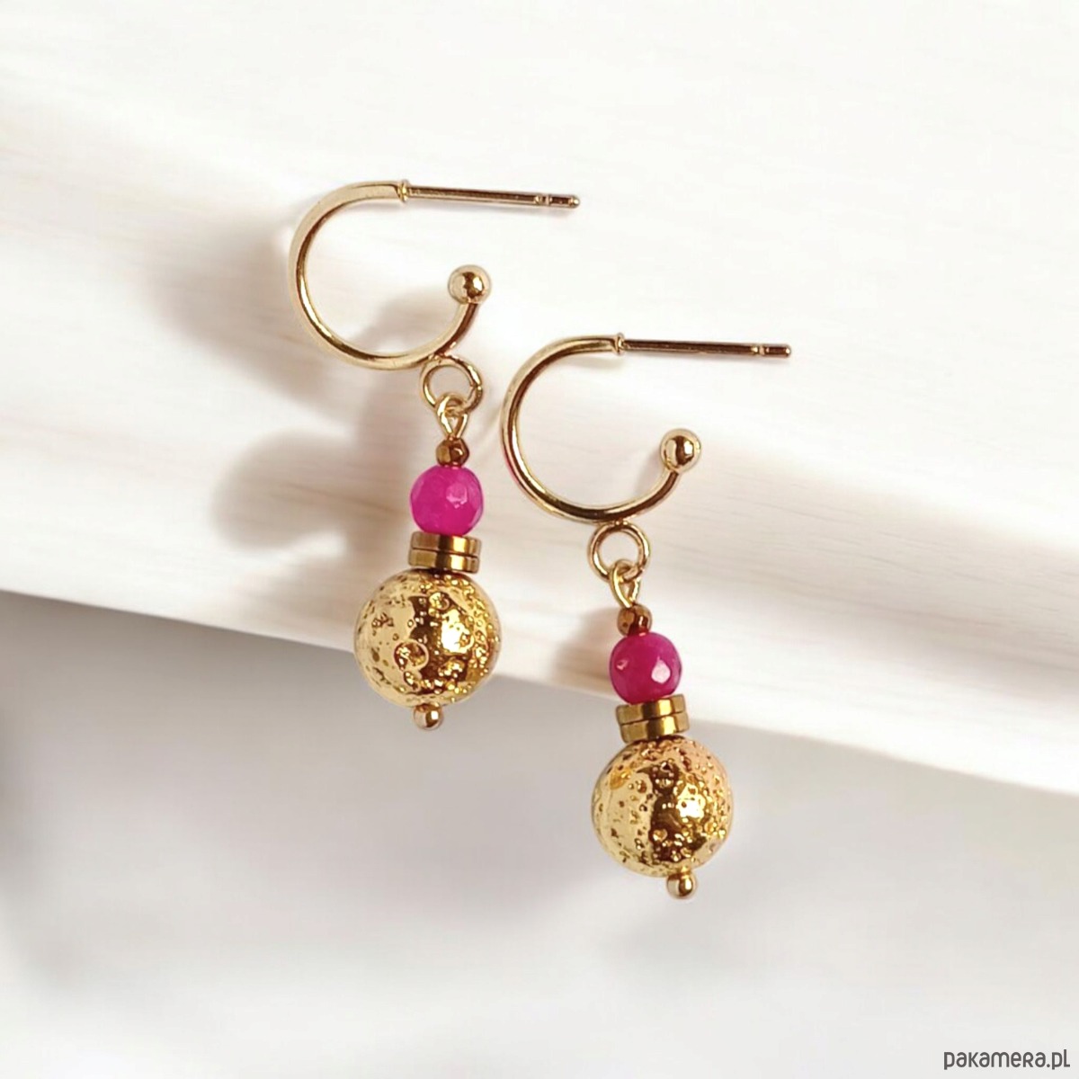 niebanalne kolczyki wykonane ze złotej, porowatej lawy (ok. 8mm) z dodatkiem fasetowanego agatu w kolorze intensywnej fuksji. przekładki wykonane ze złotego hematytu.